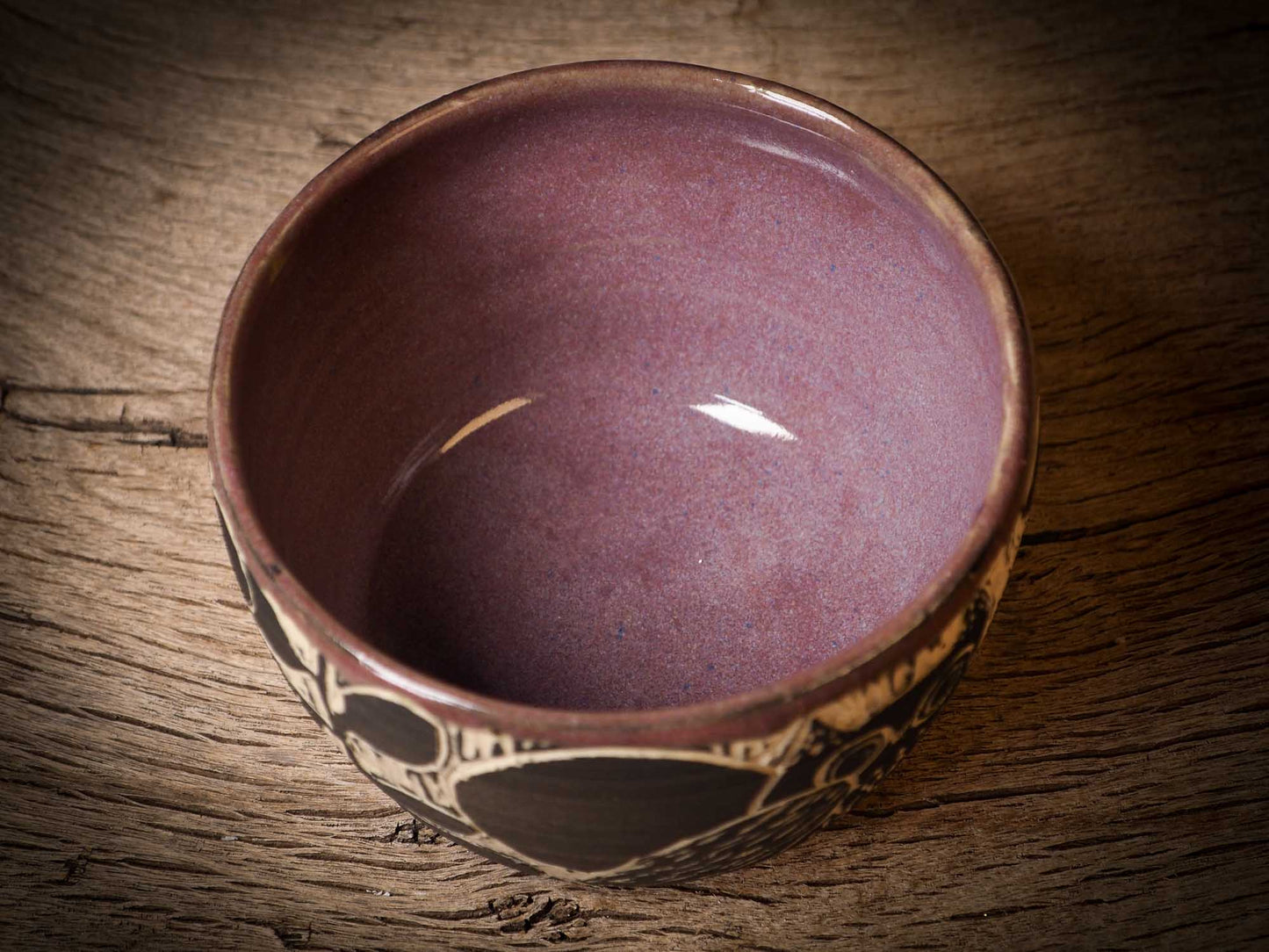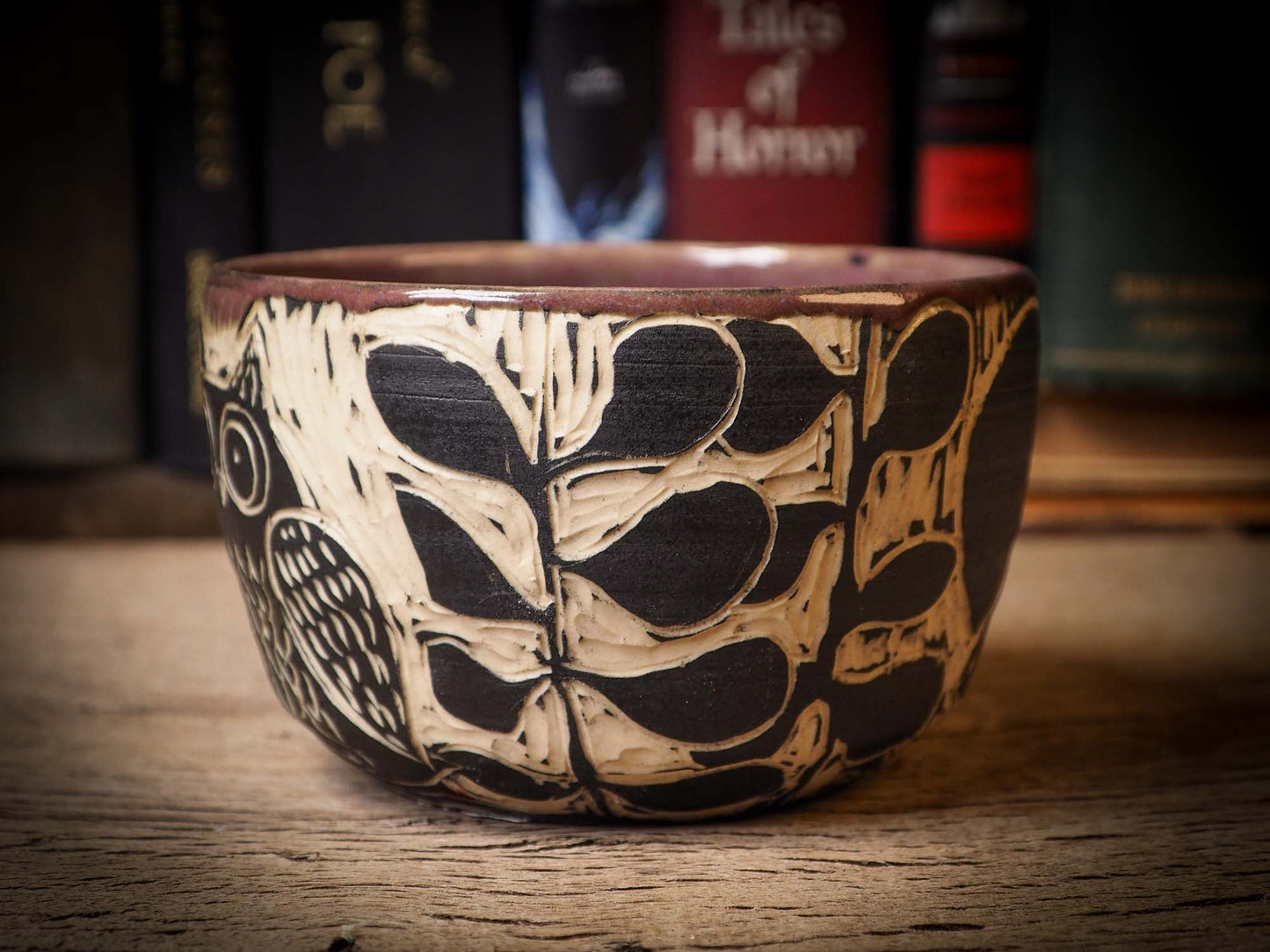It measures 2 1/2 x 4 x 4 Inches, made with wheel thrown clay, hand carved and glazed by me with a dark, gooey glaze on the outside as well as the inside. The carved figures give it a nice, folk art primitive feel to it.