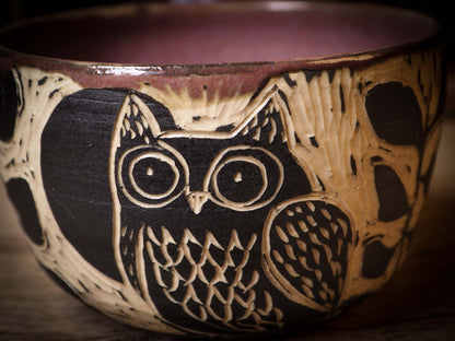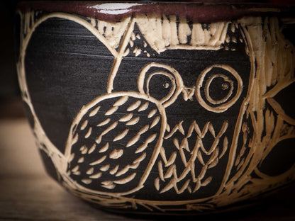This big pot is great to store a small stash of Halloween candy, to give or to enjoy at any time. It features a set of beautiful carved night owls tat will keep you company on a great Halloween night.