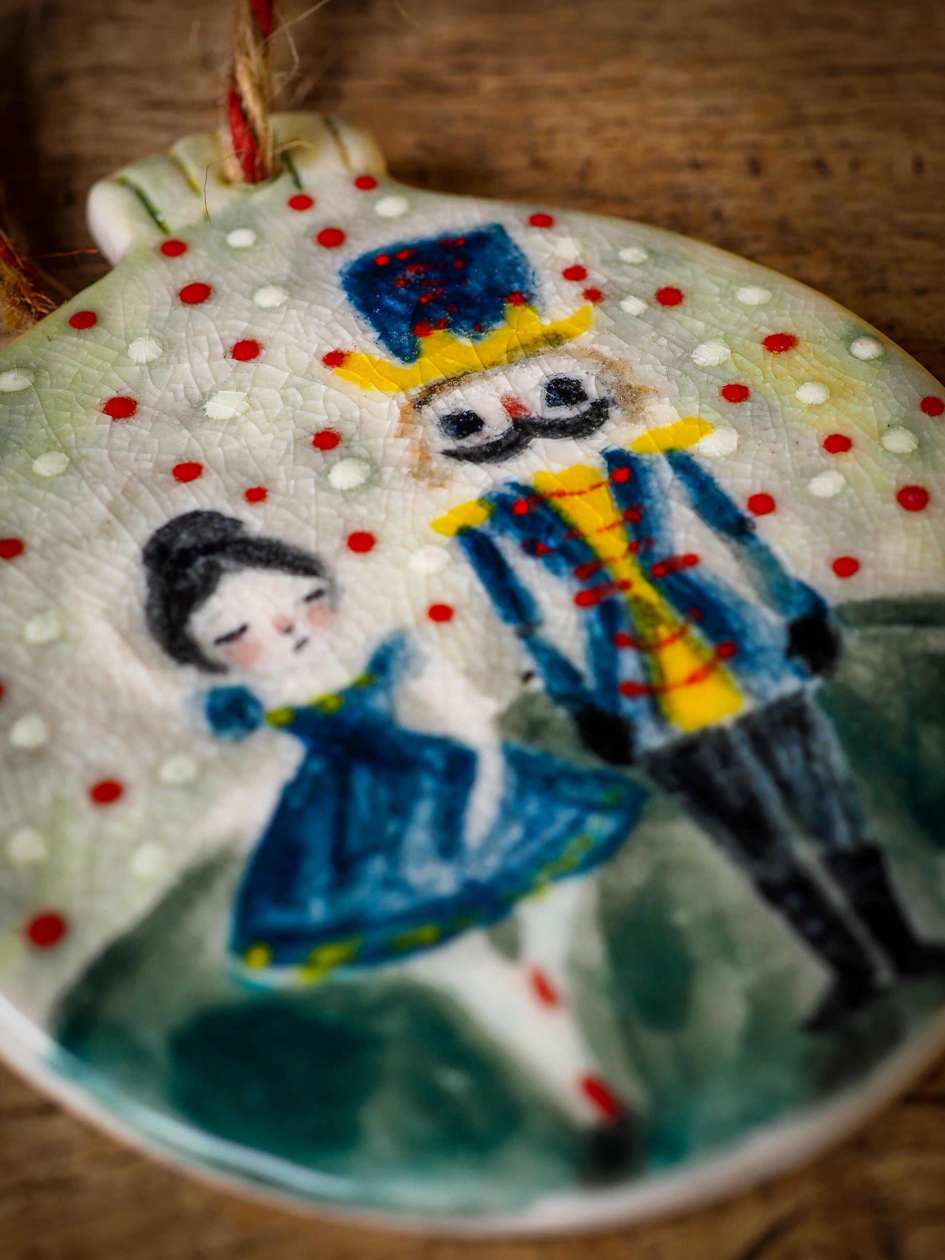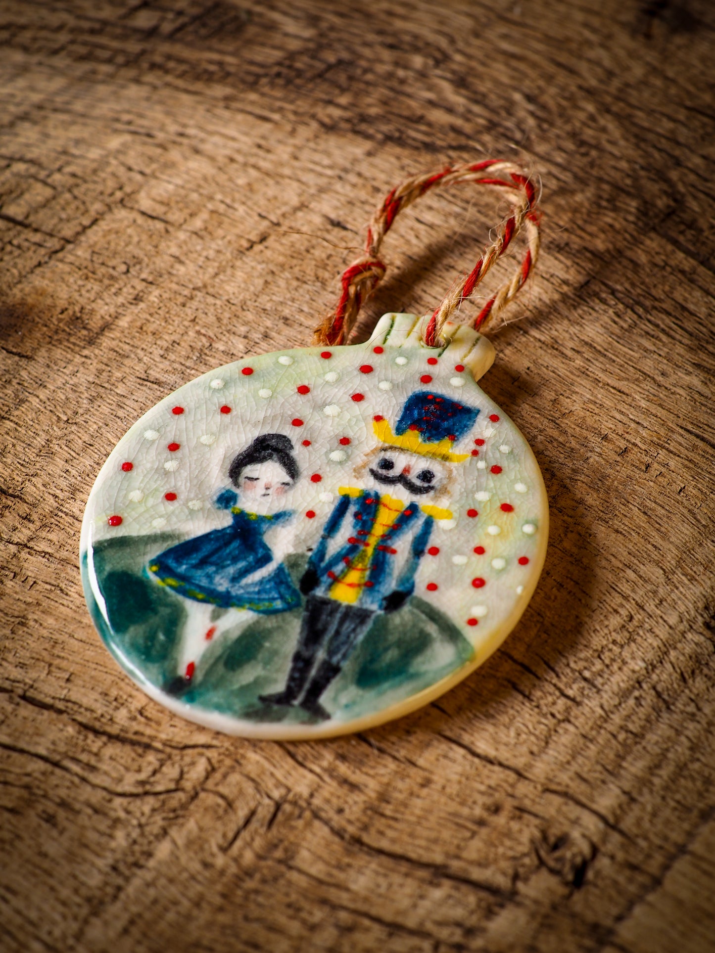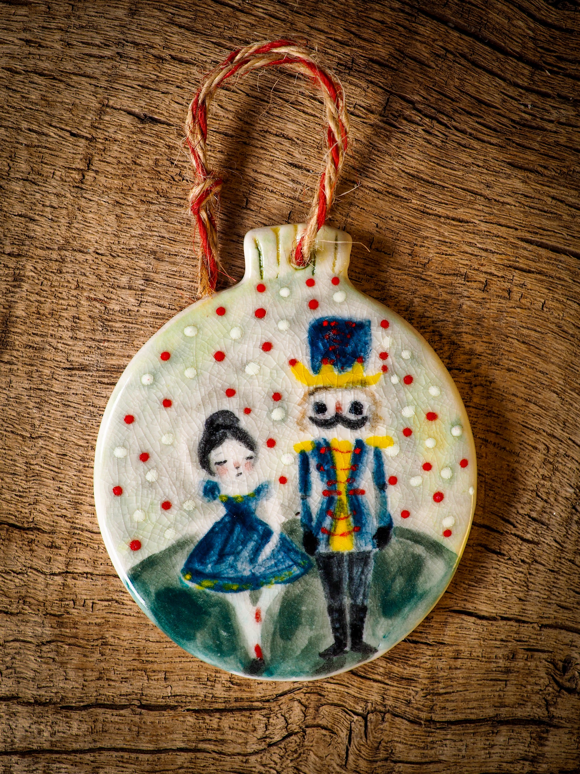 Totally hand made on my studio, each of my ornaments is hand painted, fired twice on a kiln at more than 2000 Degrees, then finished with a beautiful twine hanger.