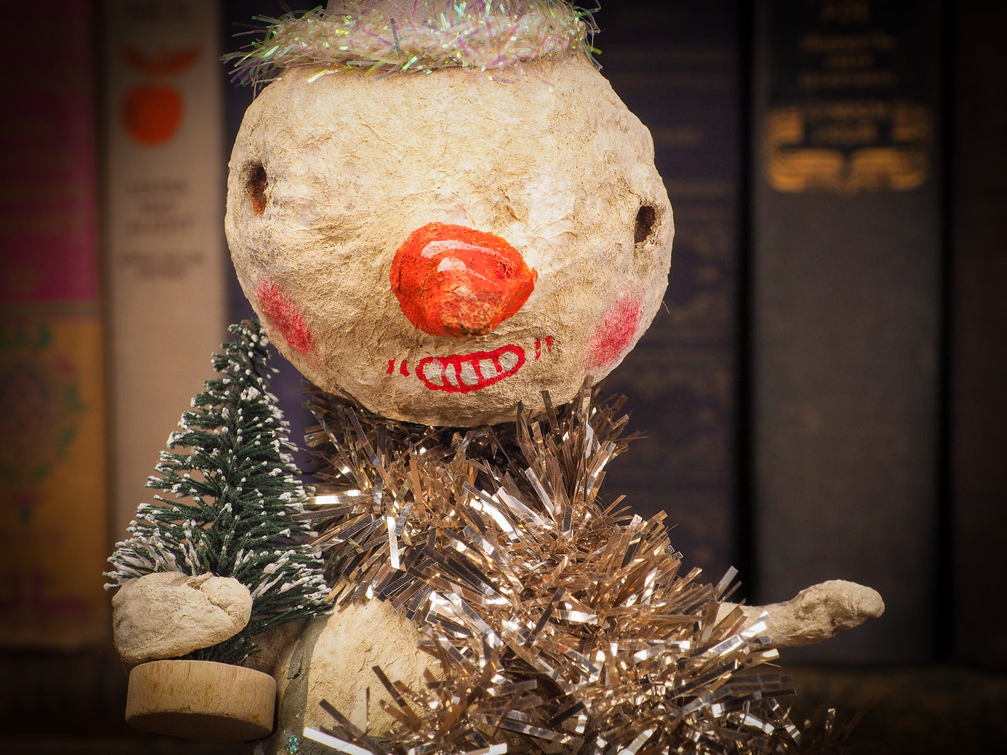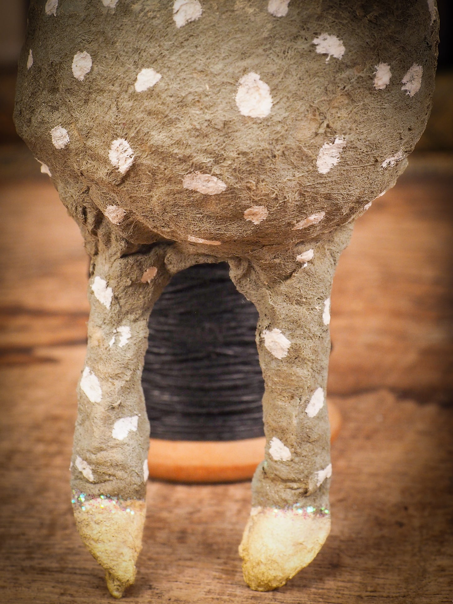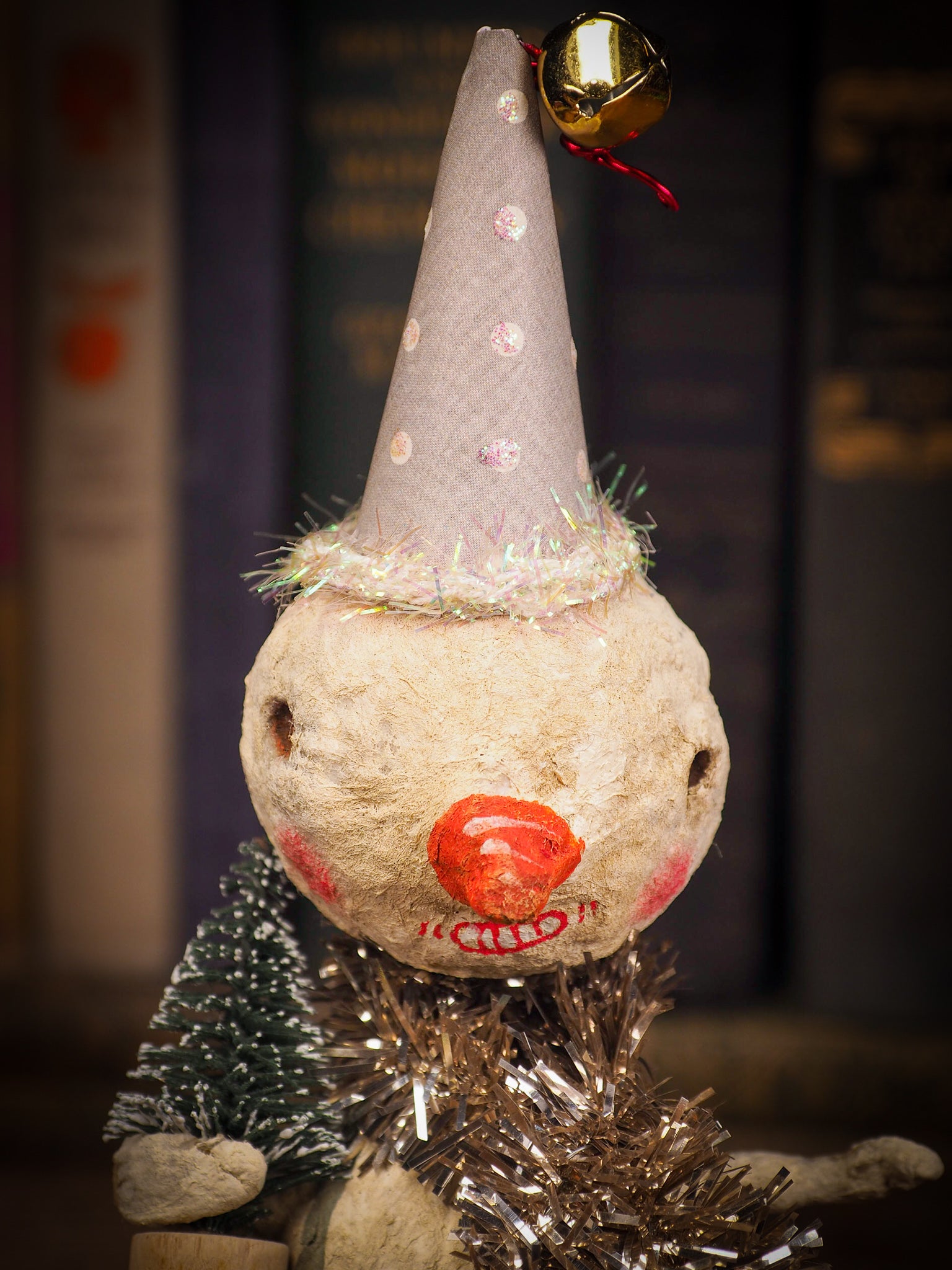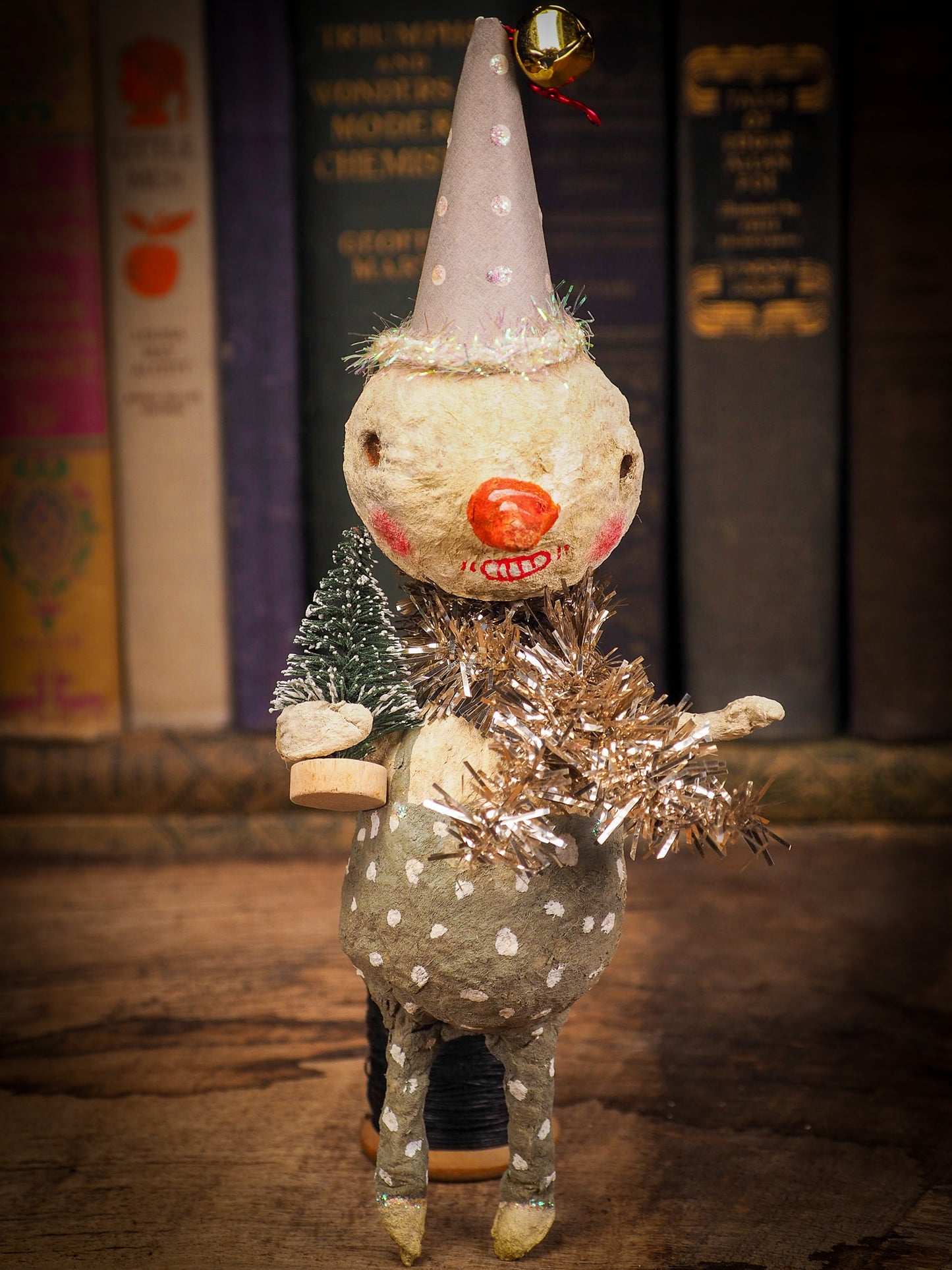 Hand painted by the artist, this holiday figurine is sporting a beautiful hand made paper hat with tinsel and vintage style garlands and a tiny Christmas tree to keep the festive spirit going!