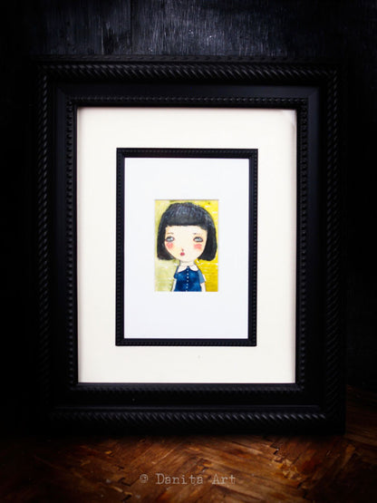 This painting measures 2.5 x 3.5 inches, and arrives protected by a hard plastic protector that you can use to display it, or you can remove it to mount and frame it. Either way, it will look really beautiful anywhere you place it.
