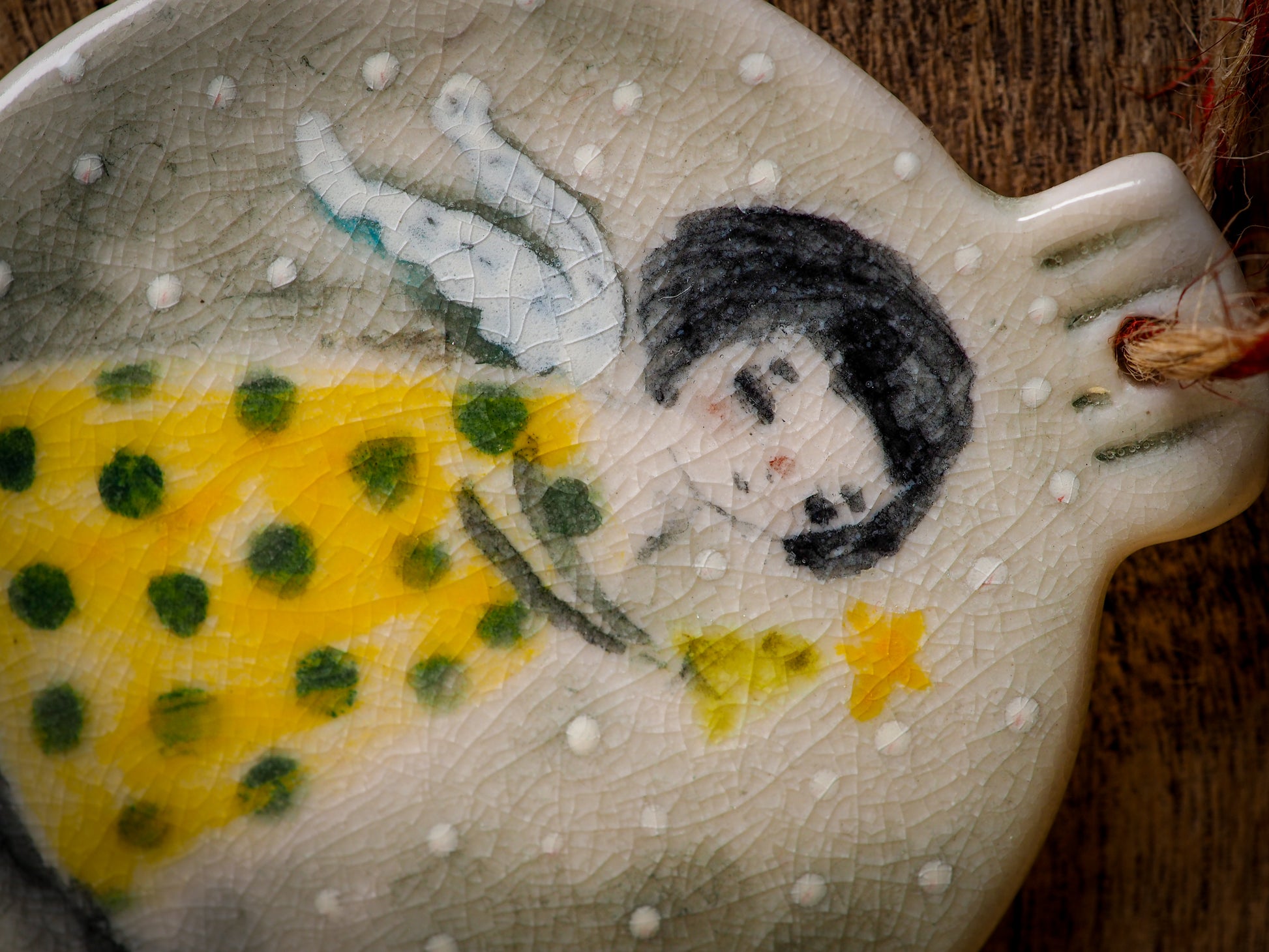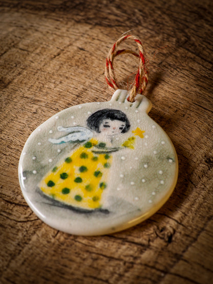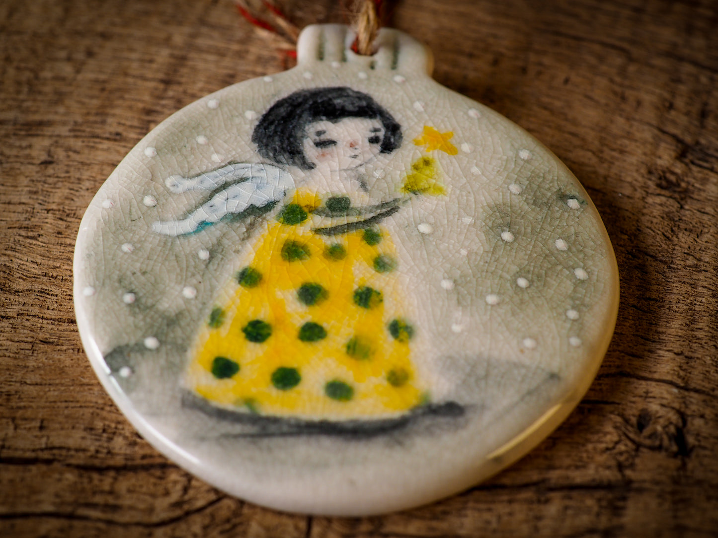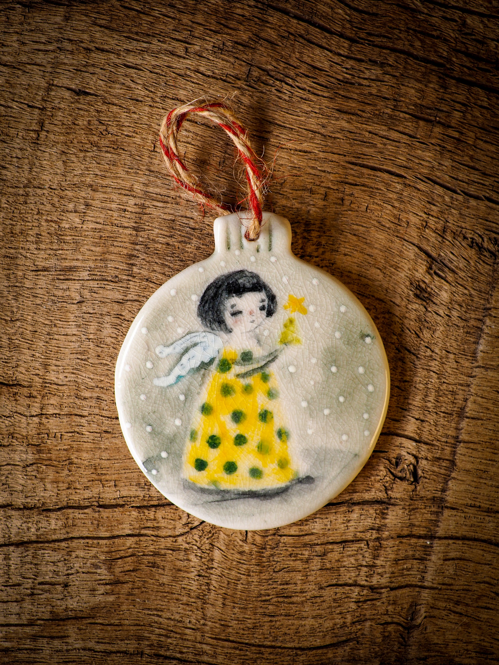 Totally hand made on my studio, each of my ornaments is hand painted, fired twice on a kiln at more than 2000 Degrees, then finished with a beautiful twine hanger.