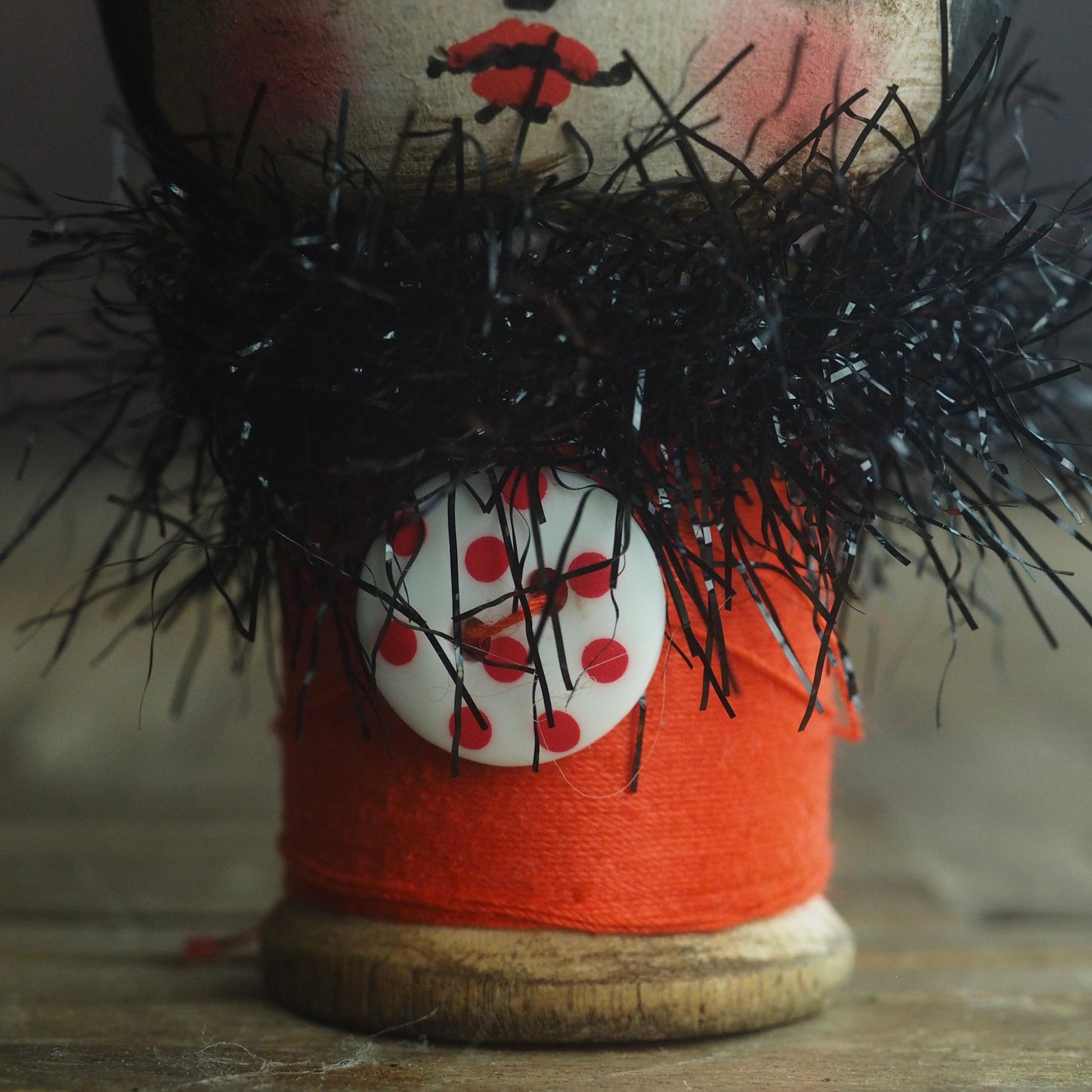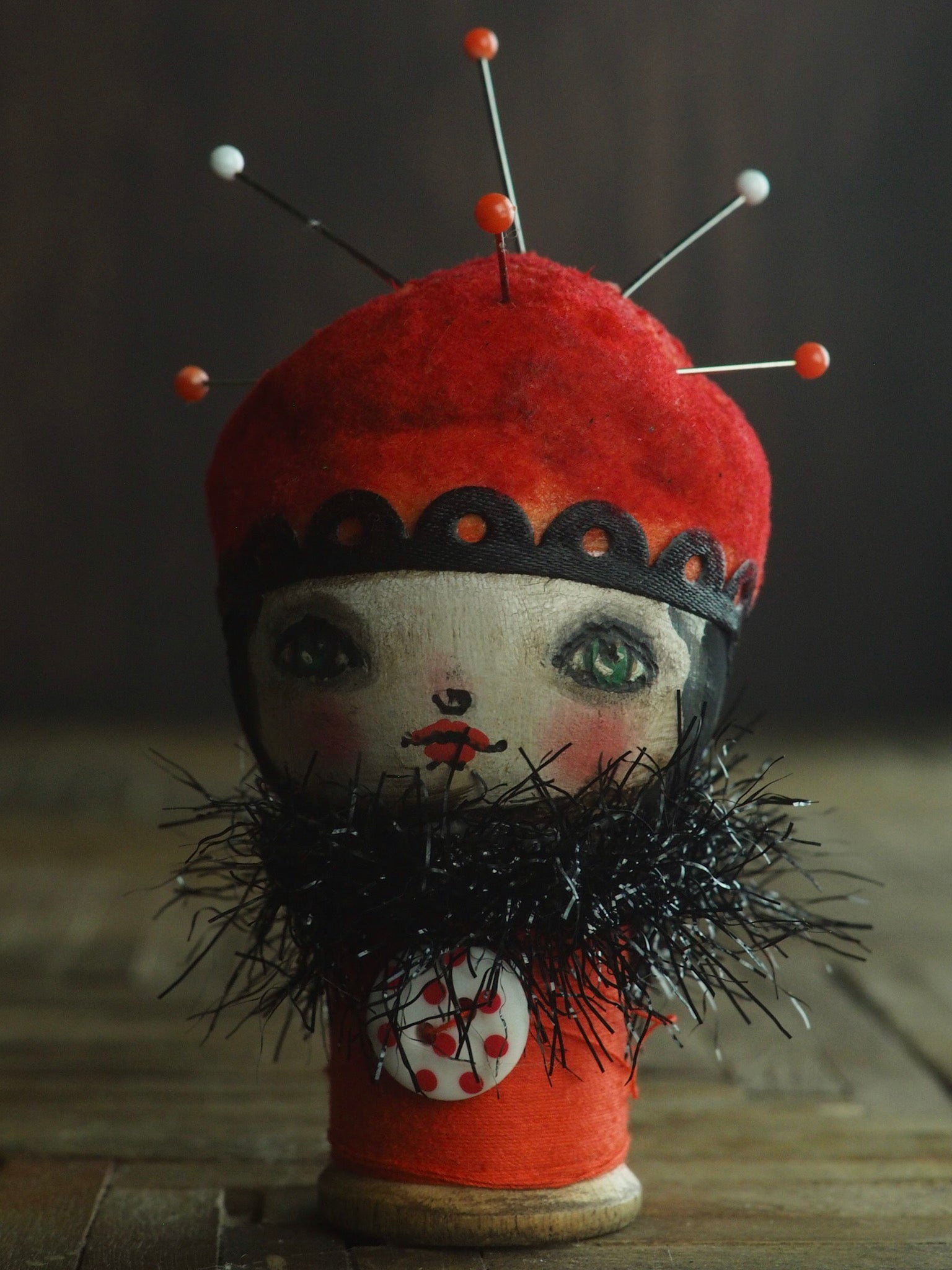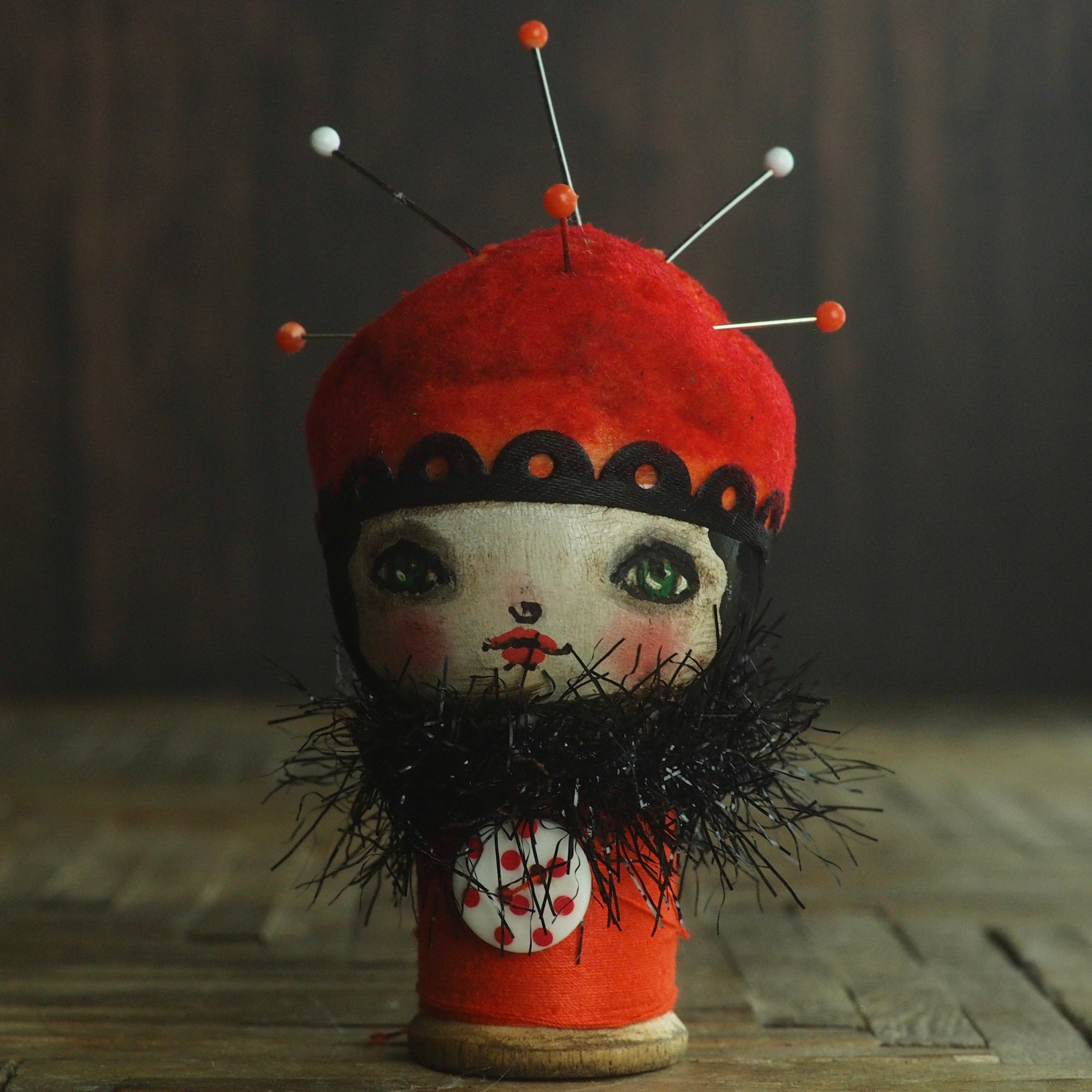 Each of the pincushion girl dolls is hand made by me, Danita. They are vintage thread spools with paper clay and spun cotton heads attached to them. Each one has her face painted with my recognizable melancholic eyes and mysterious smiles.