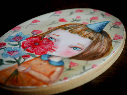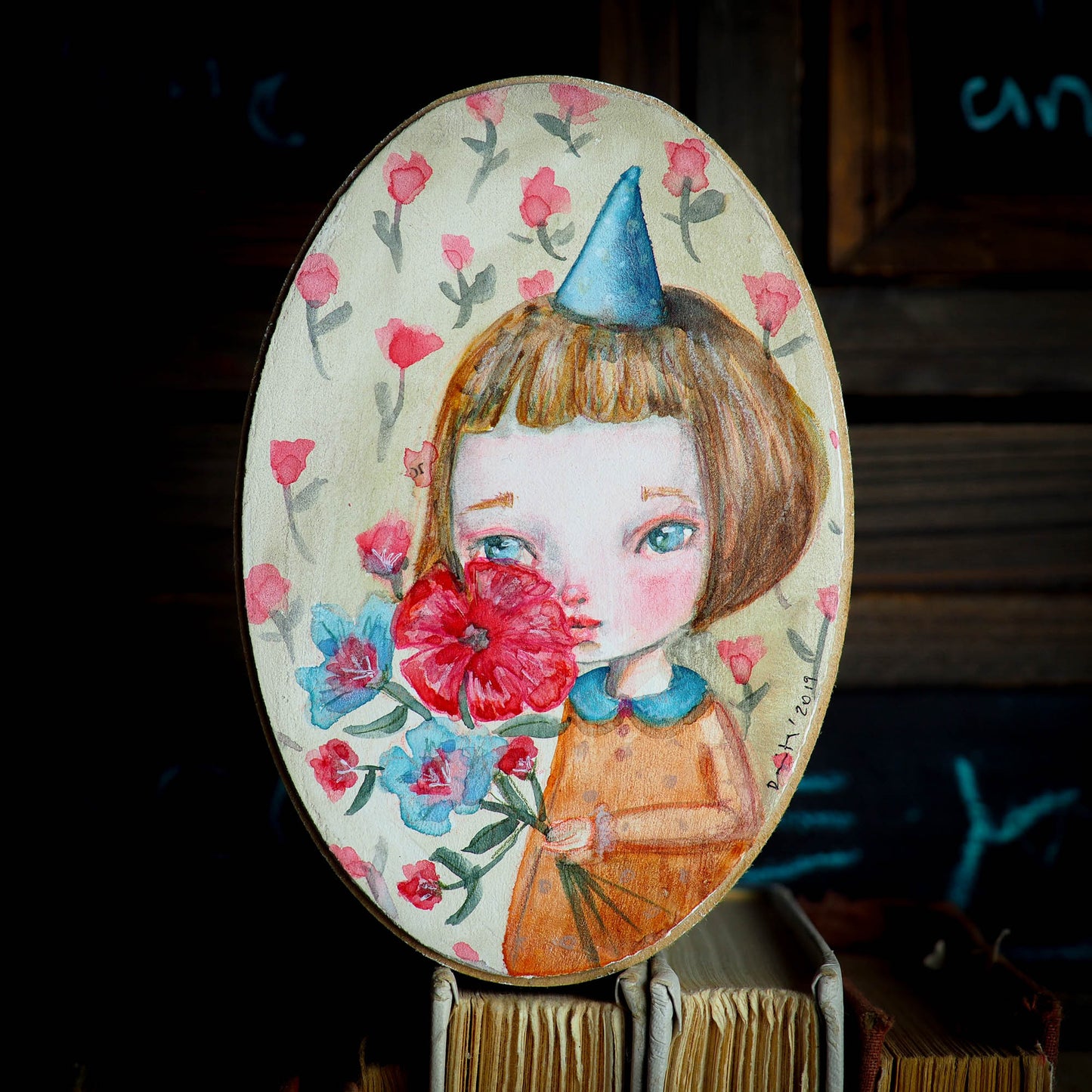 This painting is part of a series I made with things I like. You can see my emotions on her eyes, with lots of happiness and a little sorrow within, they are just like me.