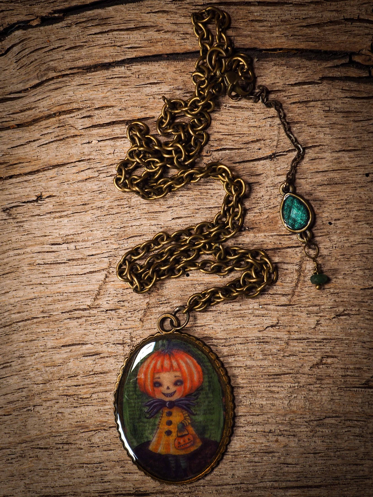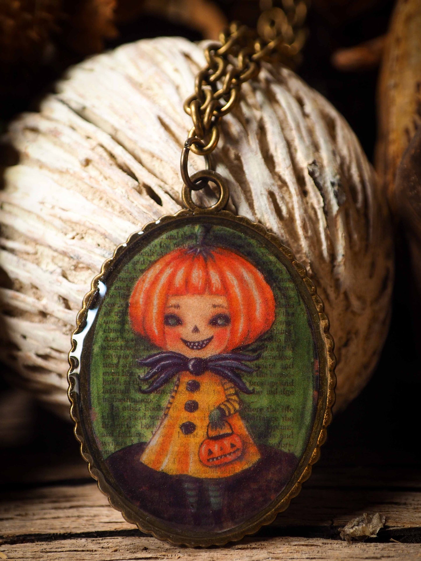 It has a reproduction of an original halloween illustration by Danita, covered in resin.