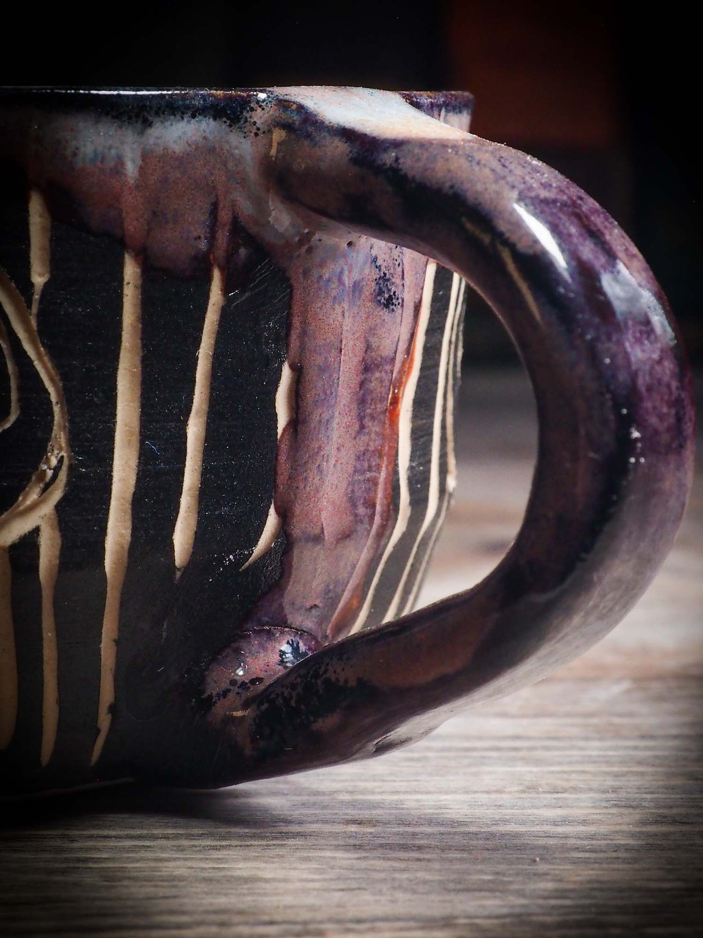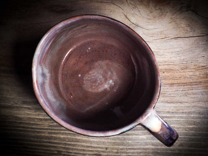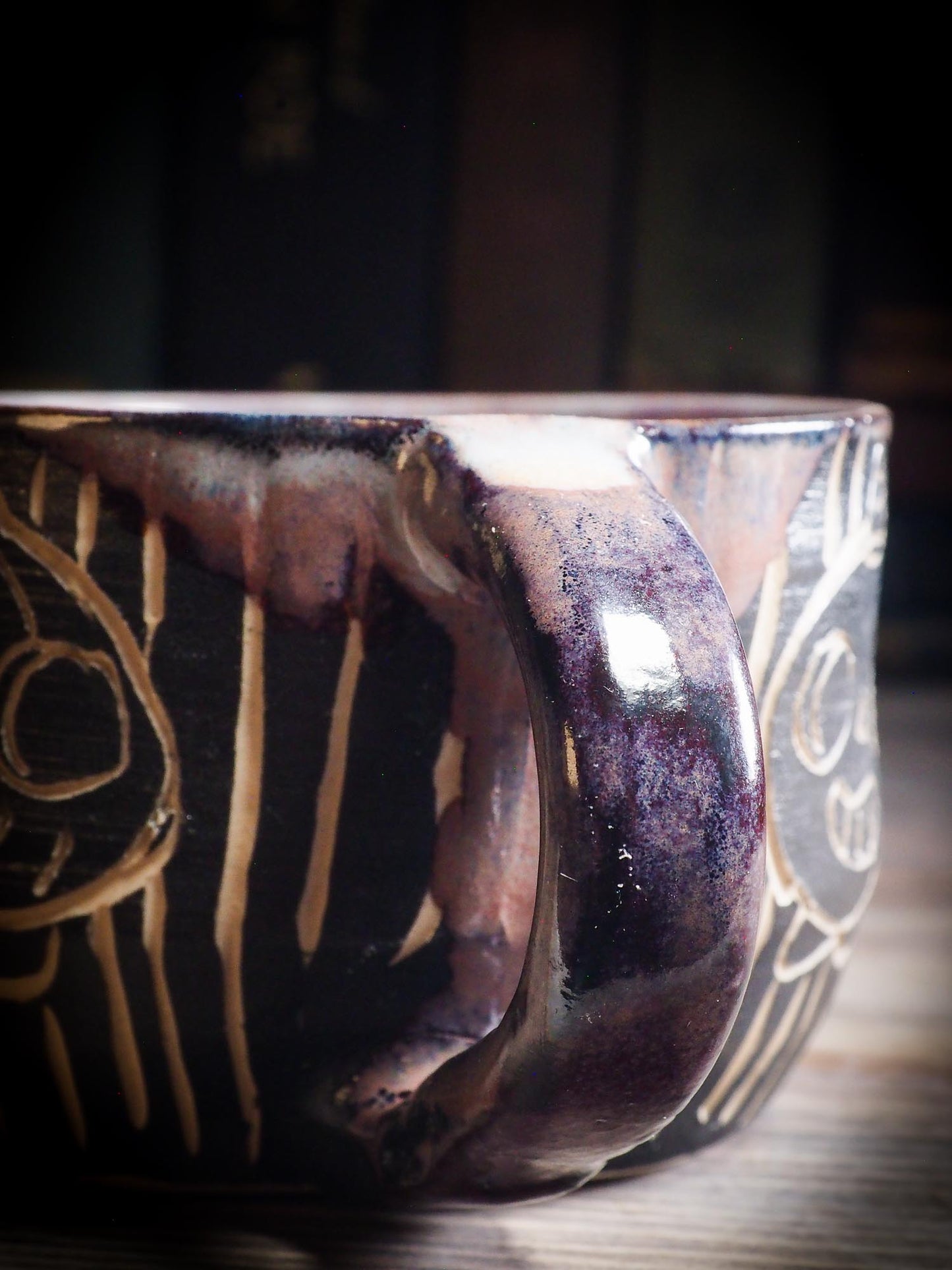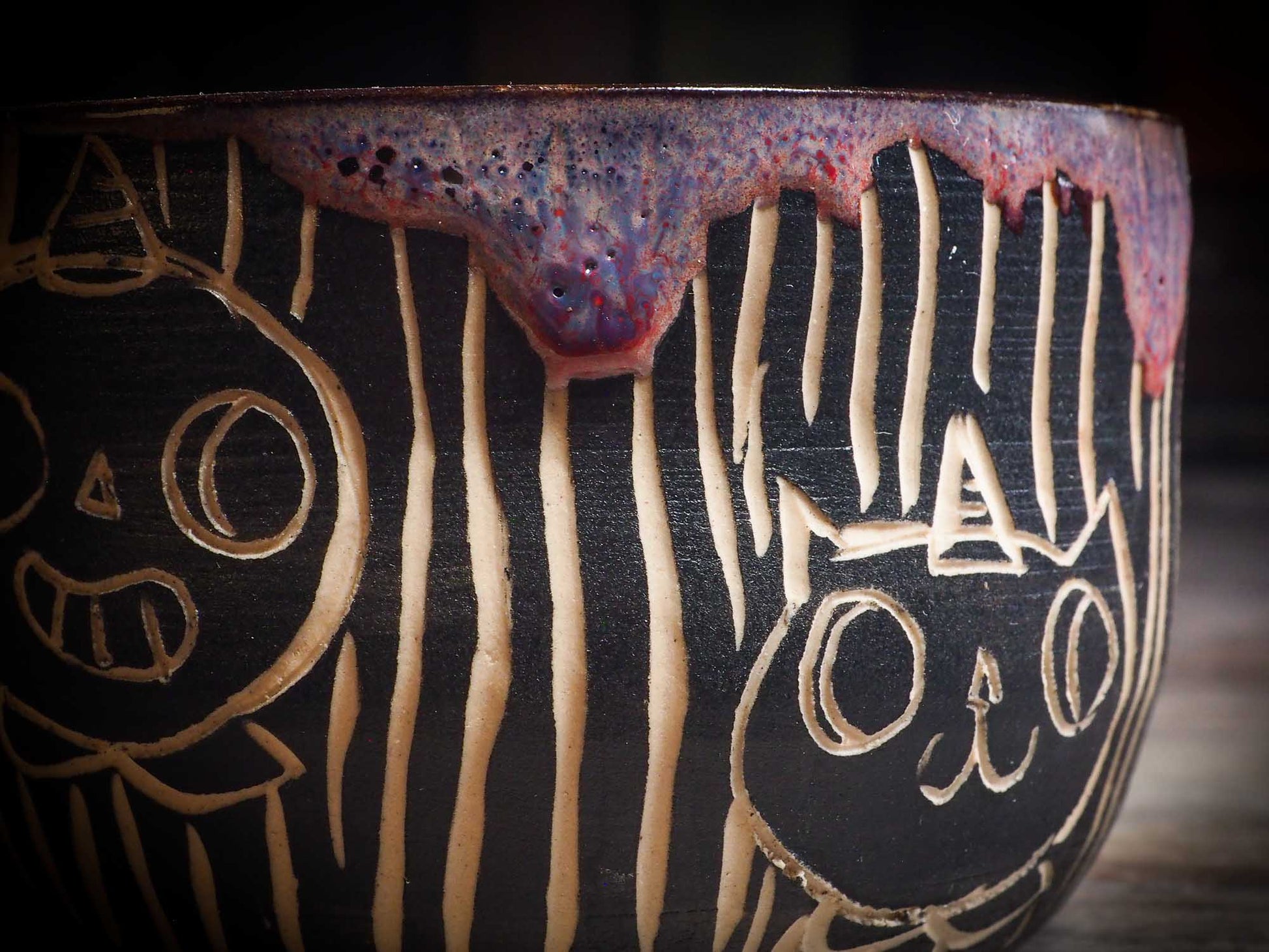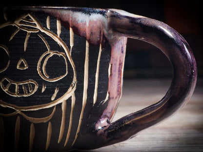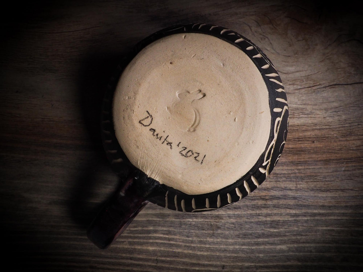 It measures 3 1/2 x 2 1/2 x 2 1/2 Inches, made with wheel thrown clay, hand carved and glazed by me with a dark, gooey glaze on the outside as well as the inside. The carved figures give it a nice, folk art primitive feel to it.