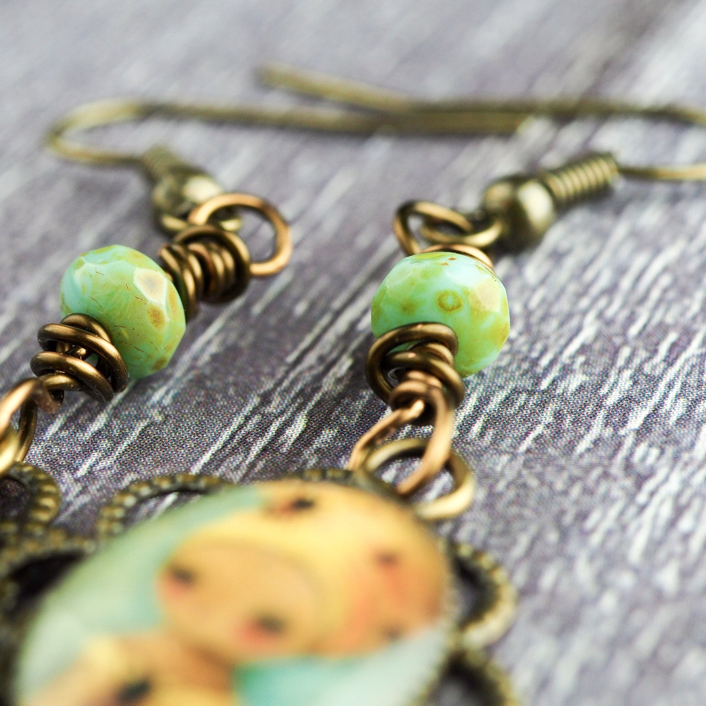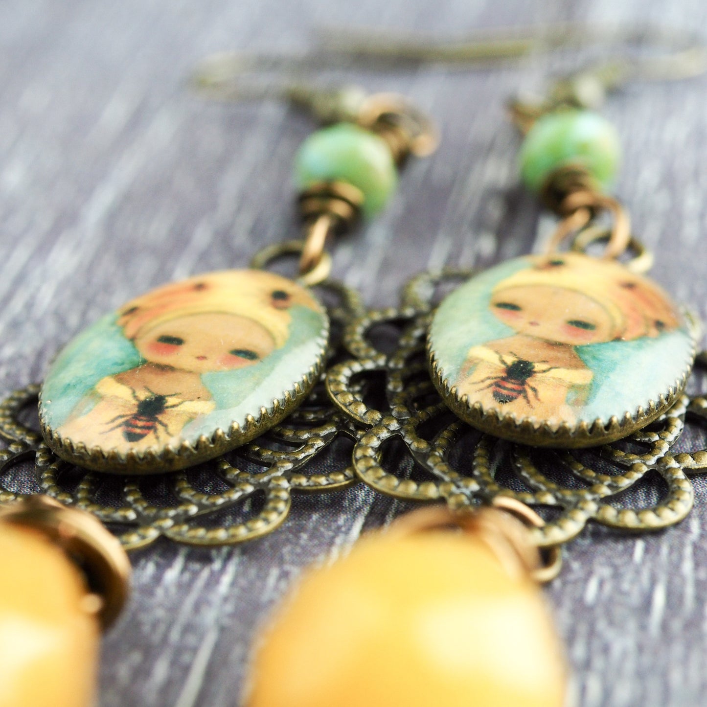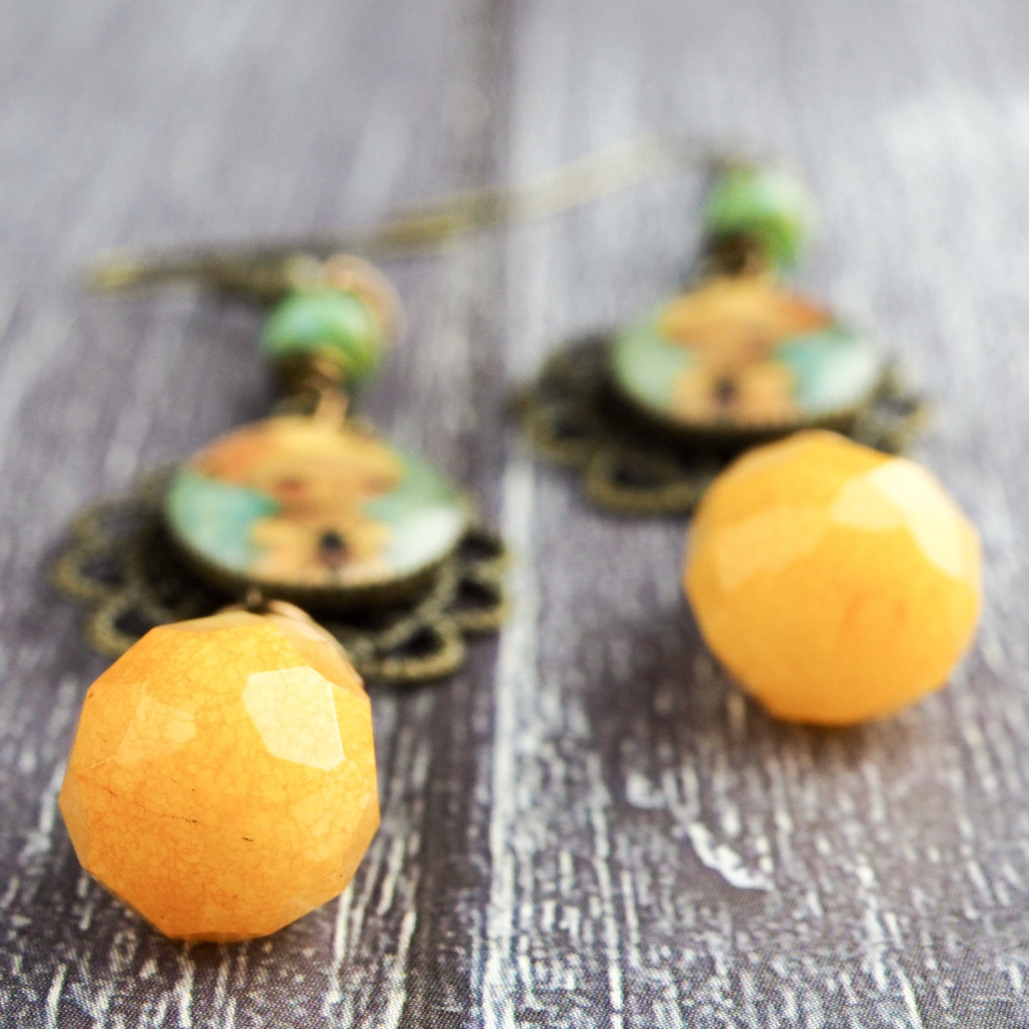I used natural semi-precious stone beads in yellow and green to match the colors in the painting, with wire wrap metal works to embellish the beautiful beads.