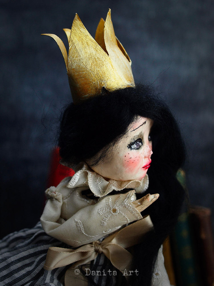 She will rule your heart with her astonishing eyes, her commanding gaze and her royal handmade gown. And just in case her presence is not enough, her paper crown will convince you she truly is the queen of hearts.