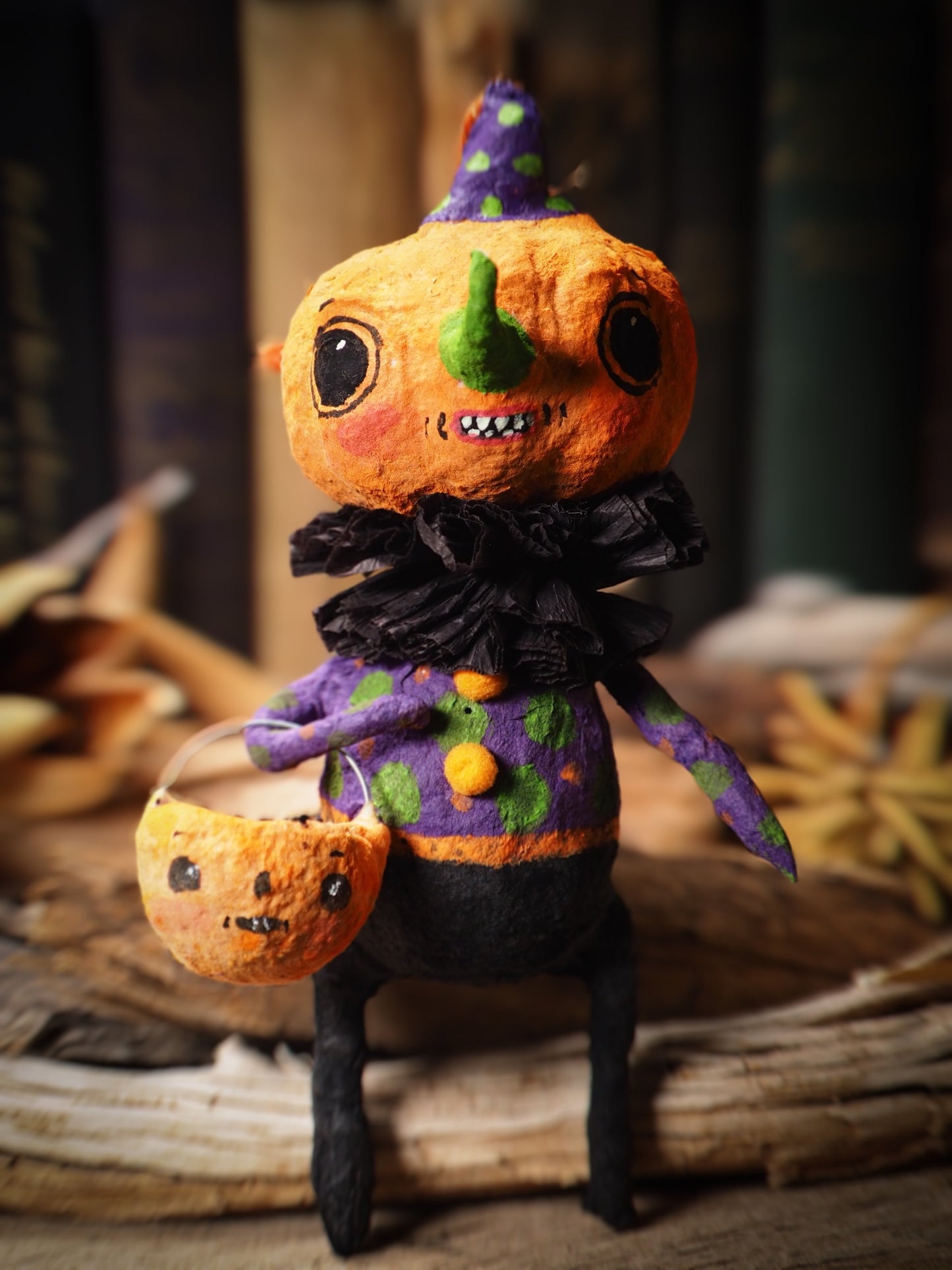 The Halloween art doll has a jack-o-lantern on it's hand and it can be displayed sitting on a shelf, or hanging as an ornament from your Halloween or Christmas tree.