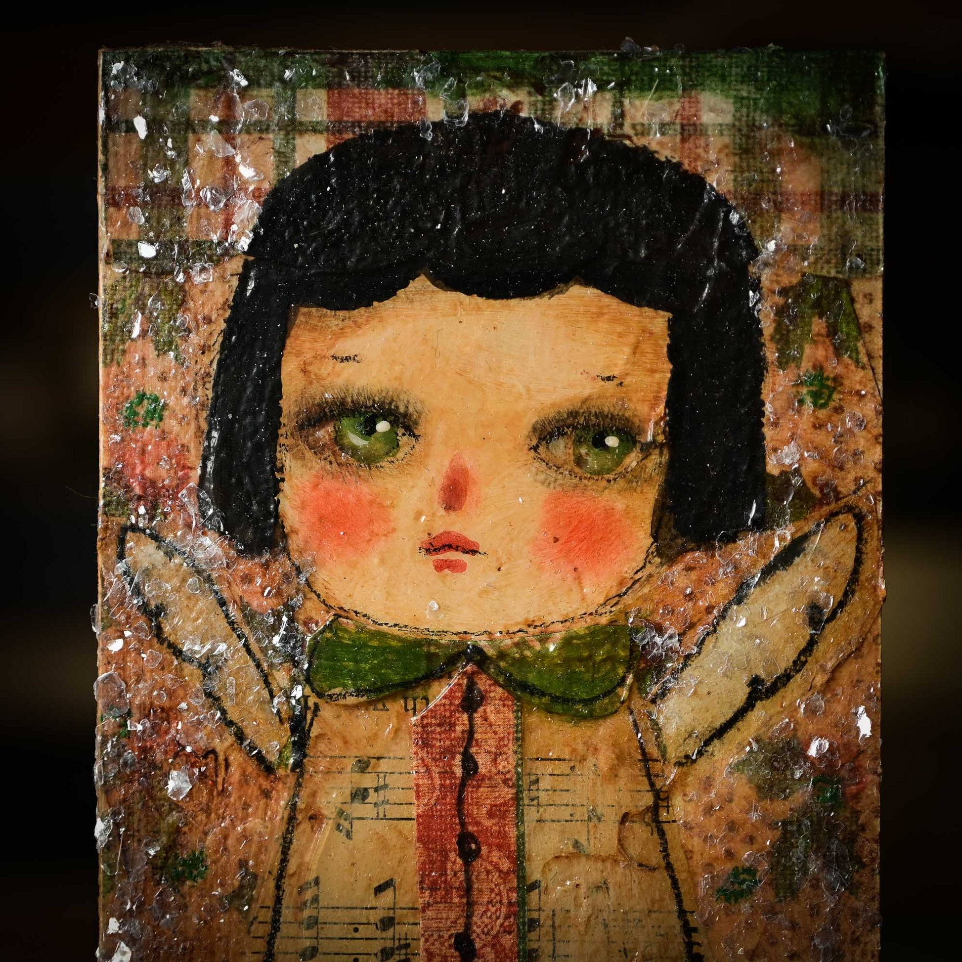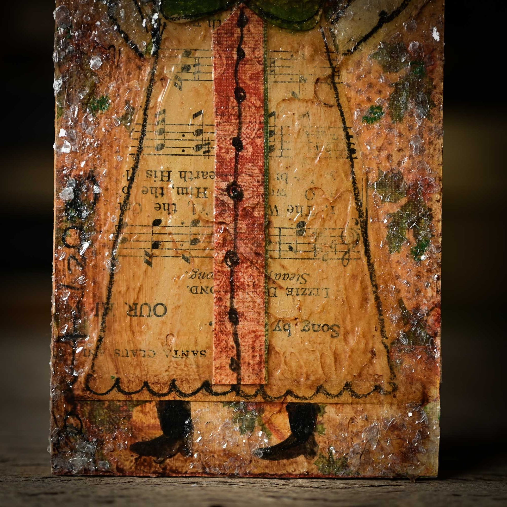 This beautiful painting is made on a wood block using vintage collage papers, acrylics and mica flakes to give it a shiny, sparkling look.