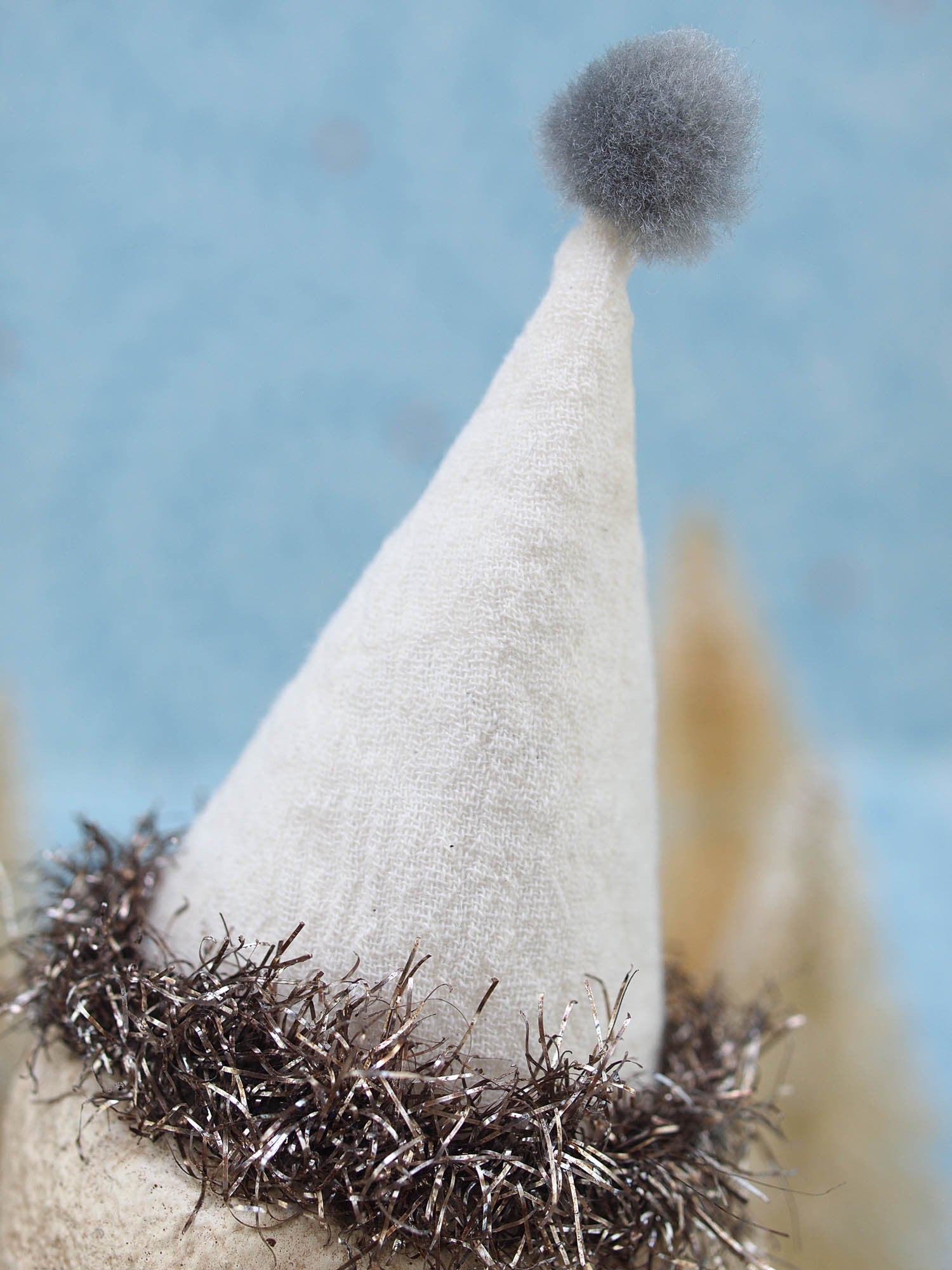 Then I took scrap pieces of fabric from my larger doll doll projects and made a jumpsuit for each. Then I took some fabric and paper and made their hats, accented with vintage style tinsel and a matching pompon on top.