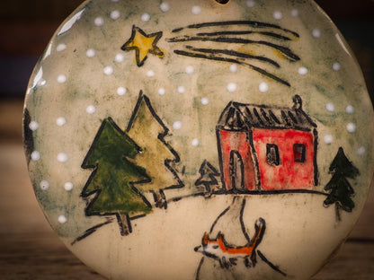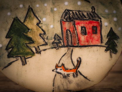 Decorated with an original holiday and winter scene illustration inspired by one of my previous paintings, there are Christmas trees, peppermint cones, scarves, hot cocoa mugs, snowmen, snowball fights, and everything that makes winter cozy. Each ornament is unique and special and cannot be repeated. You are getting a one of a kind ornament to hang on your tree, or use it as one of your favorite home decorations.