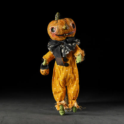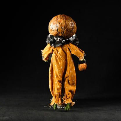 The Halloween art doll has a jack-o-lantern on its hand and it can be displayed sitting on a shelf, or hanging as an ornament from your Halloween or Christmas tree.