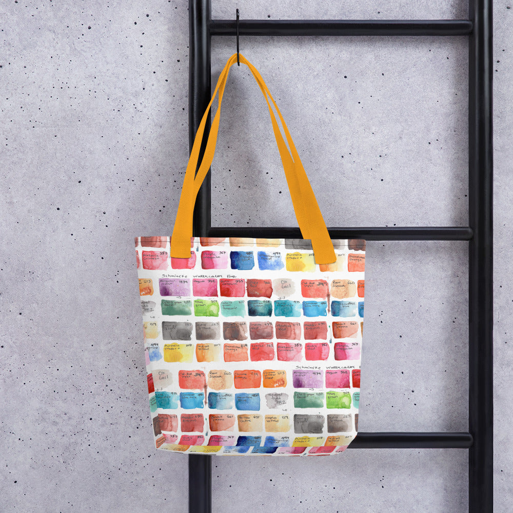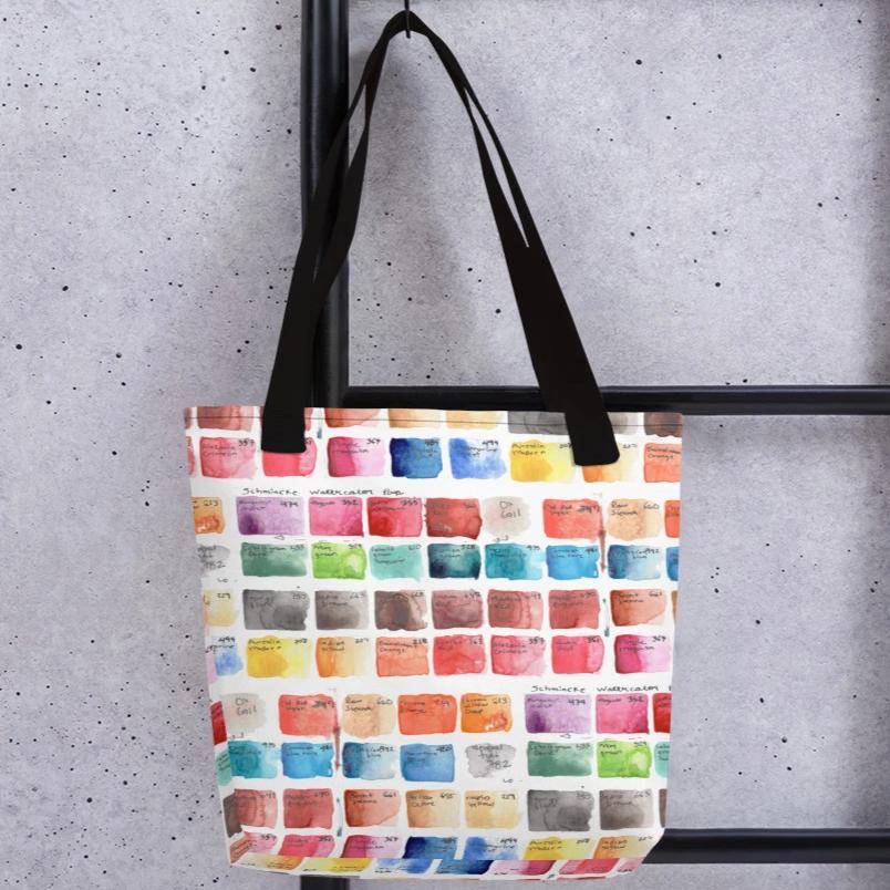 This tote bag has some of my favorite schmincke watercolors swatches printed on the side. What a better way to start an artful day than with beautiful colors??