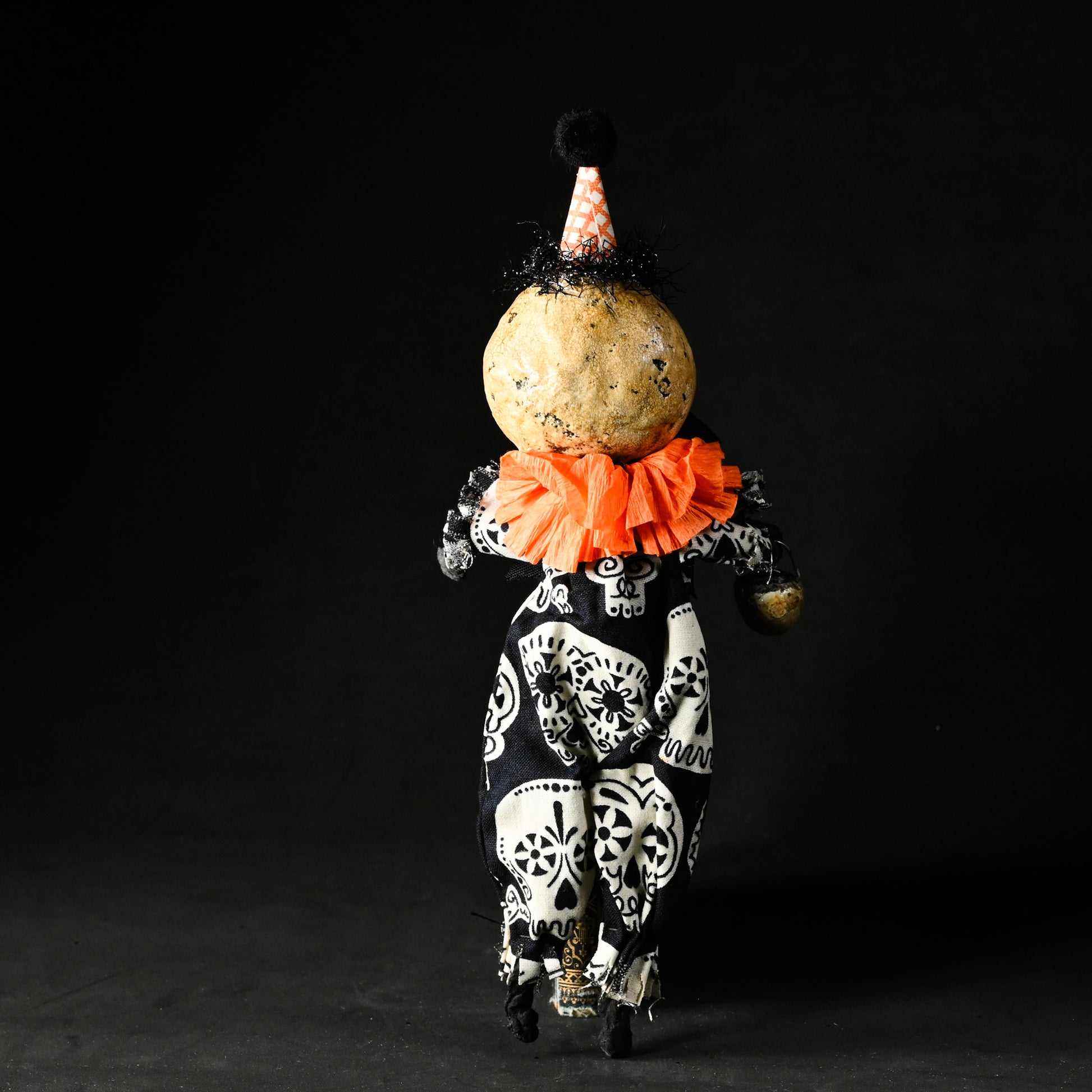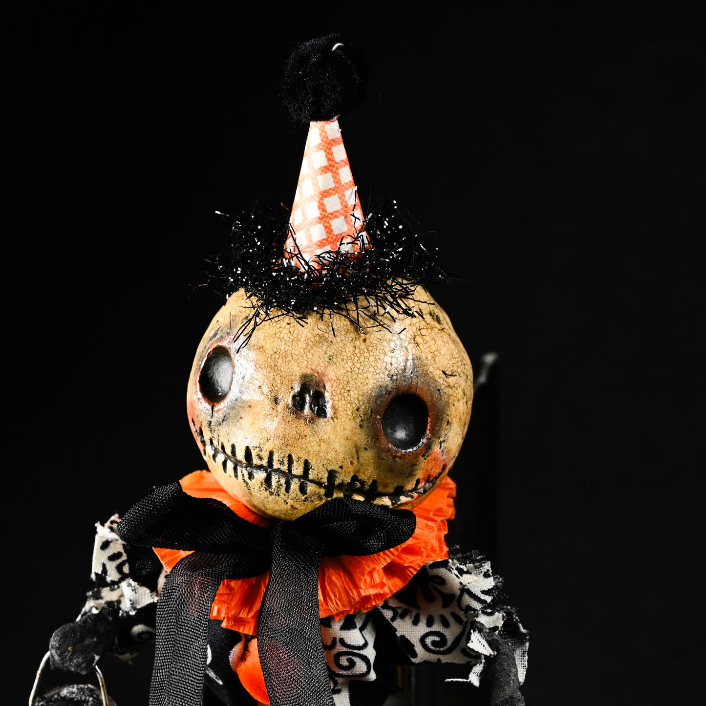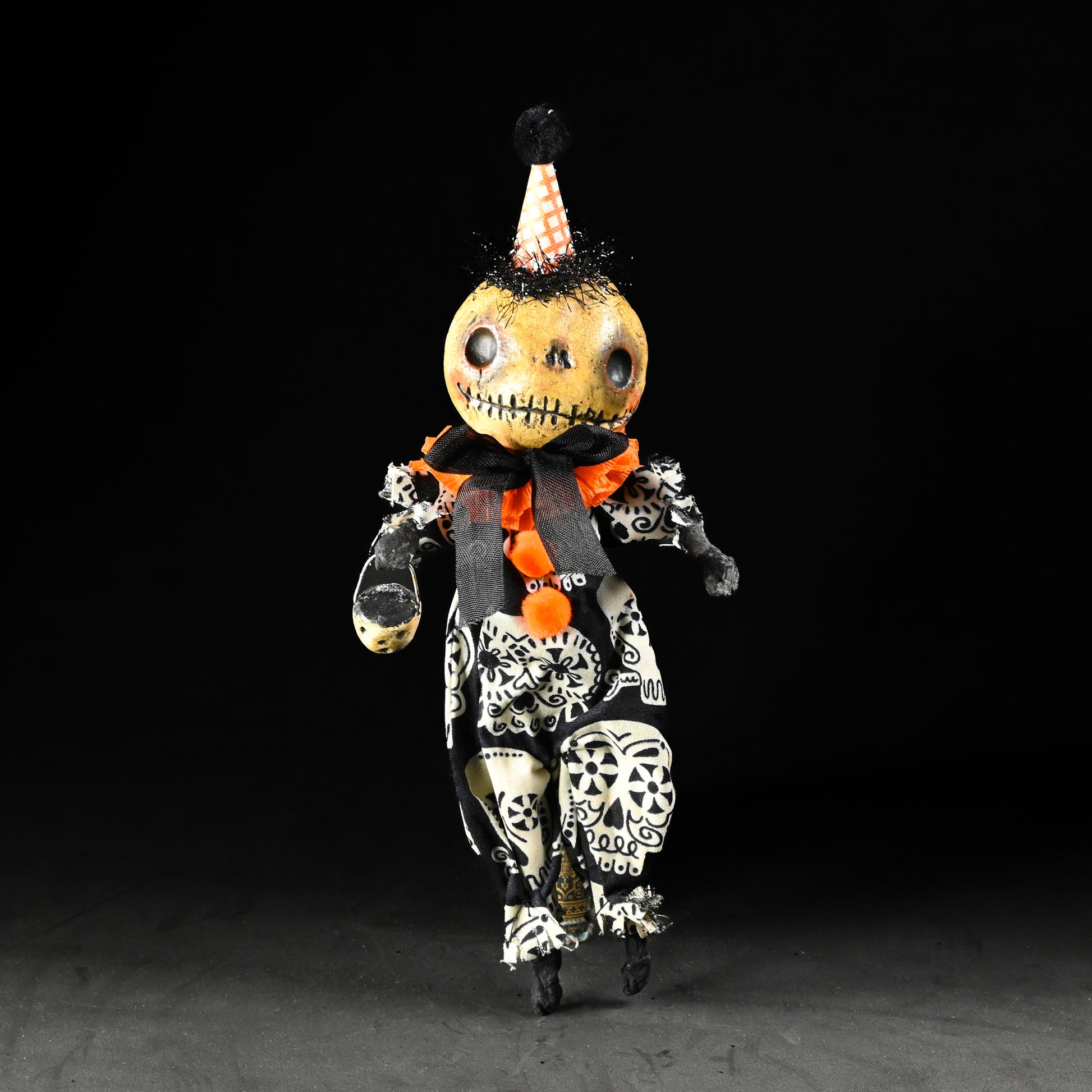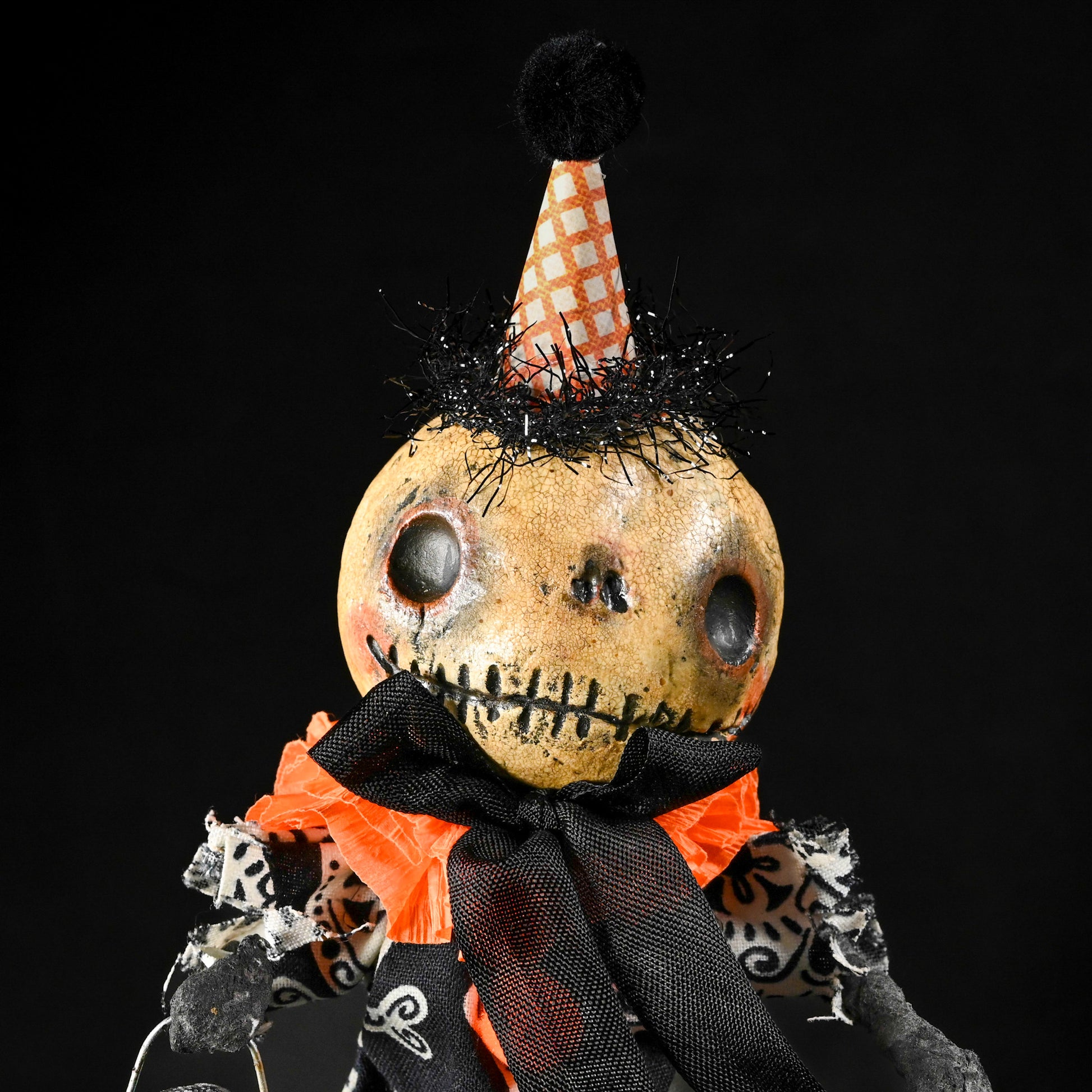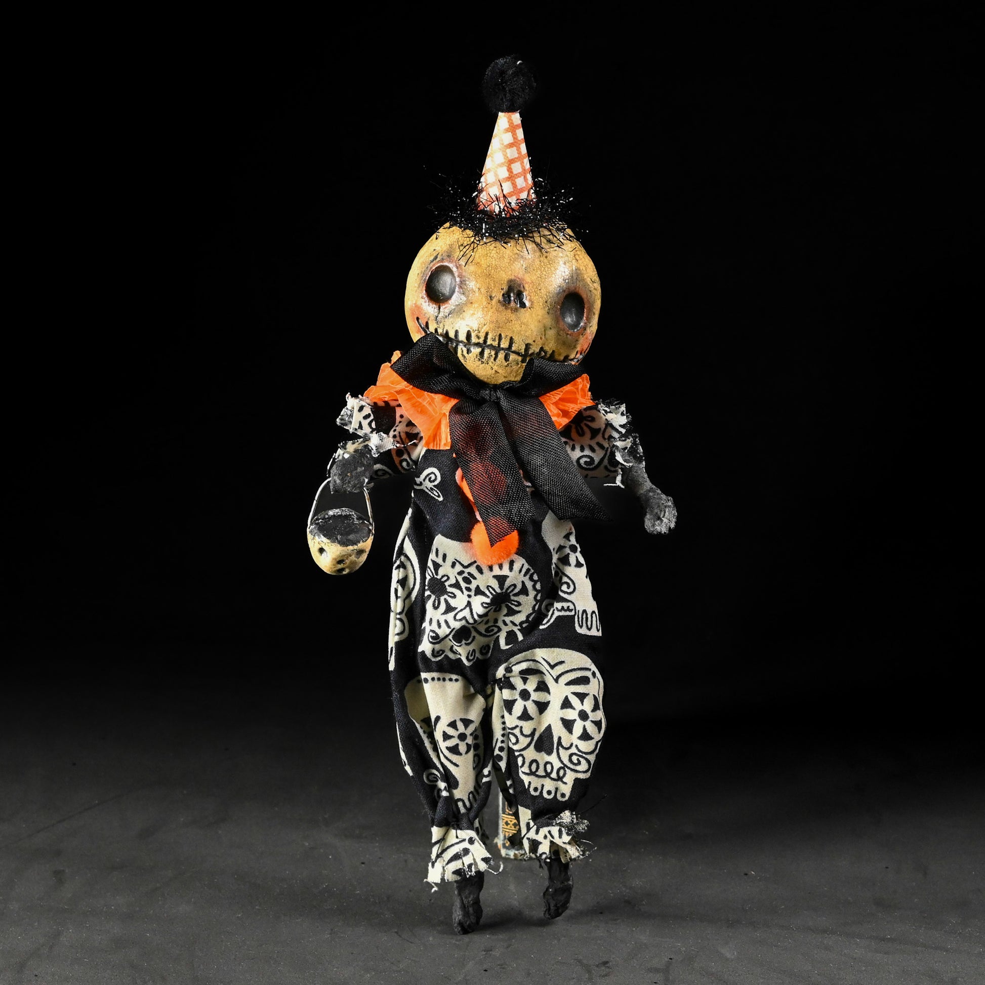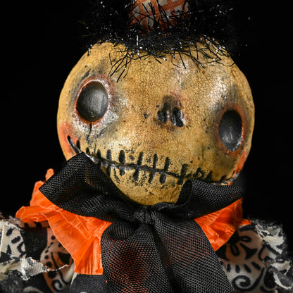 The Halloween art doll has a jack-o-lantern on its hand and it can be displayed sitting on a shelf, or hanging as an ornament from your Halloween or Christmas tree.