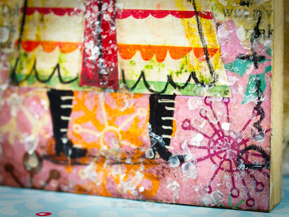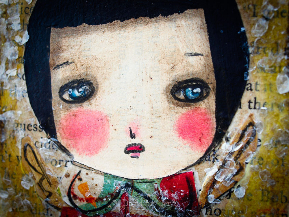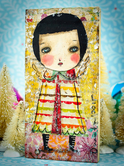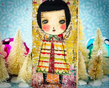 I created a series of 10 mini paintings with unique snow angels with wings and paper collage clothes, perfect to decorate your favorite wall in your home. Each painting measures 3x6 inches and it's ready to hang after you open the gift wrapping I included to get you on the holiday mood.