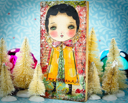 I created a series of 10 mini paintings with unique snow angels with wings and paper collage clothes, perfect to decorate your favorite wall in your home. Each painting measures 3x6 inches and it's ready to hang after you open the gift wrapping I included to get you on the holiday mood.