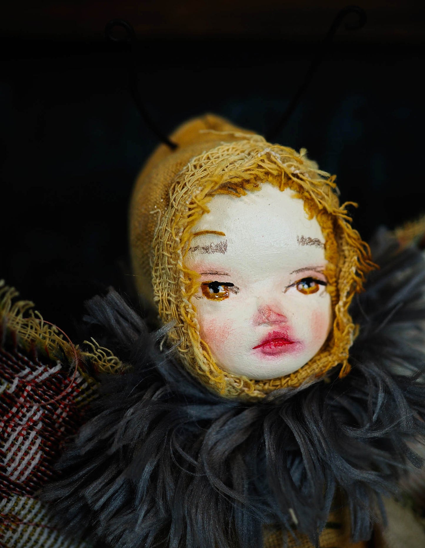 Each body is filled and shaped by hand, then sewn into a body that holds a beautiful air dry clay face, painted with my melancholic and mysterious eyes that you know so well.