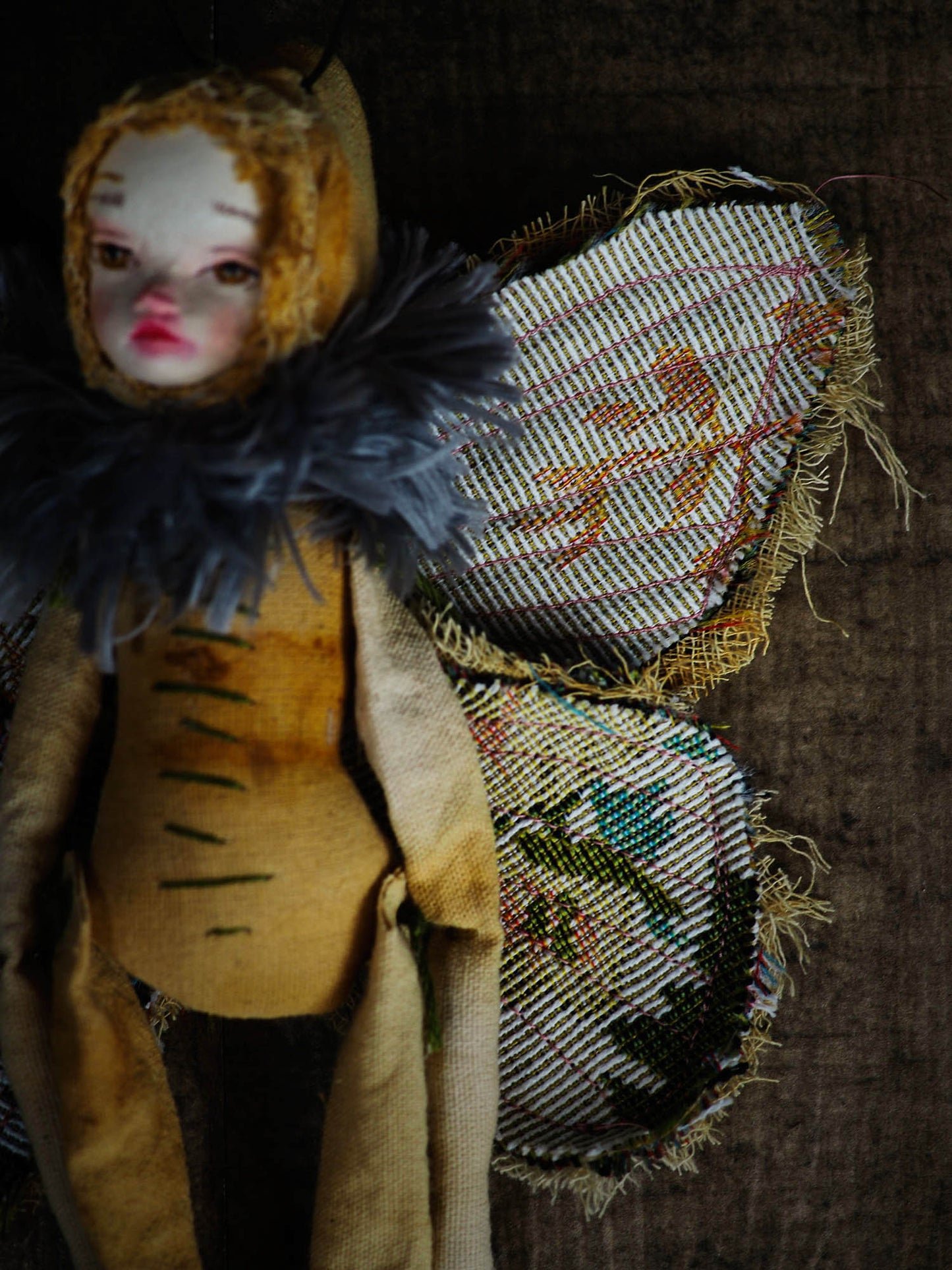 I was inspired to create a series of art dolls for collectors, and I took inspiration from nature to make a set of handmade 10 dolls with articulate soft bodies, furry necks and beautiful wings that came from a vintage couch upholstery I found on one of excursions to thrift and antique shops.