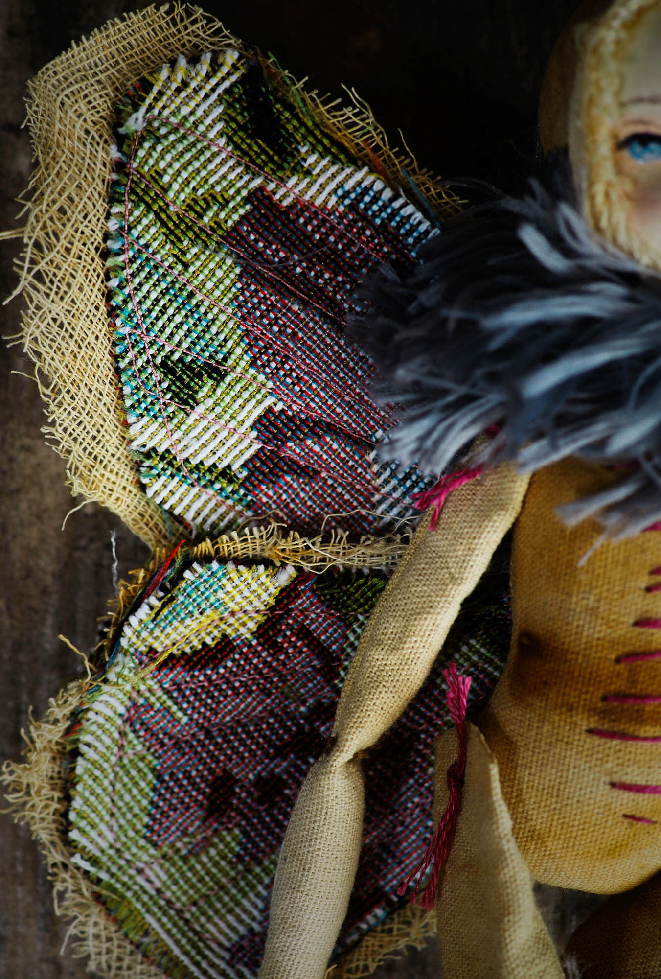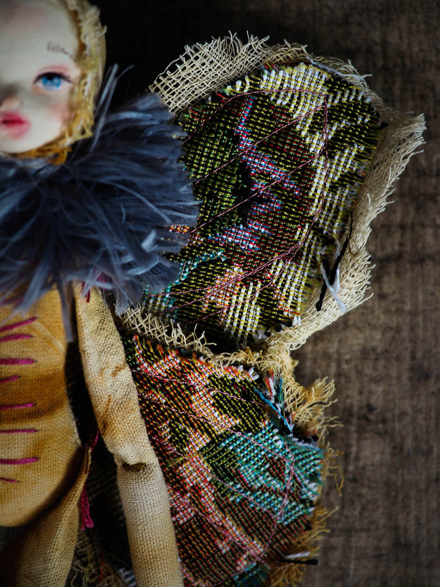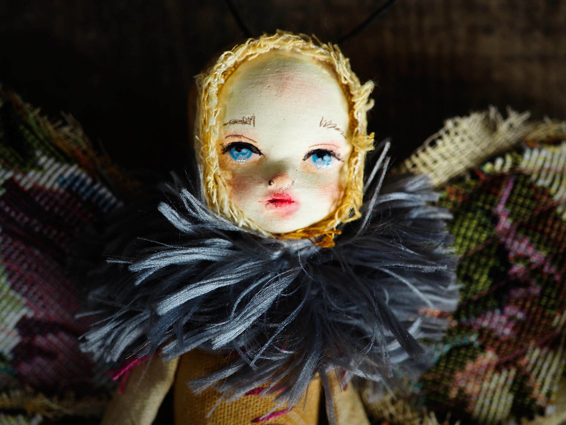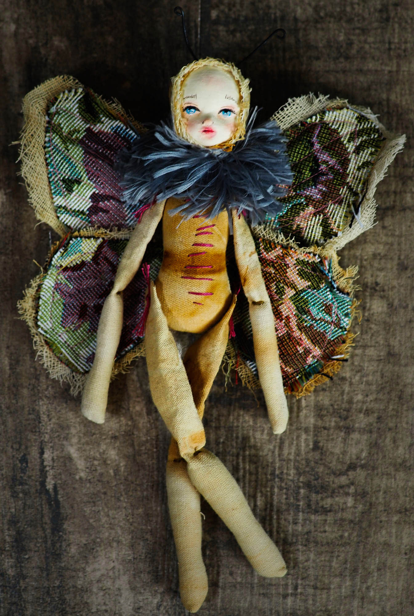 I was inspired to create a series of art dolls for collectors, and I took inspiration from nature to make a set of handmade 10 dolls with articulate soft bodies, furry necks and beautiful wings that came from a vintage couch upholstery I found on one of excursions to thrift and antique shops.