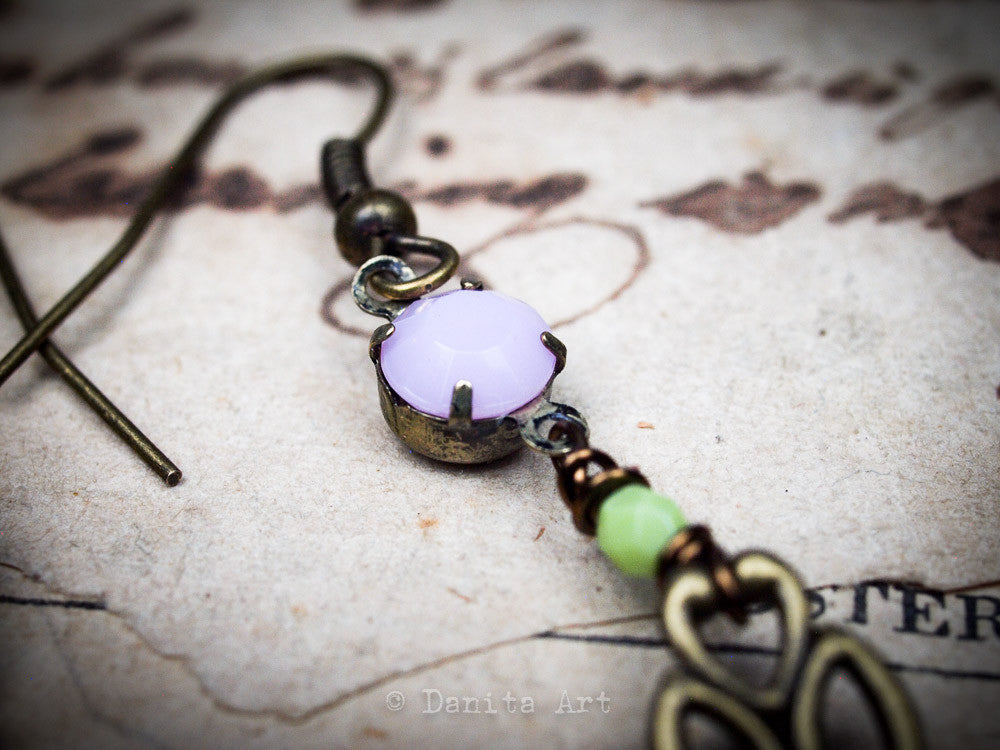 The earrings measure approximately 2 inches long, with a combination of metal, glass and natural stones.