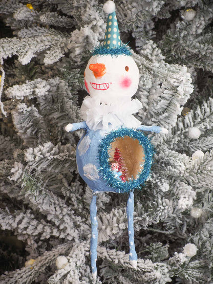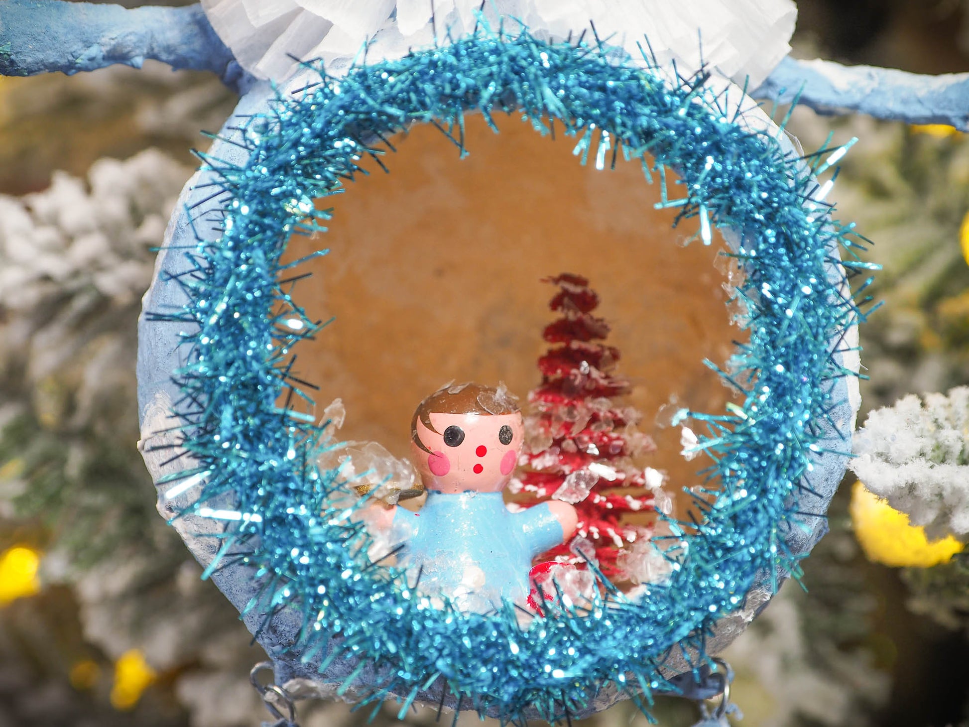 Adorable handmade spun cotton Art Doll Christmas tree ornament by Idania Salcido, the artist by Danita Art. Hand painted by the artist holiday figurine with paper hat with tinsel and vintage style garlands and a tiny Christmas tree. Hang this handmade ornament from your Christmas tree or use as Holiday decoration.