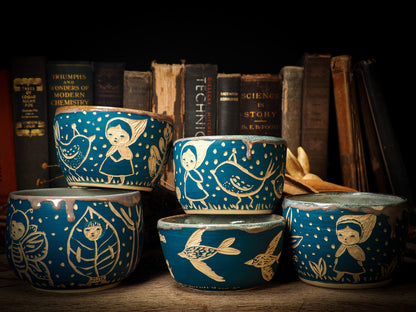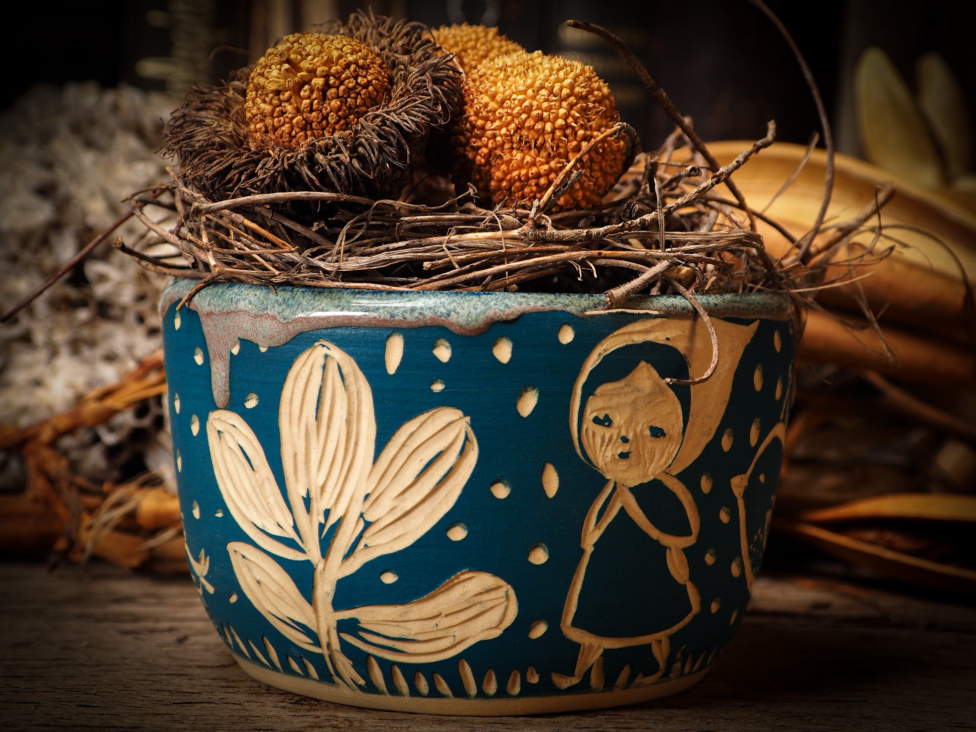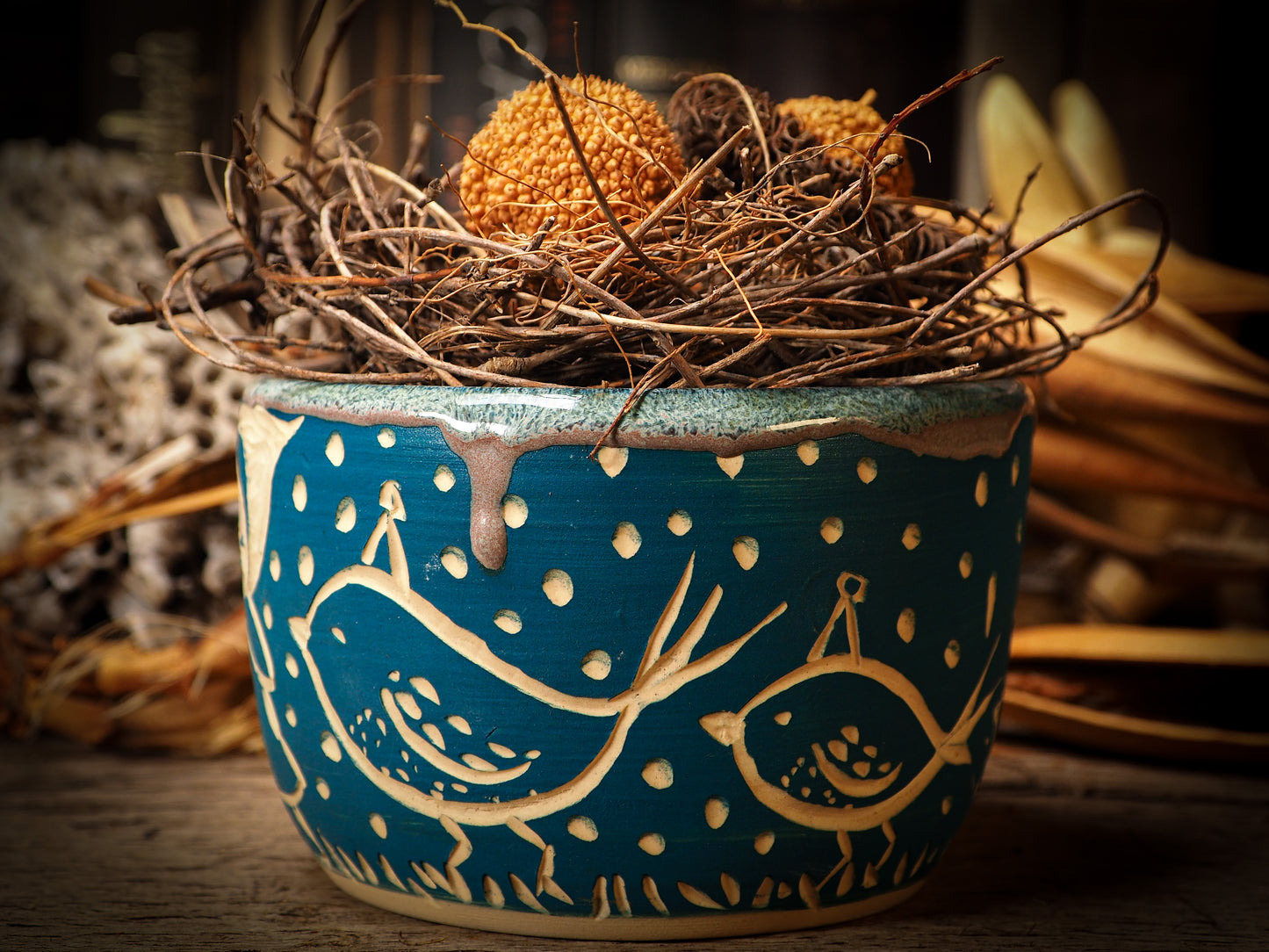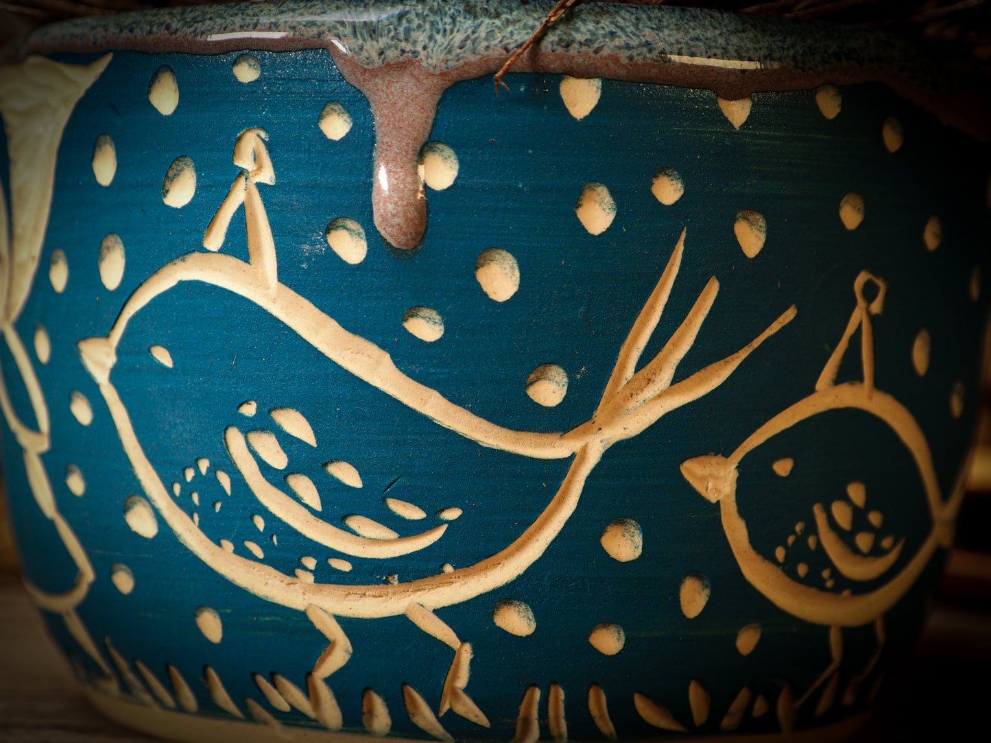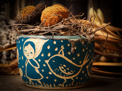 You are looking at original handmade fire glazed stoneware ceramic piece with sgraffito bird and peasant girl motifs in a deep aquamarine color by Idania Salcido, the artist behind Danita Art.