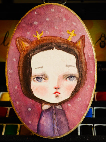 This is an original Danita watercolor painting on a oval wood block, a cute deer with melancholic eyes that is ready to be displayed when it arrives.