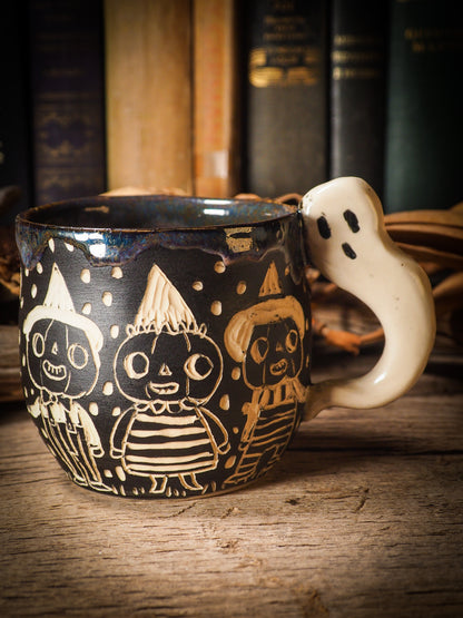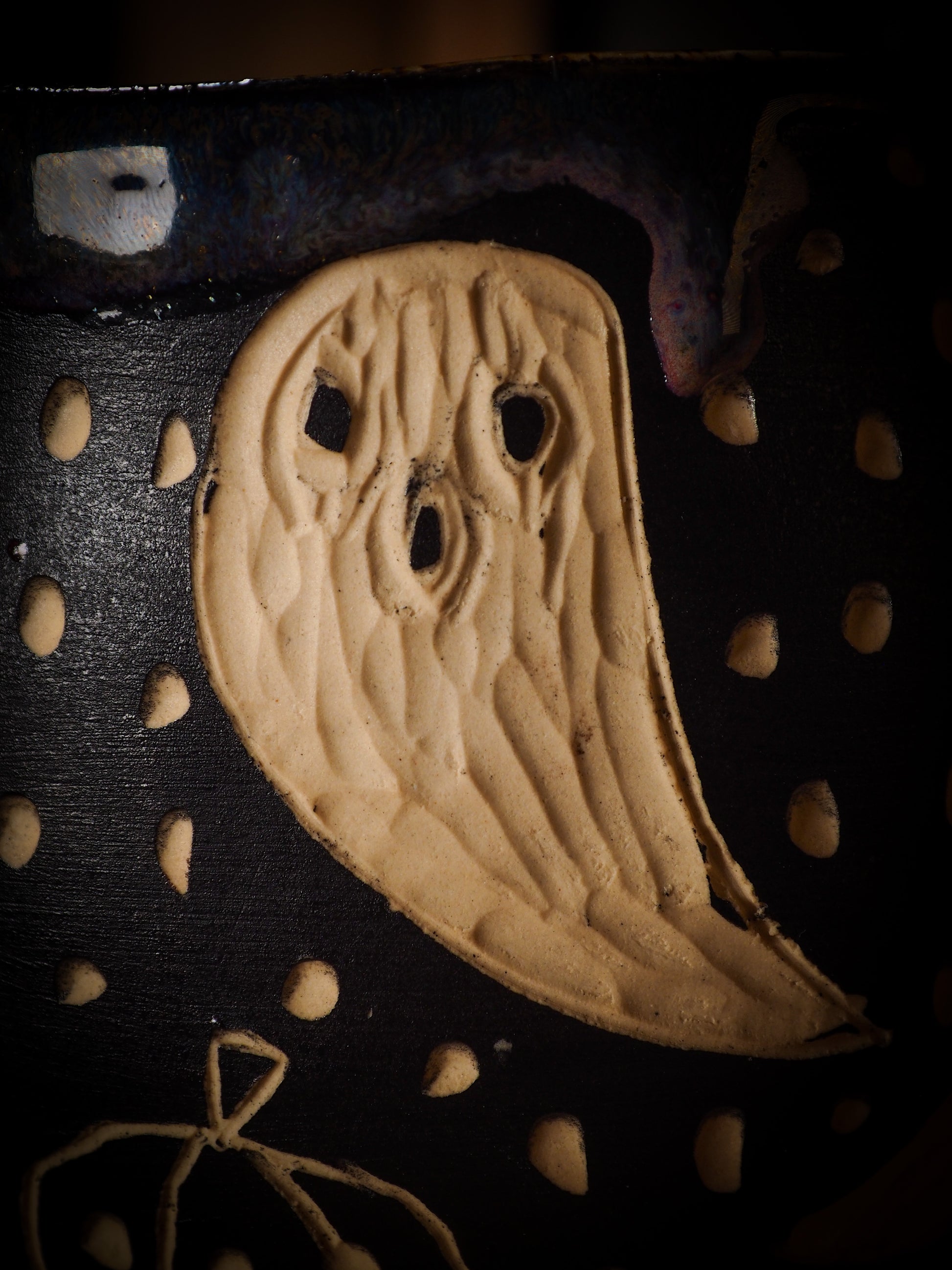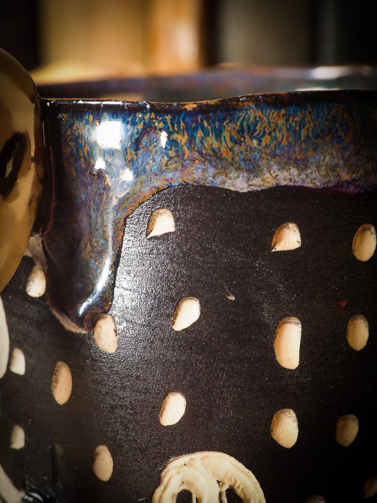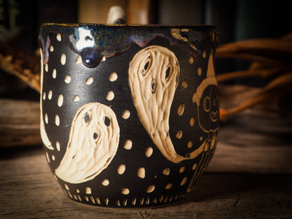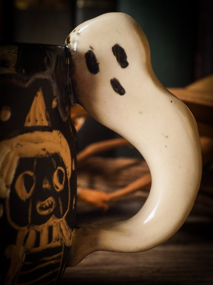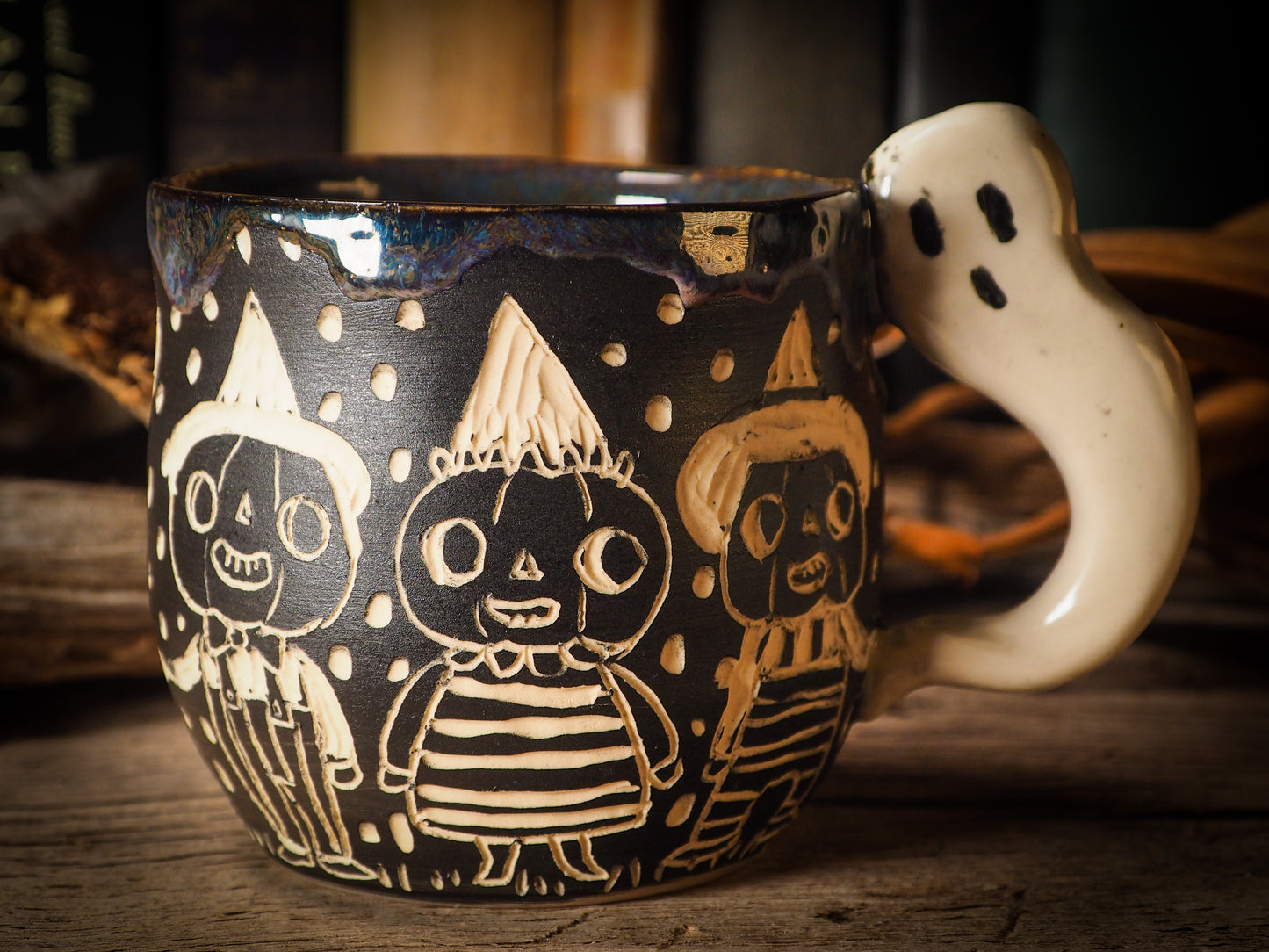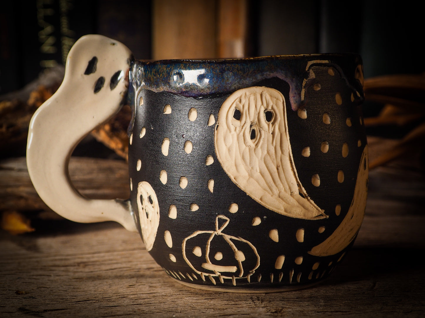 The mug is hand carved with Halloween motives like ghosts, skeletons, witches, ghouls, black cats and more come to life as hand carvings on the sides, with an inside covered in a beautiful food safe glaze with intricate swirls of colors to discover as you enjoy your favorite drink on it.