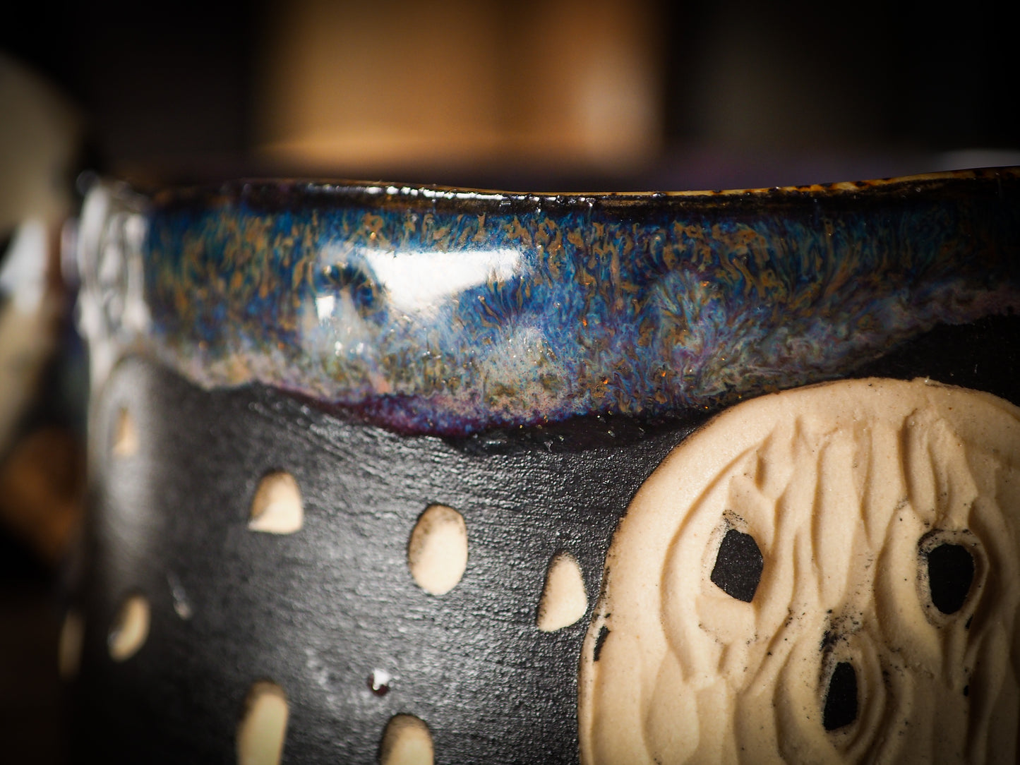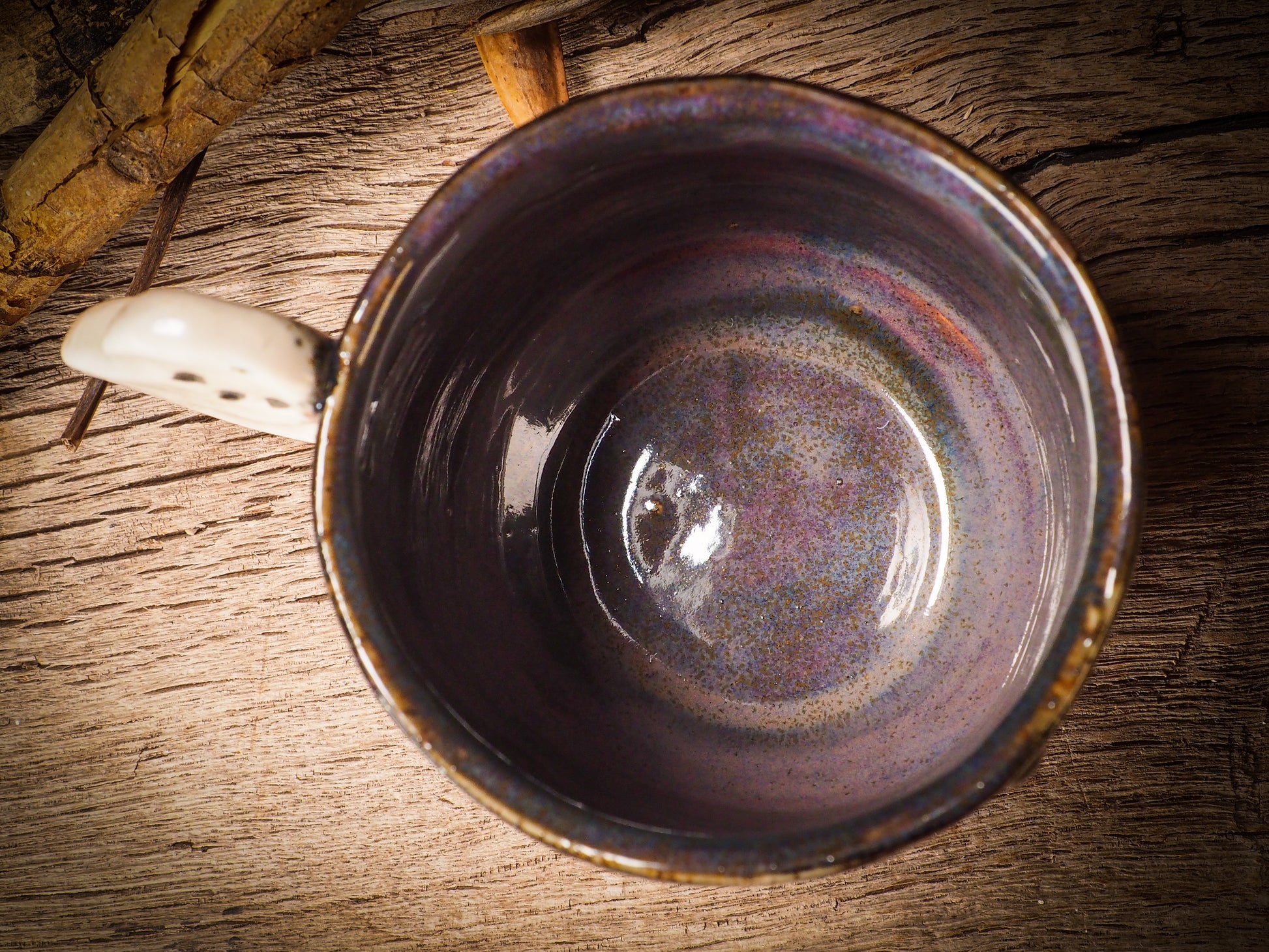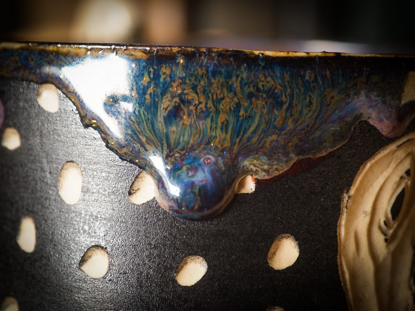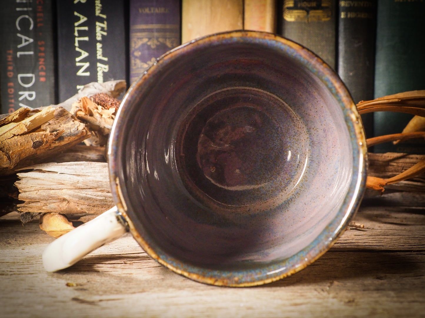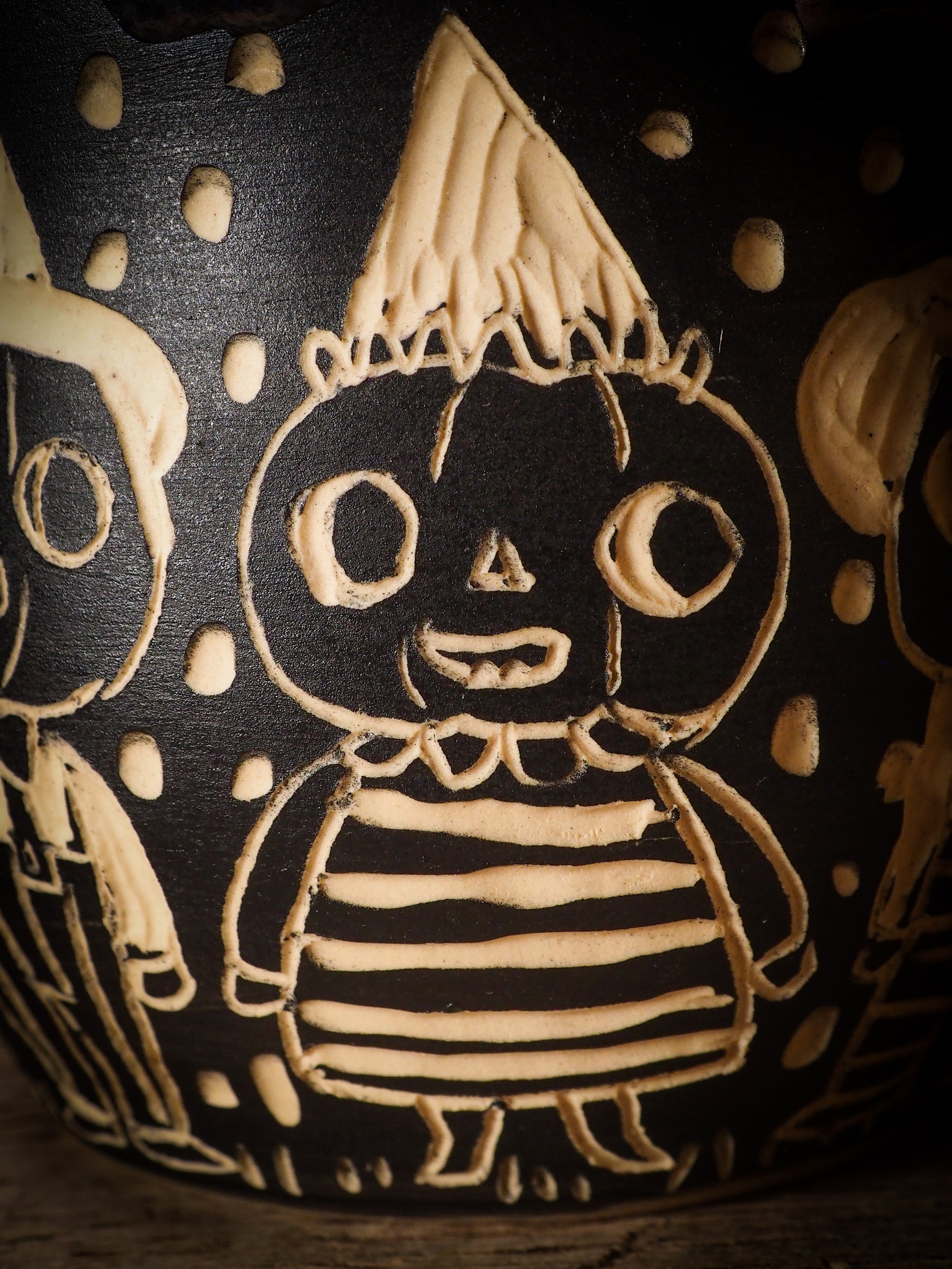 The mug is hand carved with Halloween motives like ghosts, skeletons, witches, ghouls, black cats and more come to life as hand carvings on the sides, with an inside covered in a beautiful food safe glaze with intricate swirls of colors to discover as you enjoy your favorite drink on it.