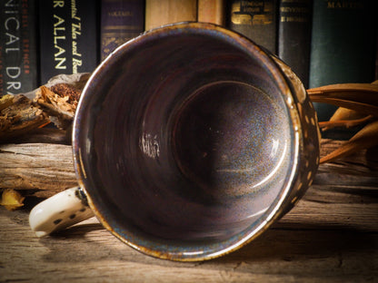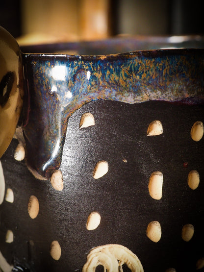 An original, fire glazed ceramic coffee mug by Idania Salcido, Danita Art. Inspired by Halloween, Danita created a beautiful ceramic container for your favorite pumpkin spice coffee, a warm cup of tea or maybe to keep your favorite sweets to enjoy with your favorite trick-or-treaters.