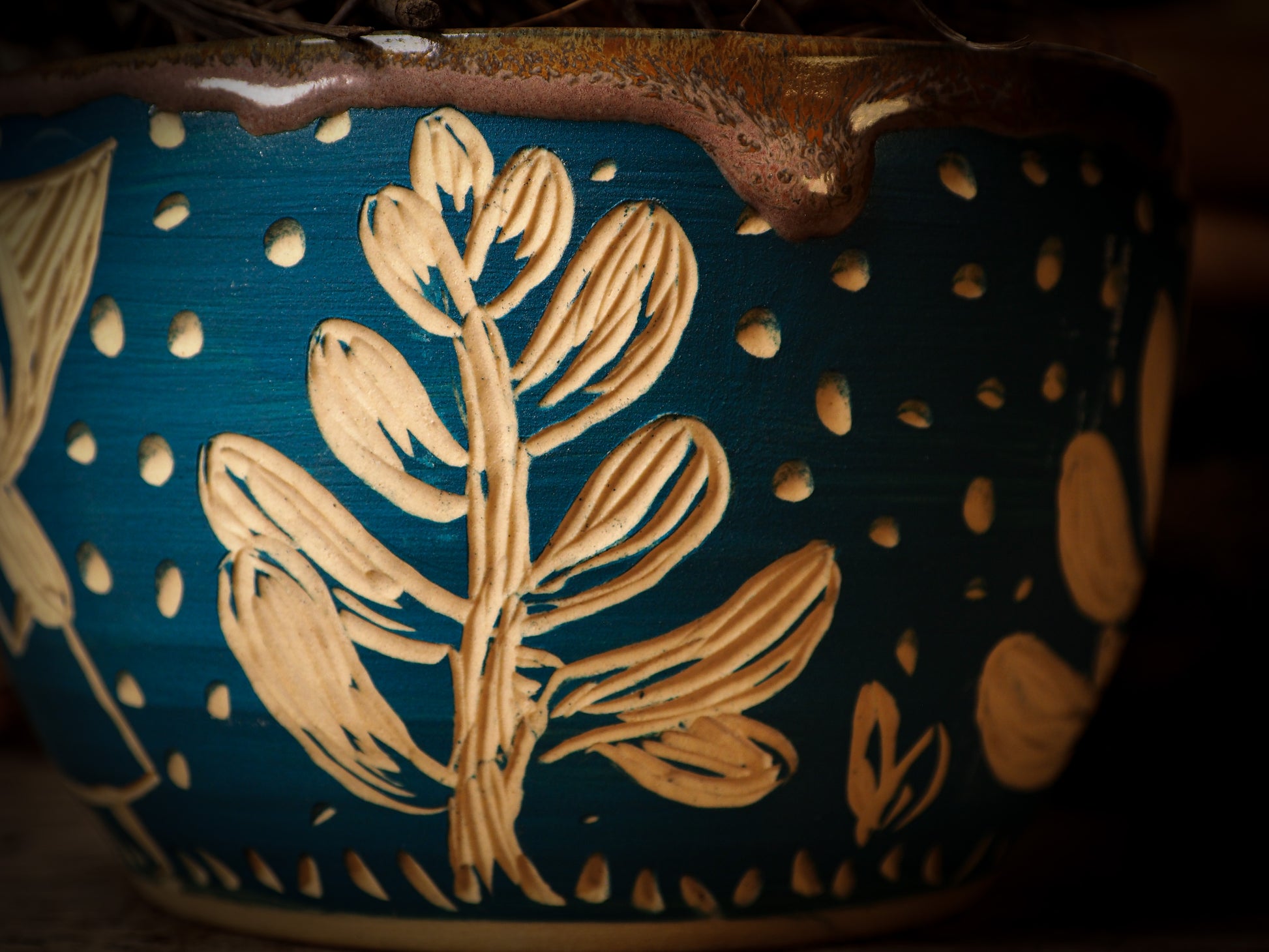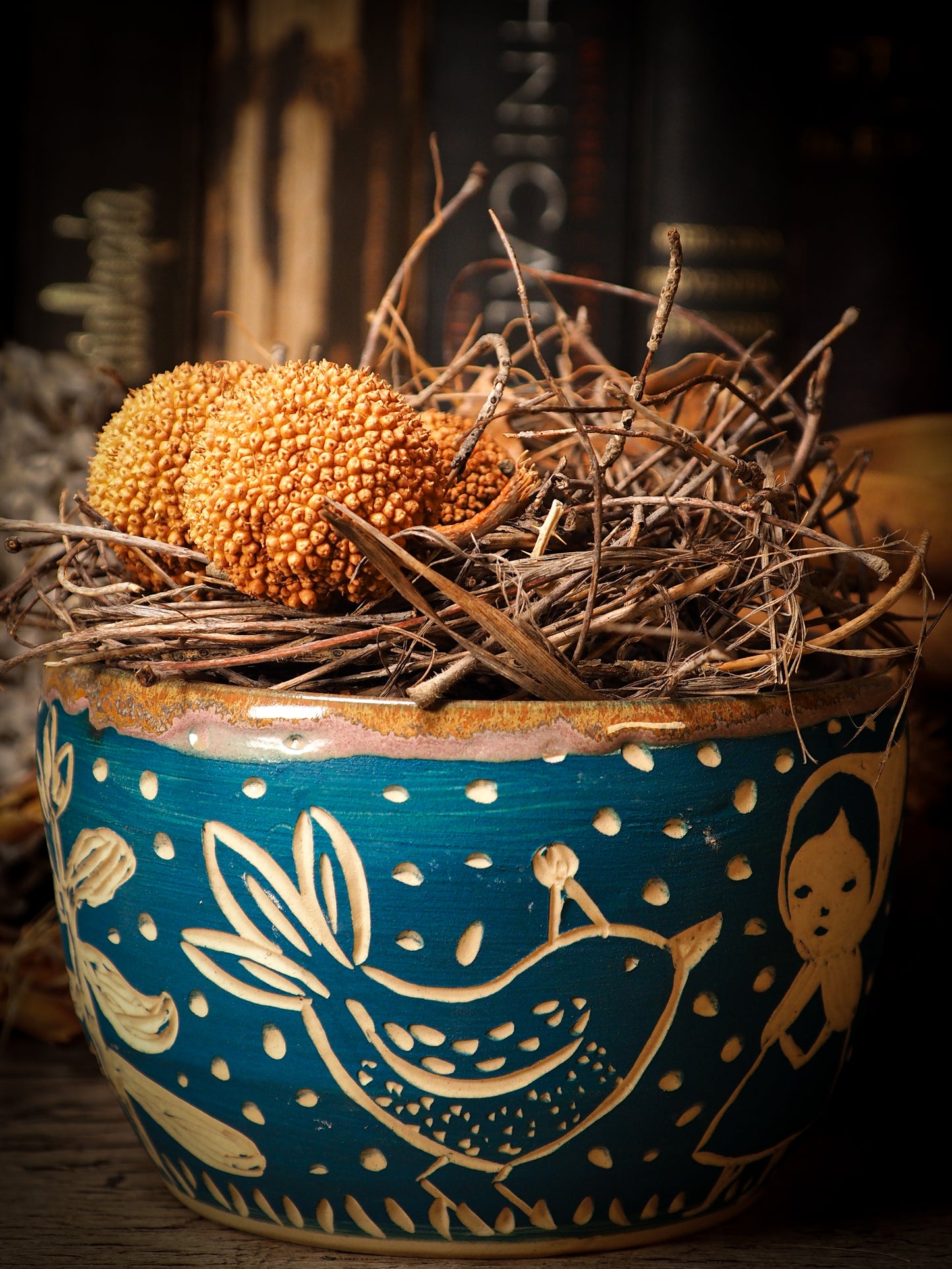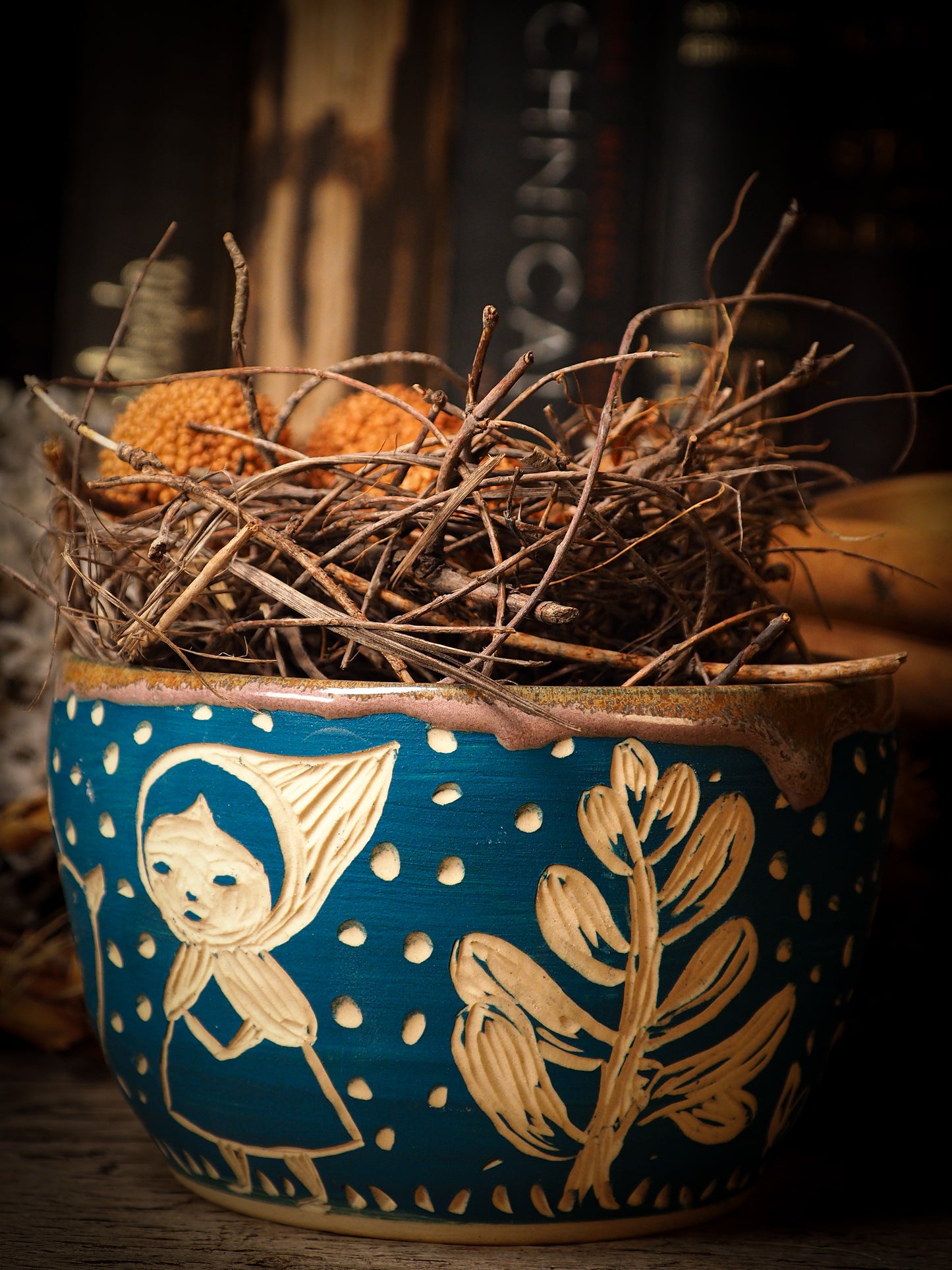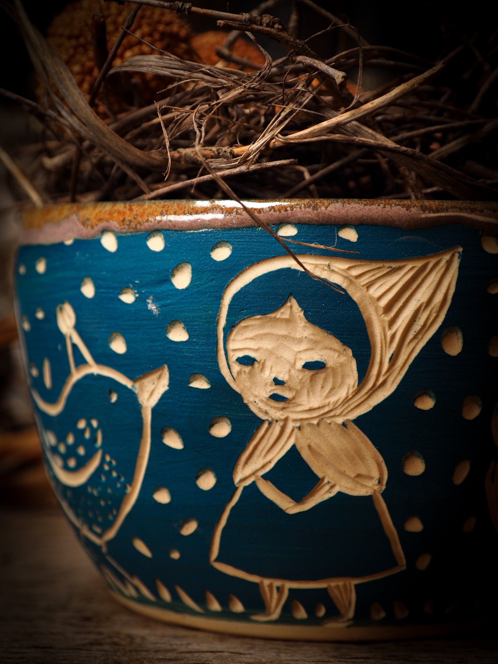 You are looking at original handmade fire glazed stoneware ceramic piece with sgraffito bird and peasant girl motifs in a deep aquamarine color by Idania Salcido, the artist behind Danita Art.