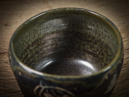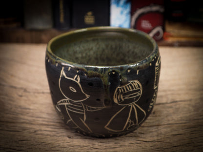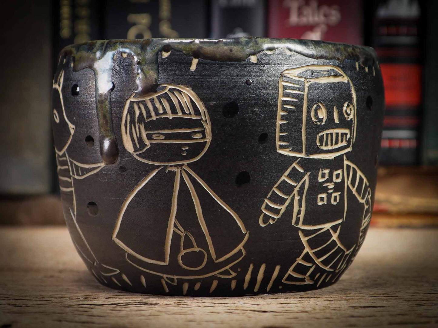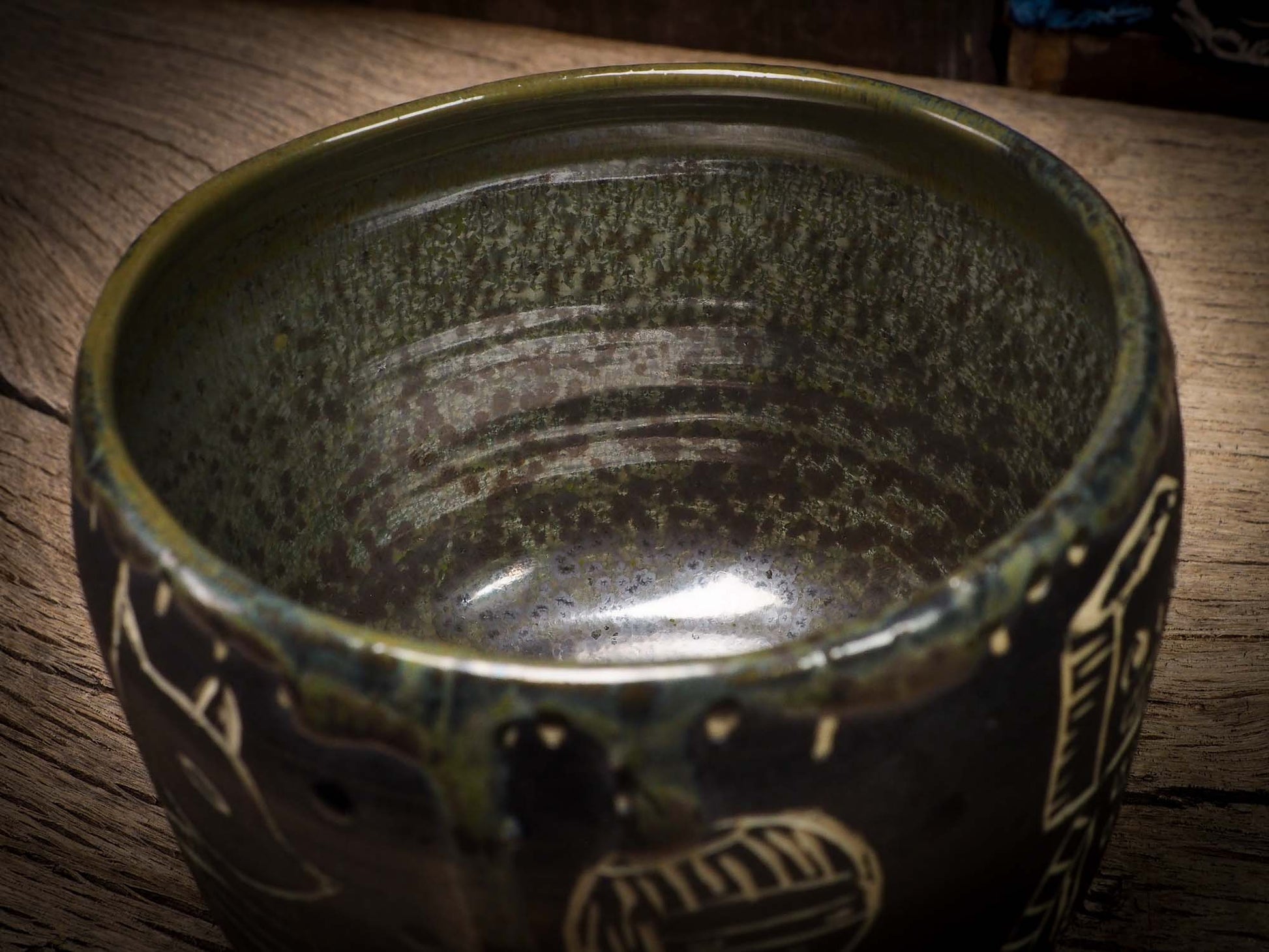 It measures 4 x 4 x 3 Inches, made with wheel thrown clay, hand carved and glazed by me with a dark, gooey glaze on the outside as well as the inside. The carved figures give it a nice, folk art primitive feel to it.