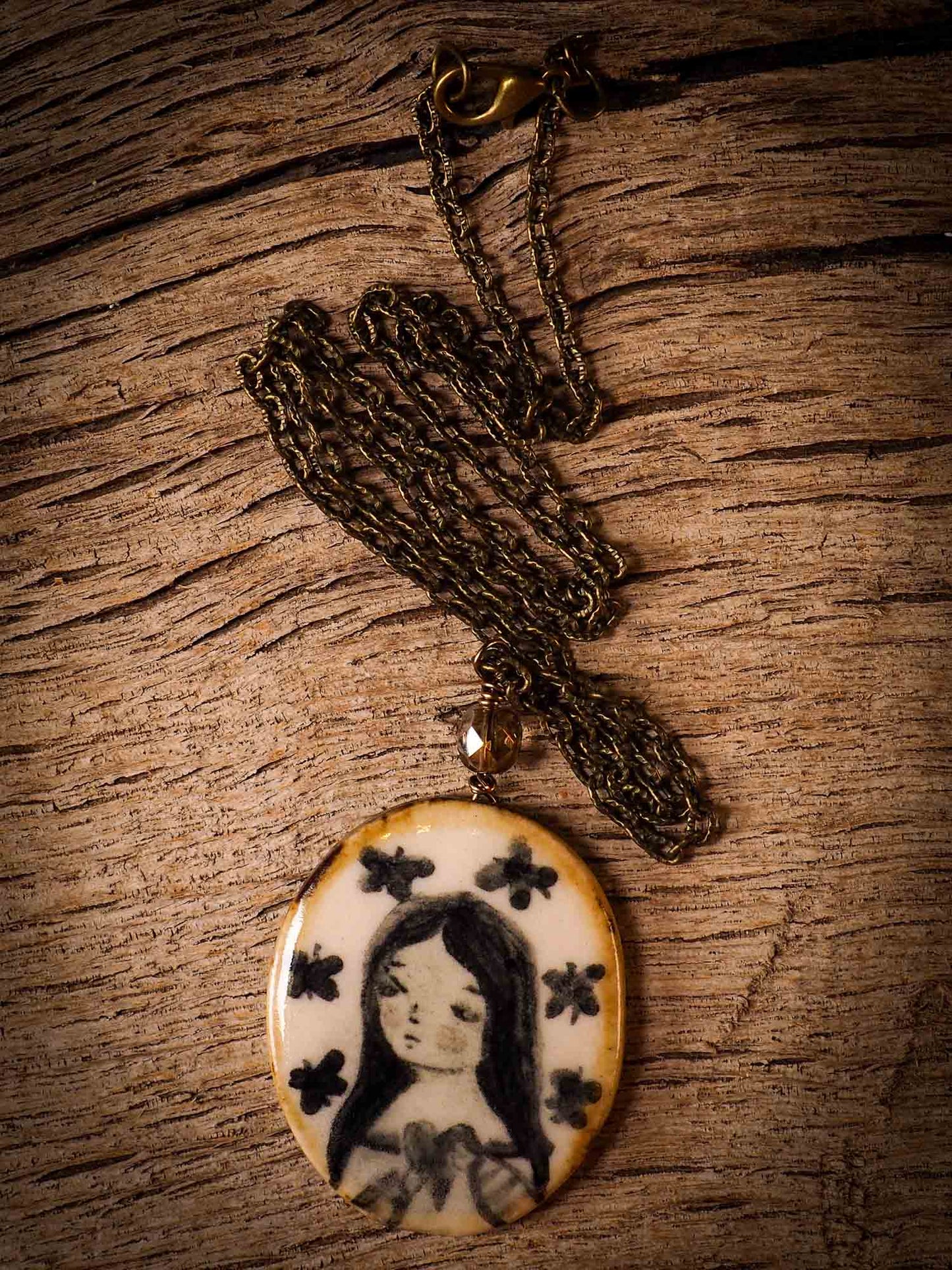 You too can imbue your necklace with the magic of your memories, so that when you wear it again, I the beautiful hand painted image on it reminds you of what drew you to it the first time you saw it, and that it lingers with you as long as you wear it.