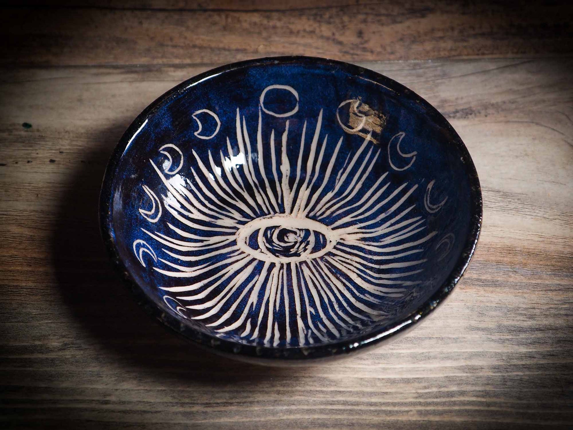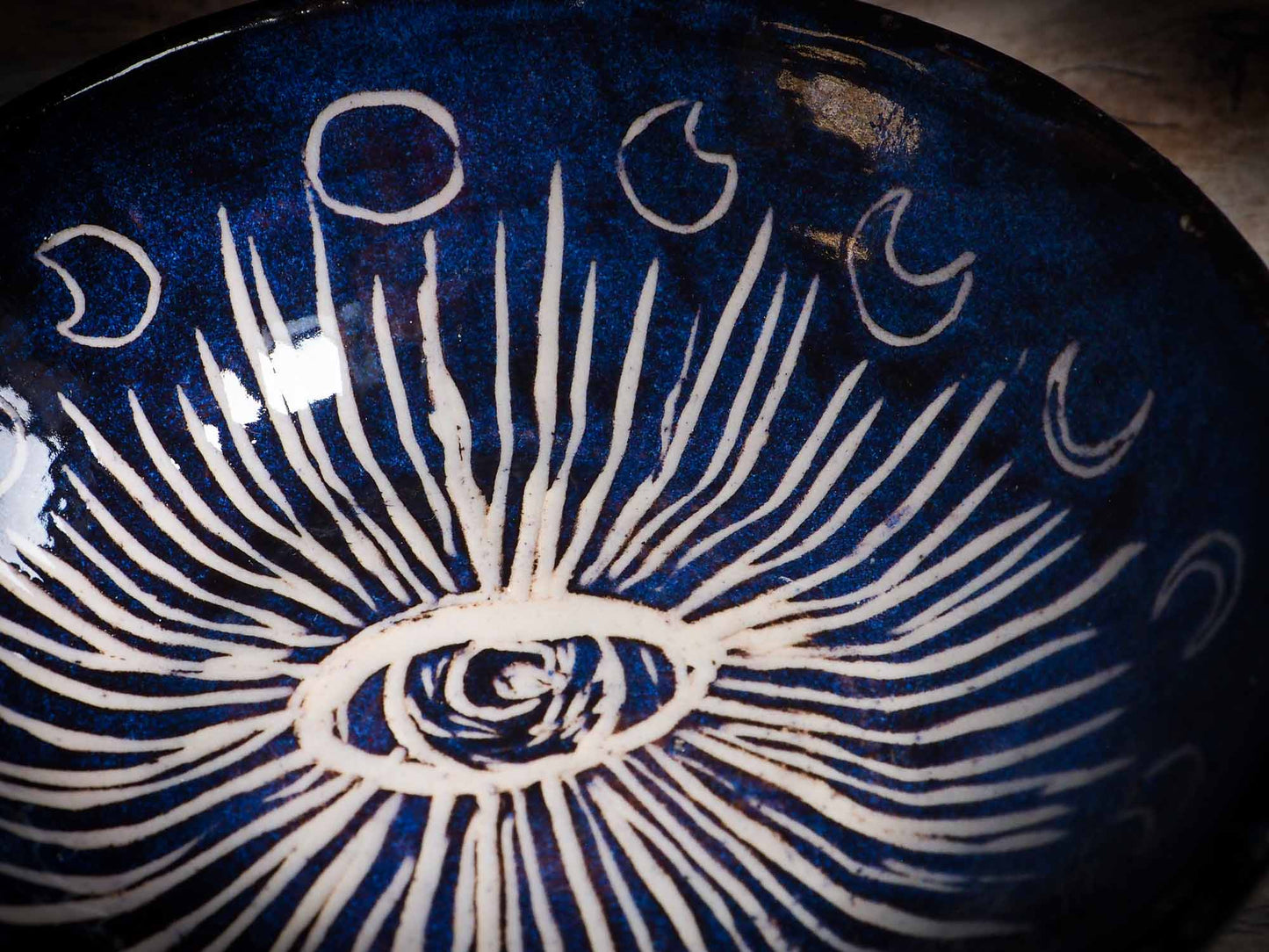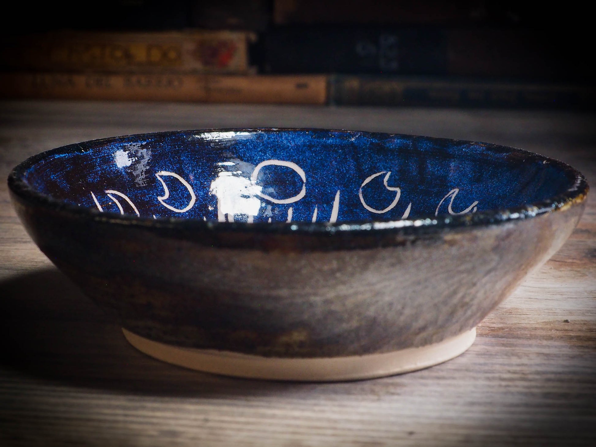 It measures 4 1/2 Inches, made with wheel thrown clay, hand carved and glazed by me with a dark, gooey glaze on the outside as well as the inside. The carved figures give it a nice, folk art primitive feel to it.