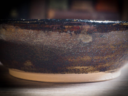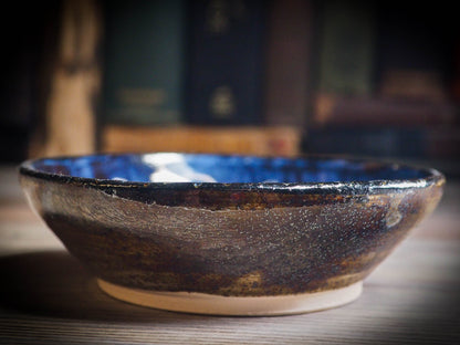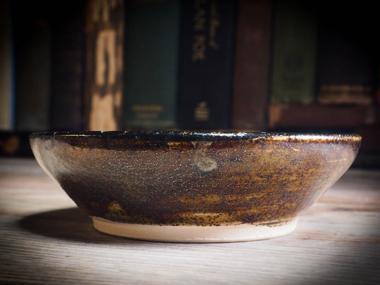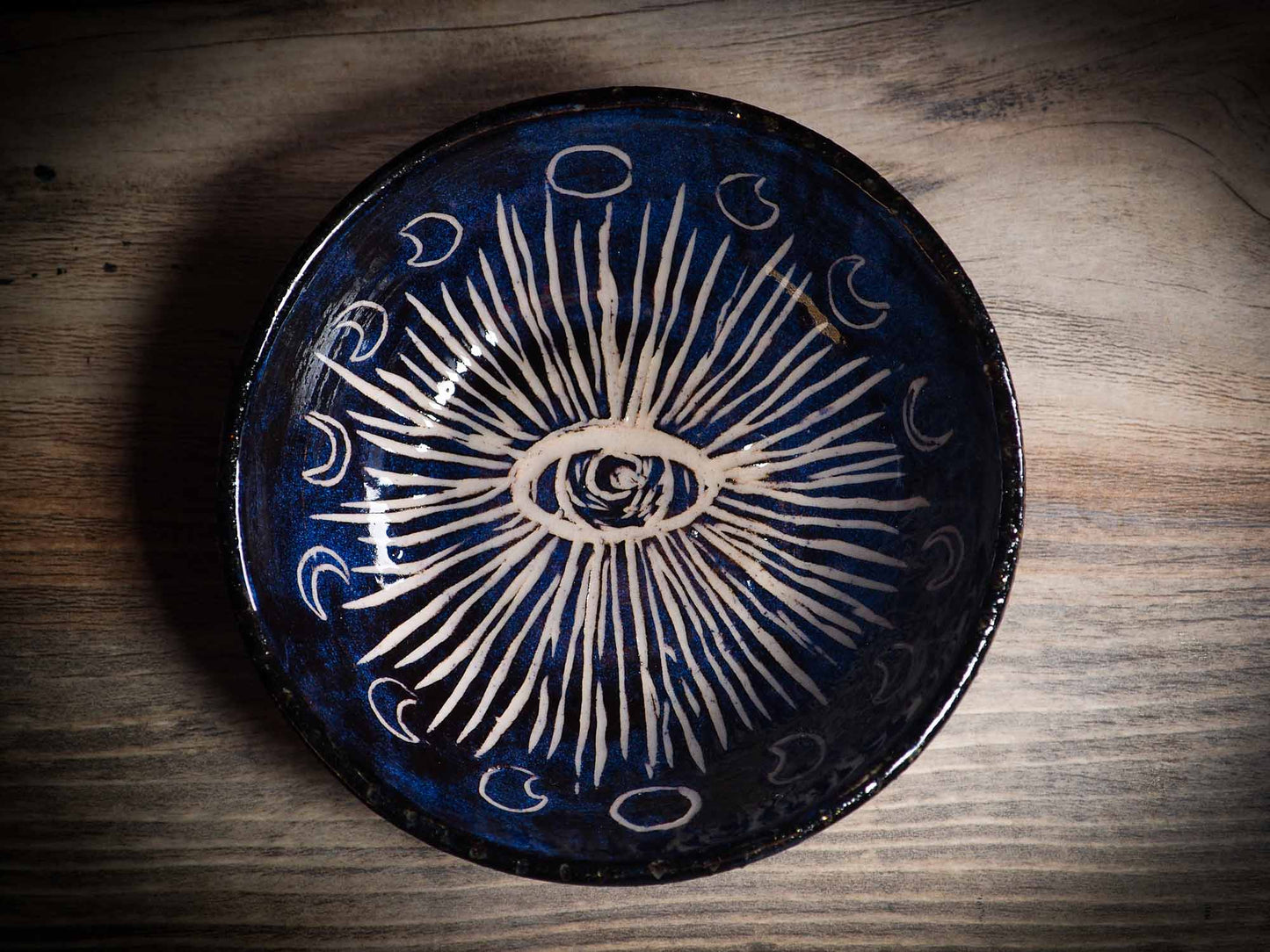 It measures 4 1/2 Inches, made with wheel thrown clay, hand carved and glazed by me with a dark, gooey glaze on the outside as well as the inside. The carved figures give it a nice, folk art primitive feel to it.