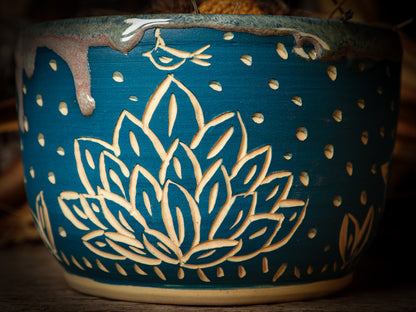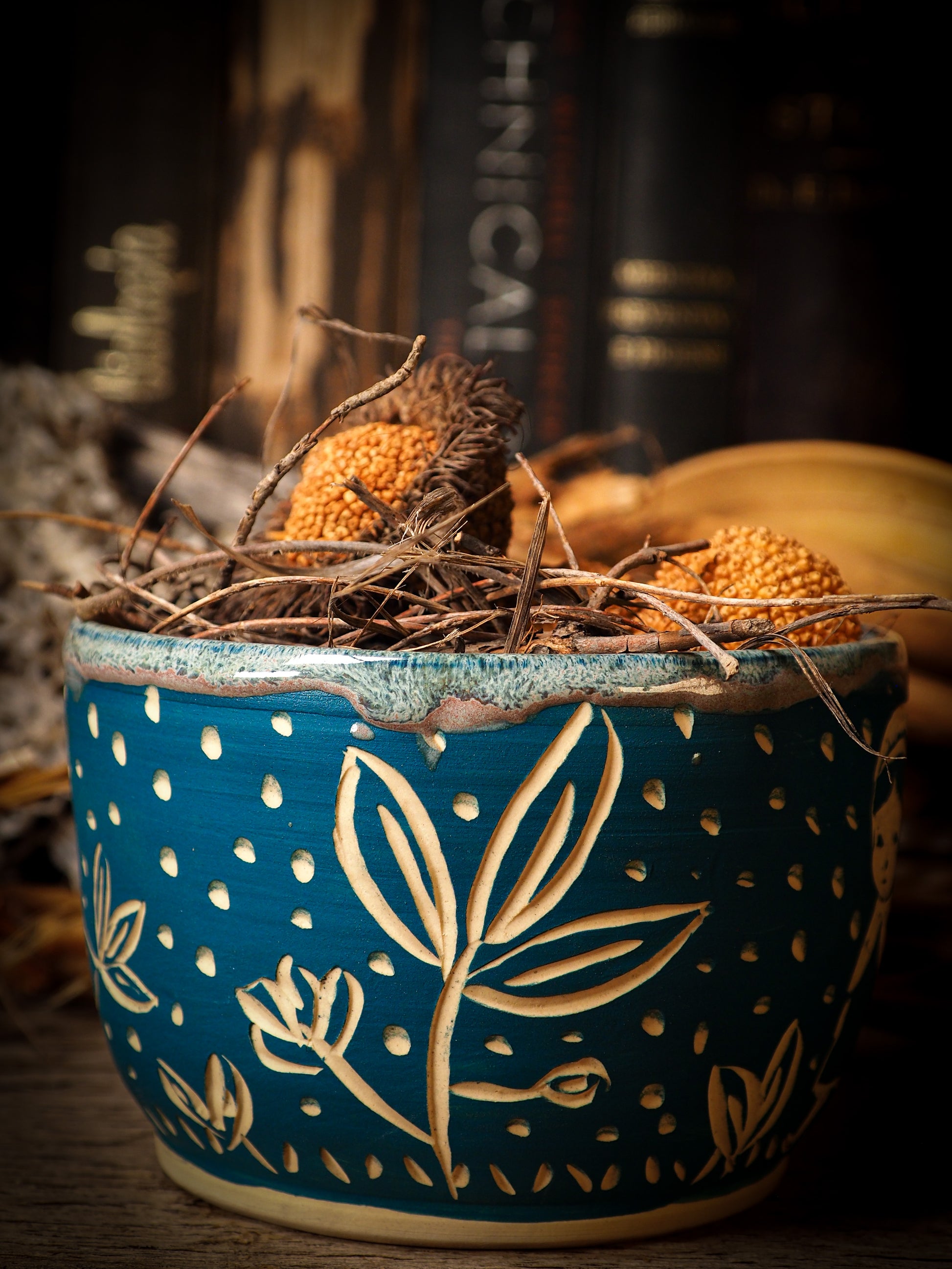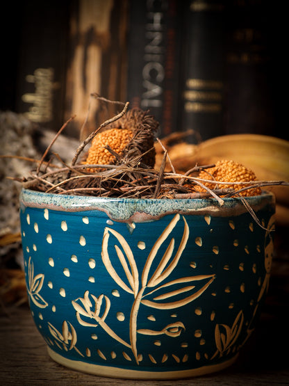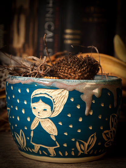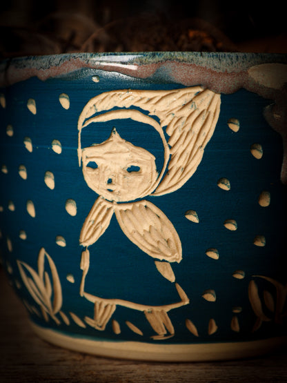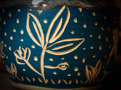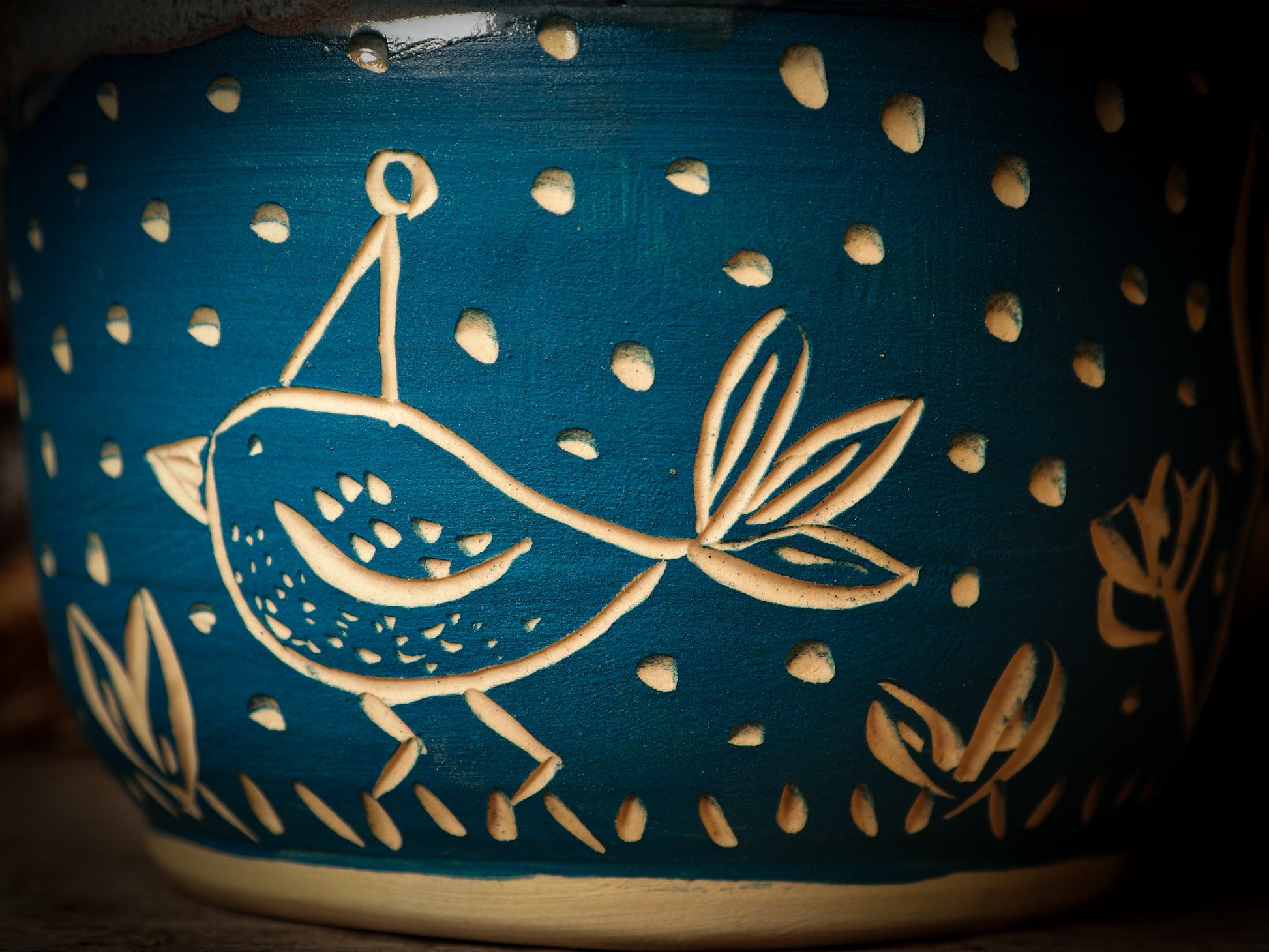 You are looking at original handmade fire glazed stoneware ceramic piece with sgraffito bird and peasant girl motifs in a deep aquamarine color by Idania Salcido, the artist behind Danita Art.
