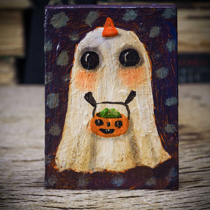 Halloween is coming, and my inspiration has just started! And for my first collection, I create a series of outsider folk art paintings with bright colors and rough textures over a wood block.