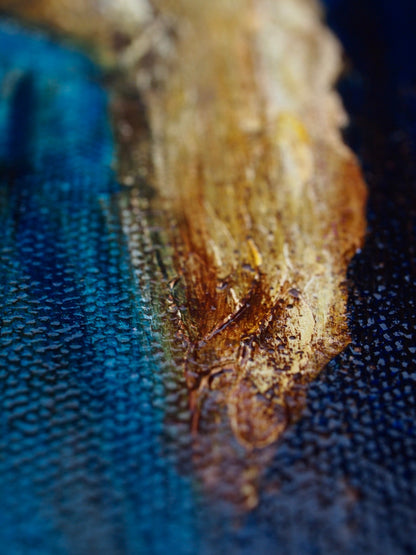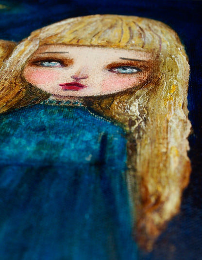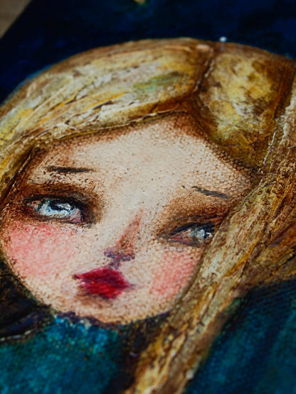 This 8"x10" painting on canvas is the part of the beginnings of my exploration. My melancholic yet full of life eyes that have become my signature take a whole new dimension with oil paintings.