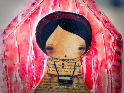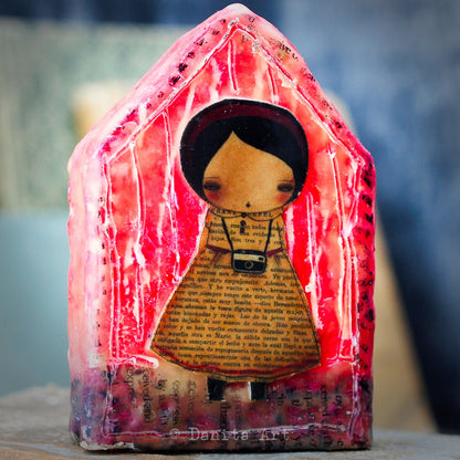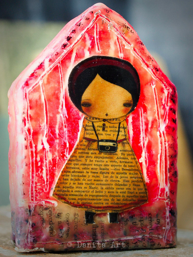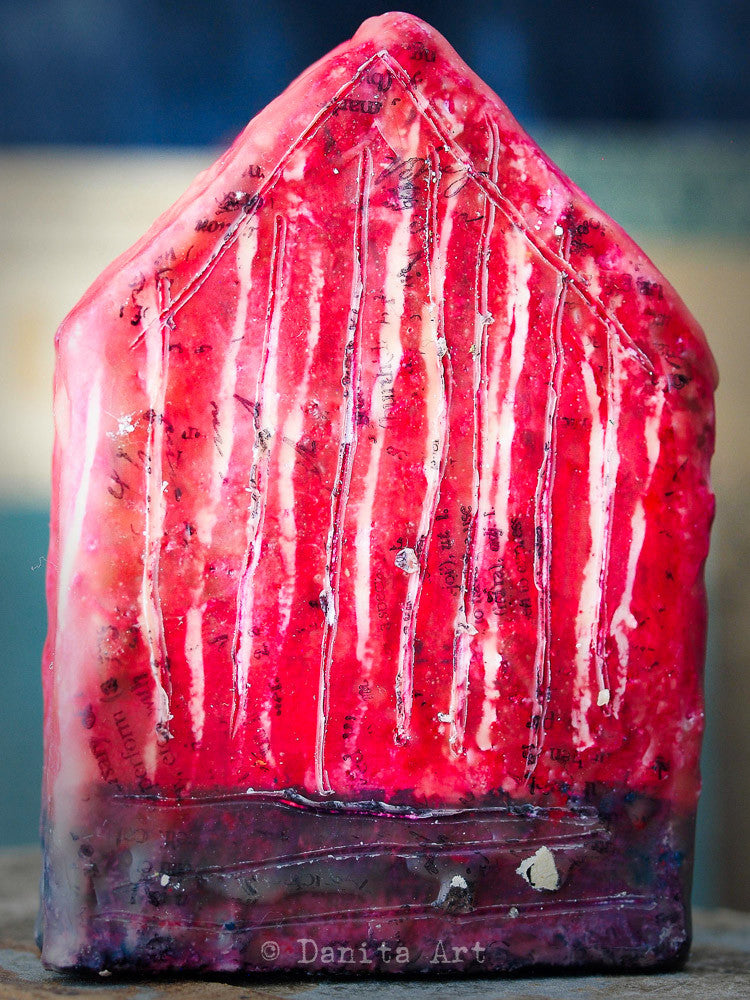 This time, a recurring theme in my art, houses, is what I chose to work just for fun. The little houses have a wooden core that was going to be painted with little decorations, but then as I was going trough my art supplies I found my stash of beeswax and here they are.