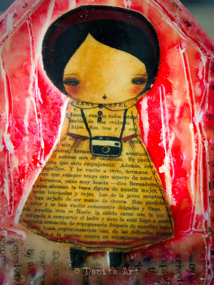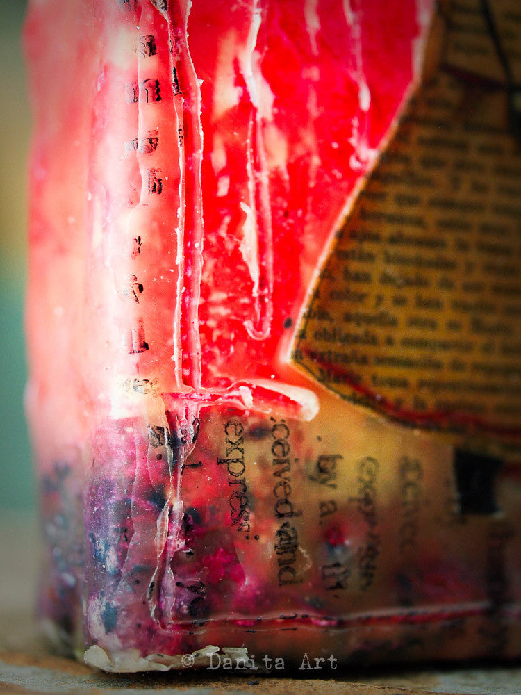 They feature a print of one of my favorite paintings, then I painted an abstract background with bright colors, and to finish everything I dipped them in beeswax and carved some drawings in them.