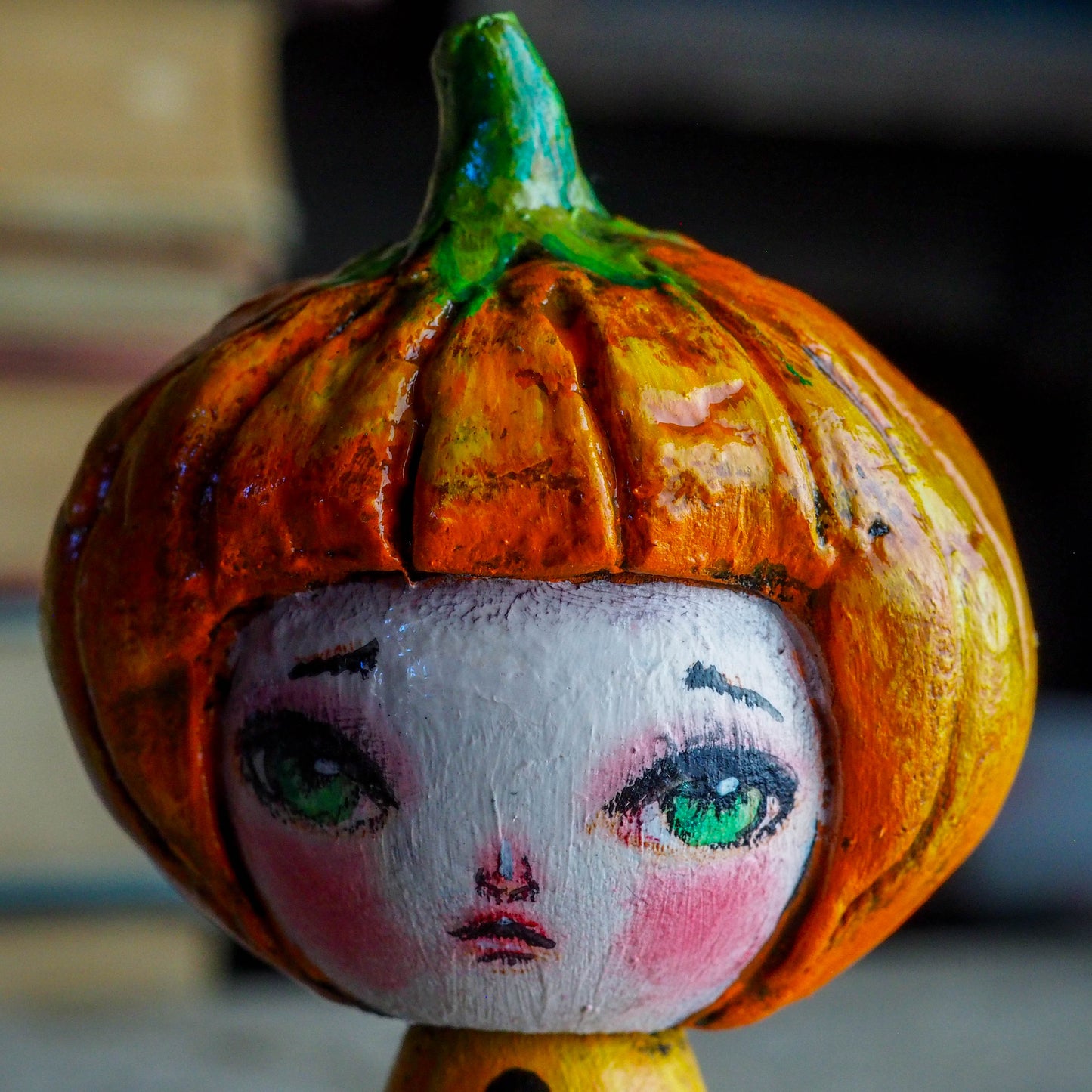 This little pumpkin girl started out like a wooden peg doll, hand painted and sculpted with air clay to turn her into a a beautiful girl with a pumpkin in her head. A jack-o-lantern in her hands and beautiful eyes on her face.