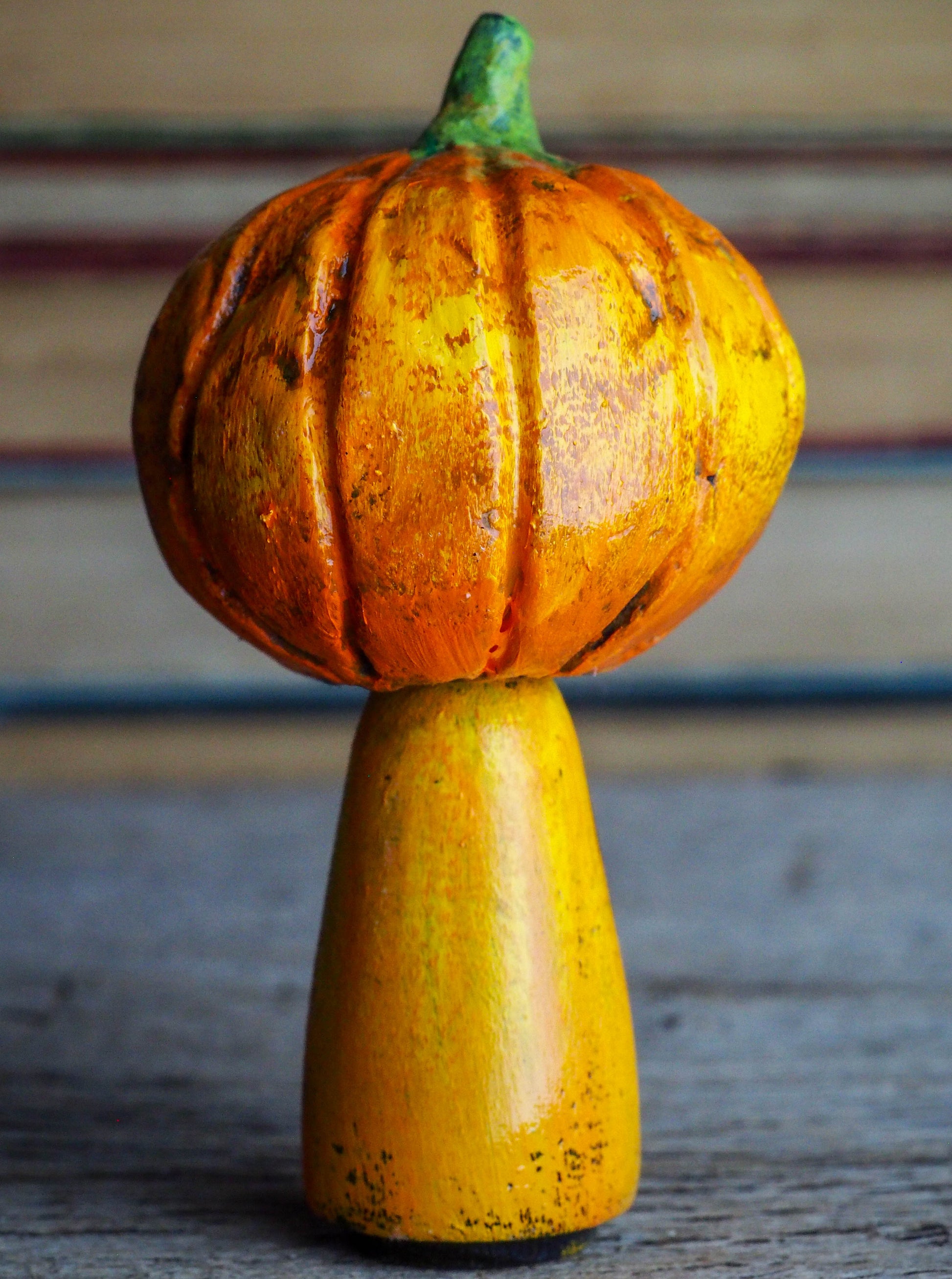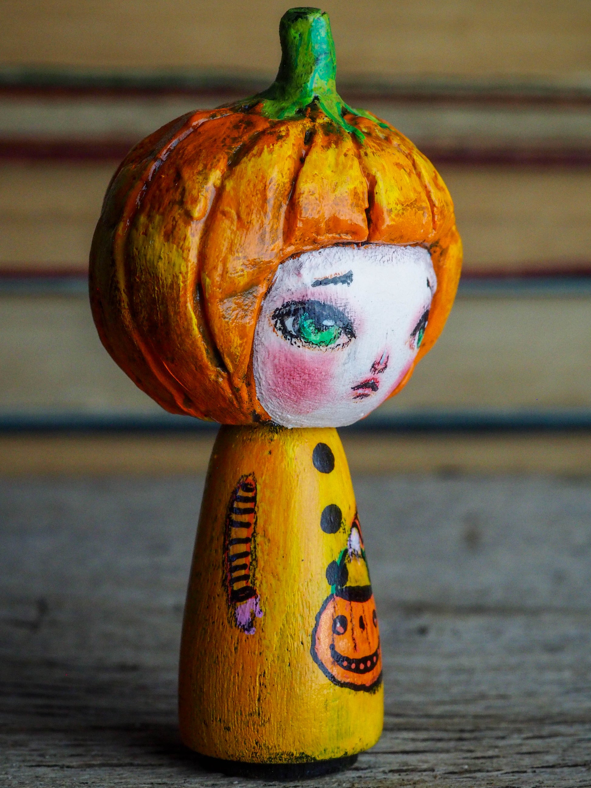 THE PUMPKIN GIRL - Halloween minifig, A Kokeshi wood peg doll handmade by Danita