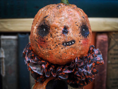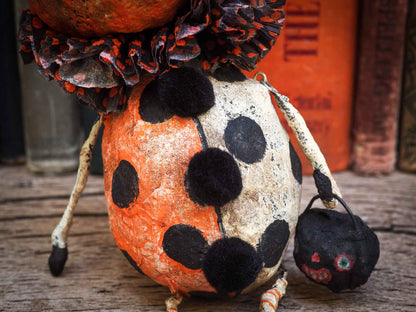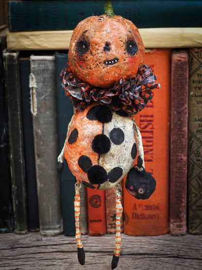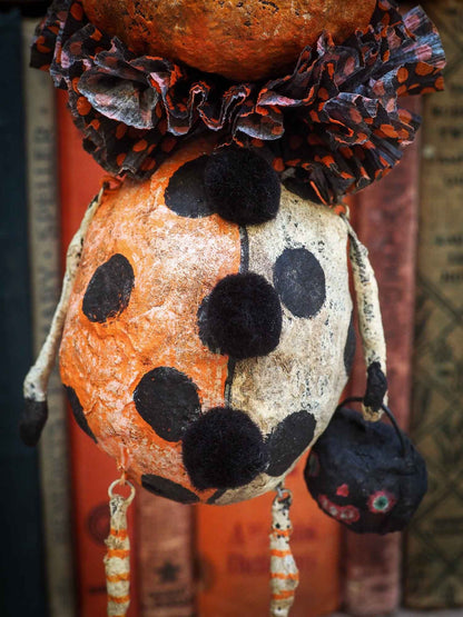 The Halloween art doll has a jack-o-lantern on it's hand and it can be displayed sitting on a shelf, or hanging as an ornament from your Halloween or Christmas tree.