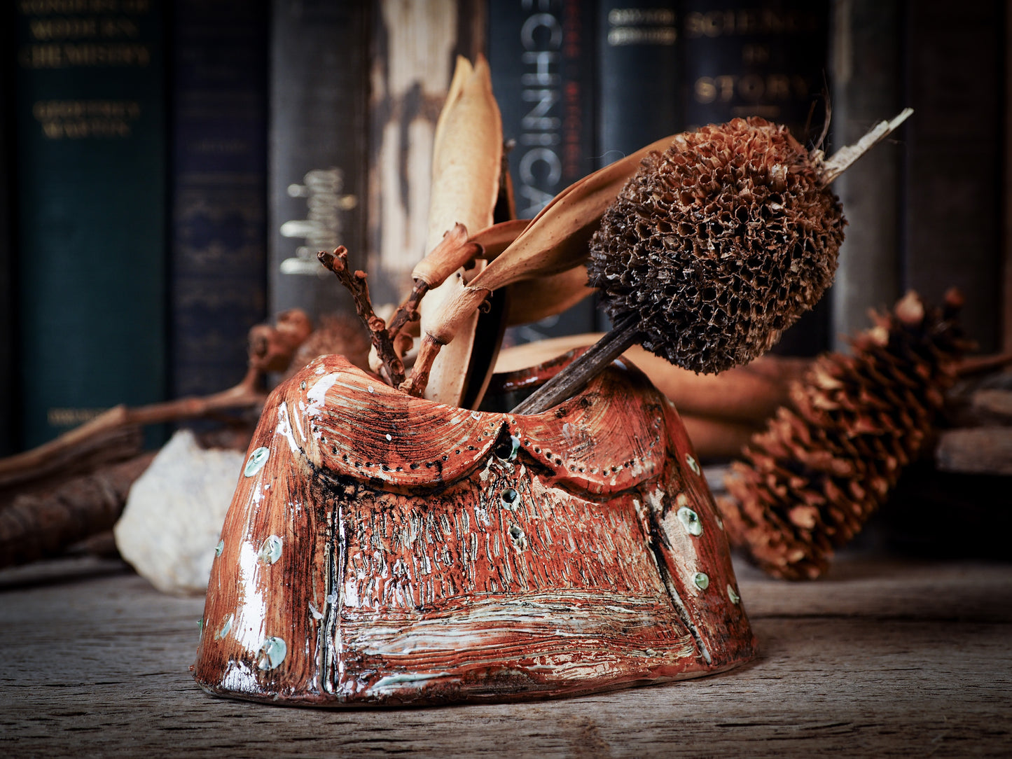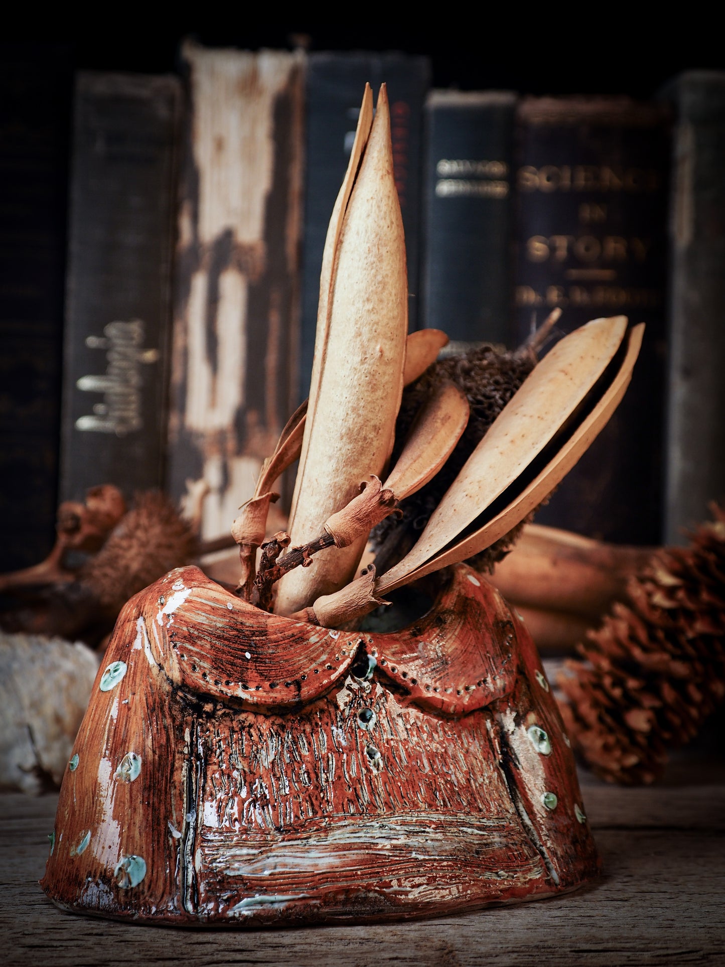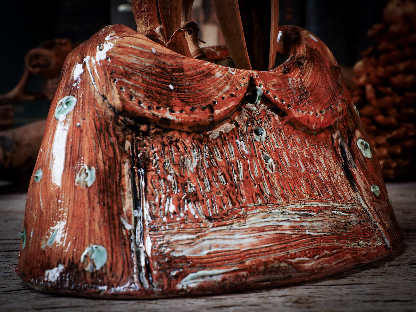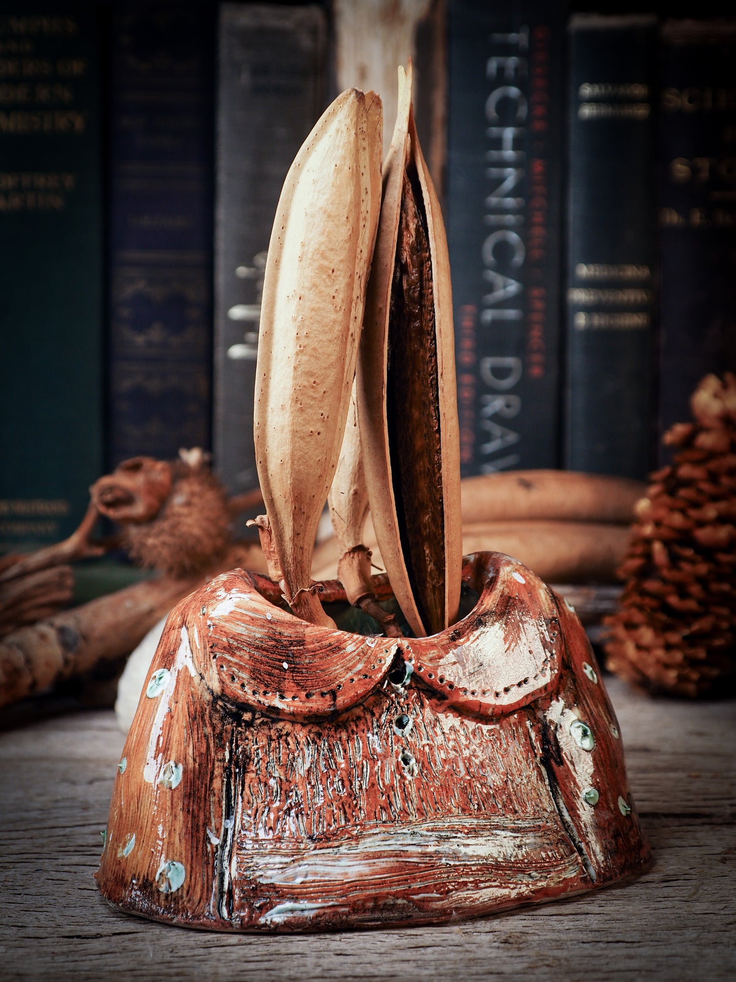 Using hand pinching techniques to create one of a kind fire glazed ceramics, I sculpted vintage blouses like the ones I like to wear when I go to a fancy dinner or an elegant party, made them hollow so they can hold flowers, plants, brushes or anything you’d like to keep in them. They will make a beautiful accent in your main dinner table, your special showcase or anywhere you want something beautiful to remind you of family and love.