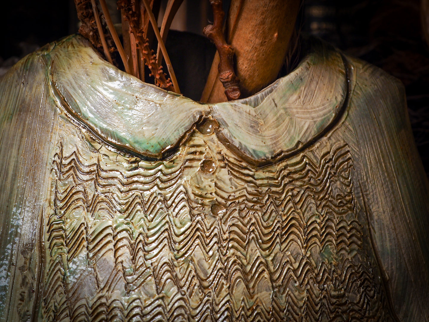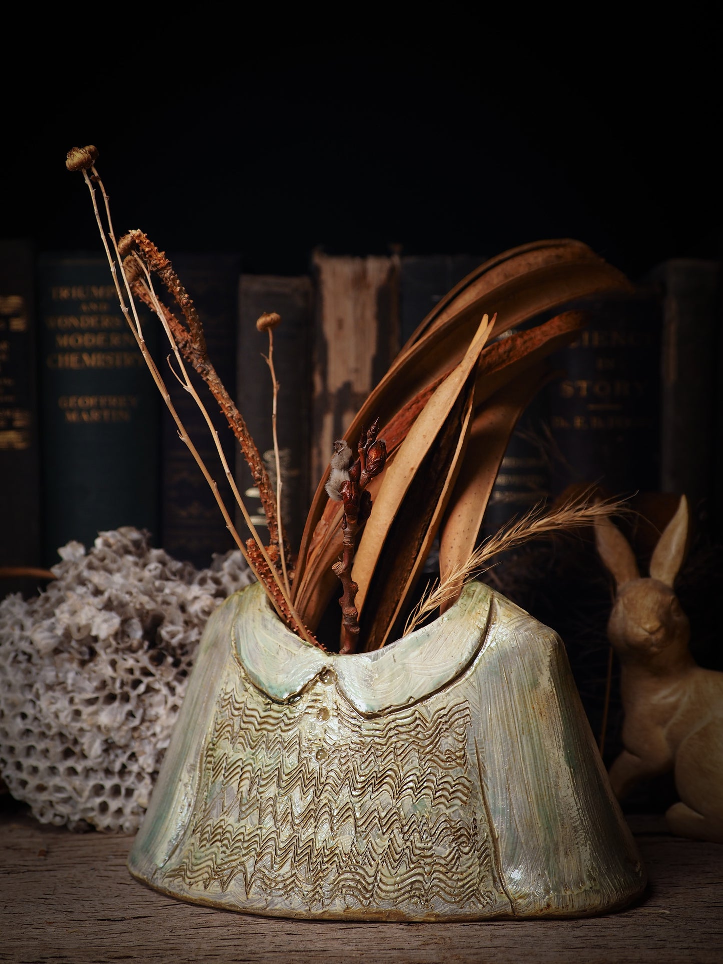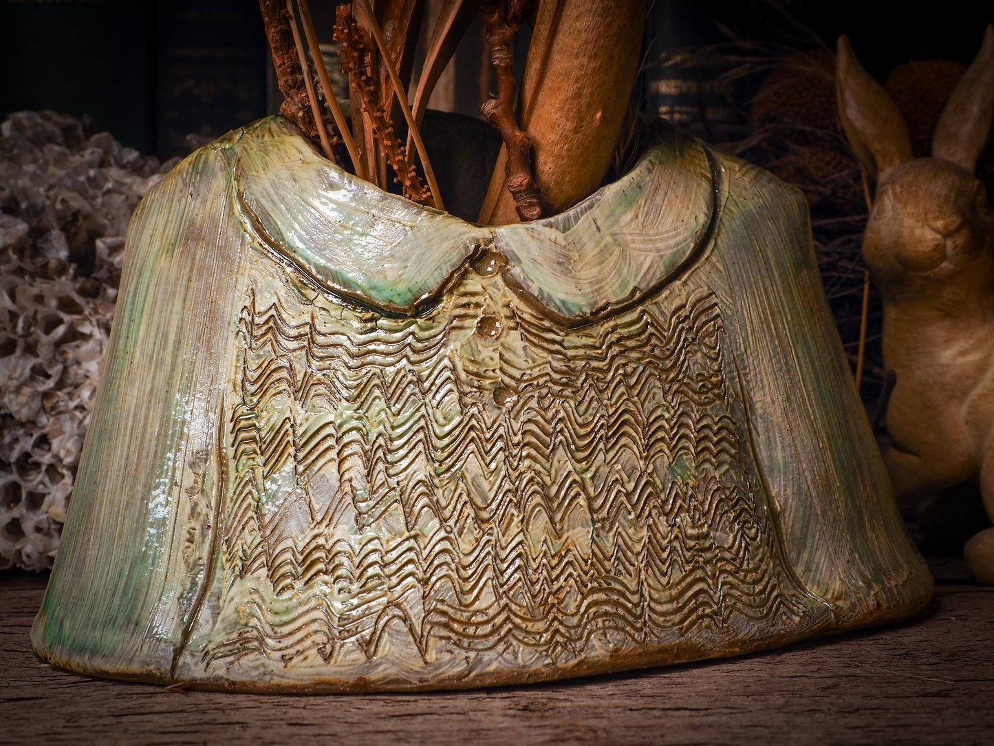 Using hand pinching techniques to create one of a kind fire glazed ceramics, I sculpted vintage blouses like the ones I like to wear when I go to a fancy dinner or an elegant party, made them hollow so they can hold flowers, plants, brushes or anything you’d like to keep in them. They will make a beautiful accent in your main dinner table, your special showcase or anywhere you want something beautiful to remind you of family and love.