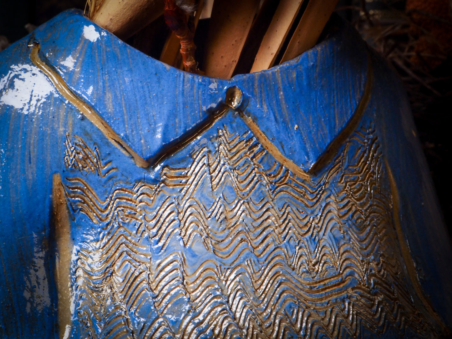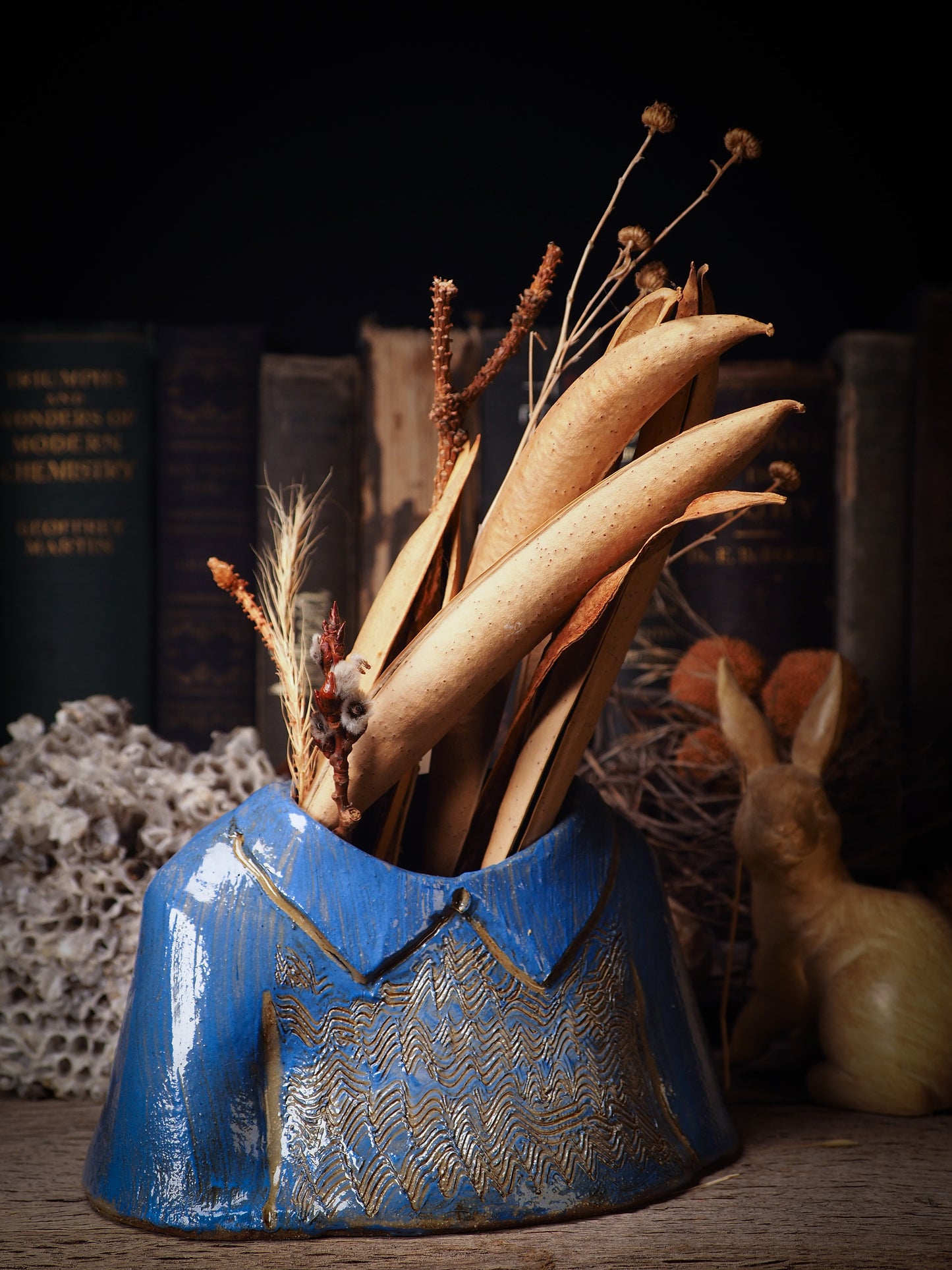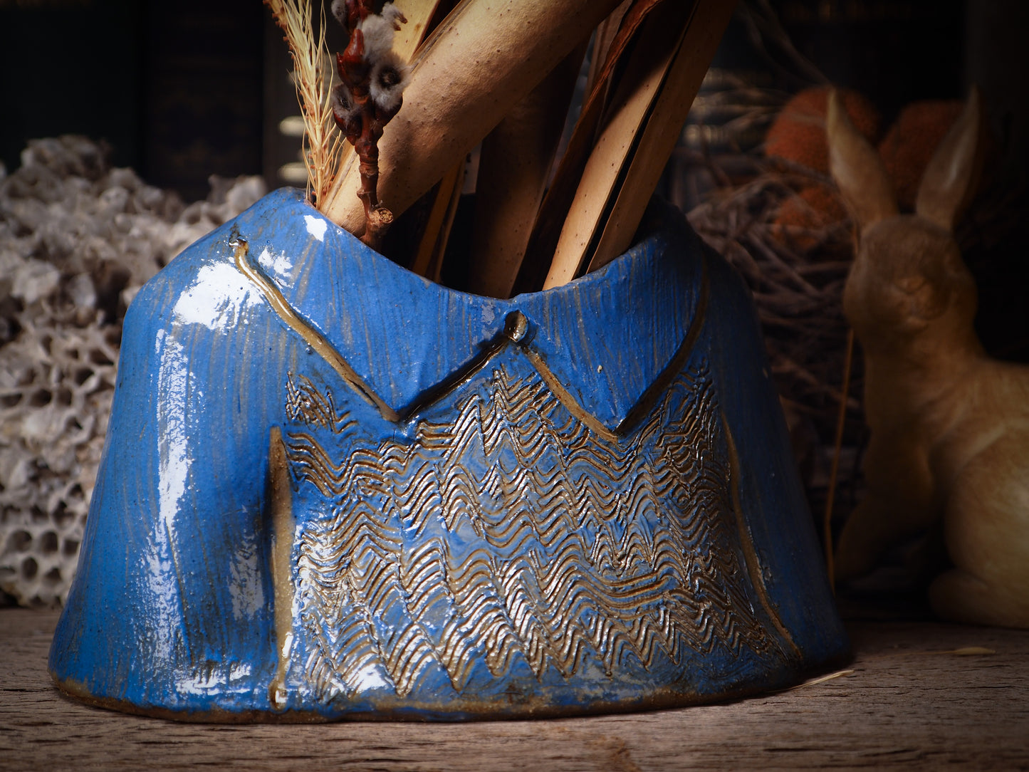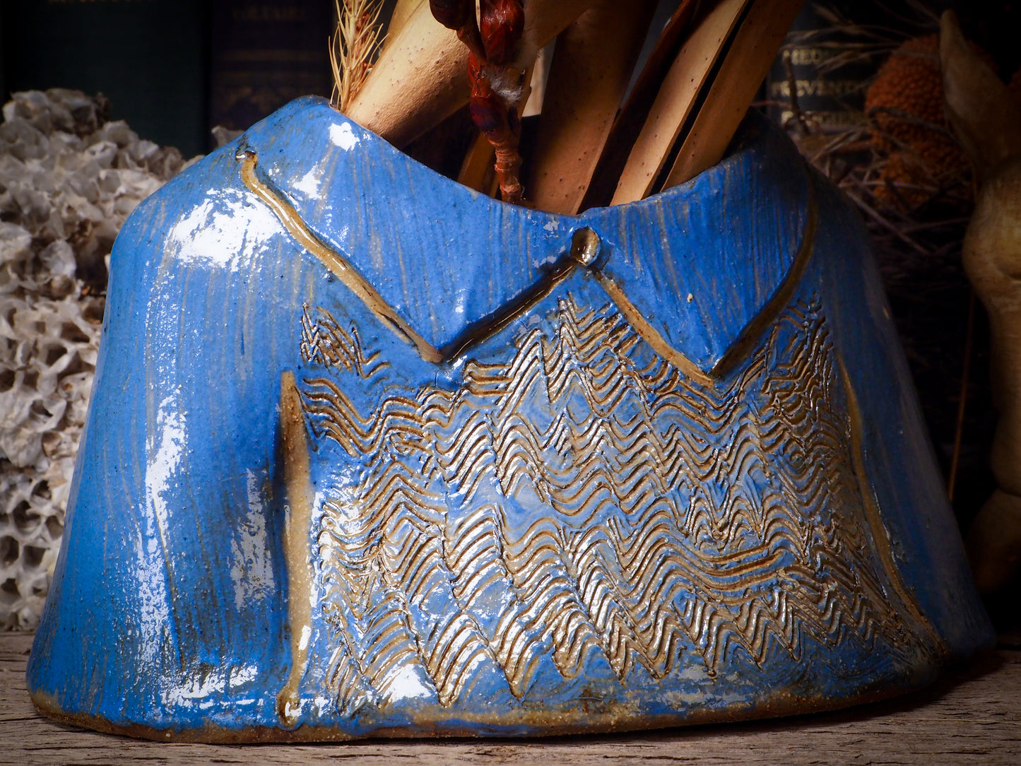 Using hand pinching techniques to create one of a kind fire glazed ceramics, I sculpted vintage blouses like the ones I like to wear when I go to a fancy dinner or an elegant party, made them hollow so they can hold flowers, plants, brushes or anything you’d like to keep in them. They will make a beautiful accent in your main dinner table, your special showcase or anywhere you want something beautiful to remind you of family and love.