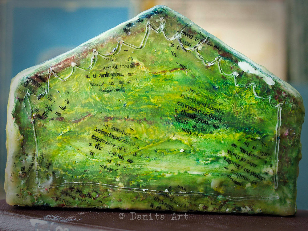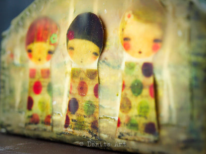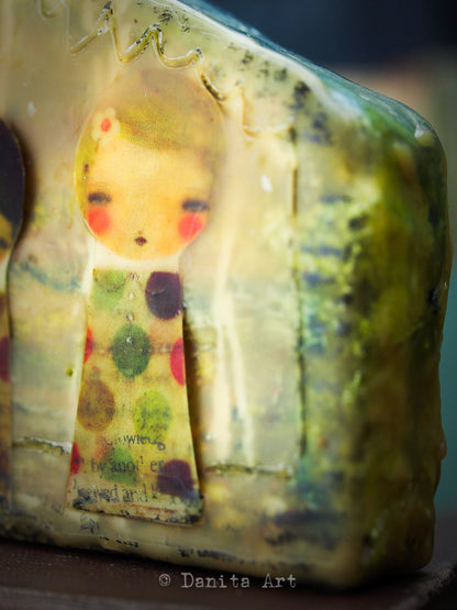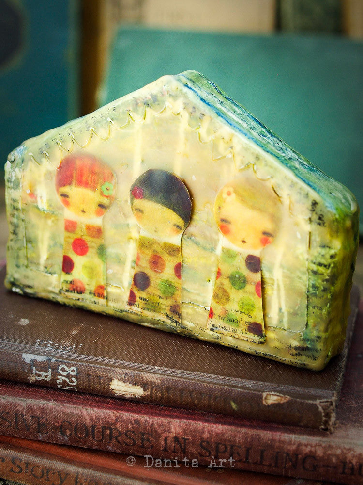 This time, a recurring theme in my art, houses, is what I chose to work just for fun. The little houses have a wooden core that was going to be painted with little decorations, but then as I was going trough my art supplies I found my stash of beeswax and here they are.