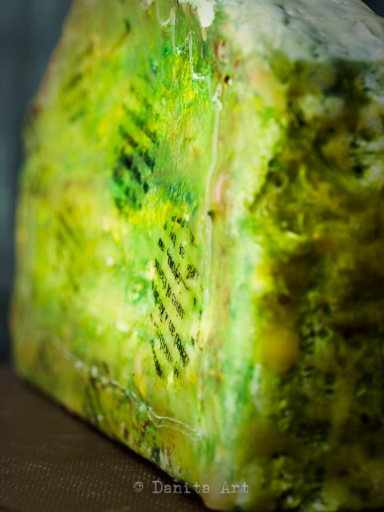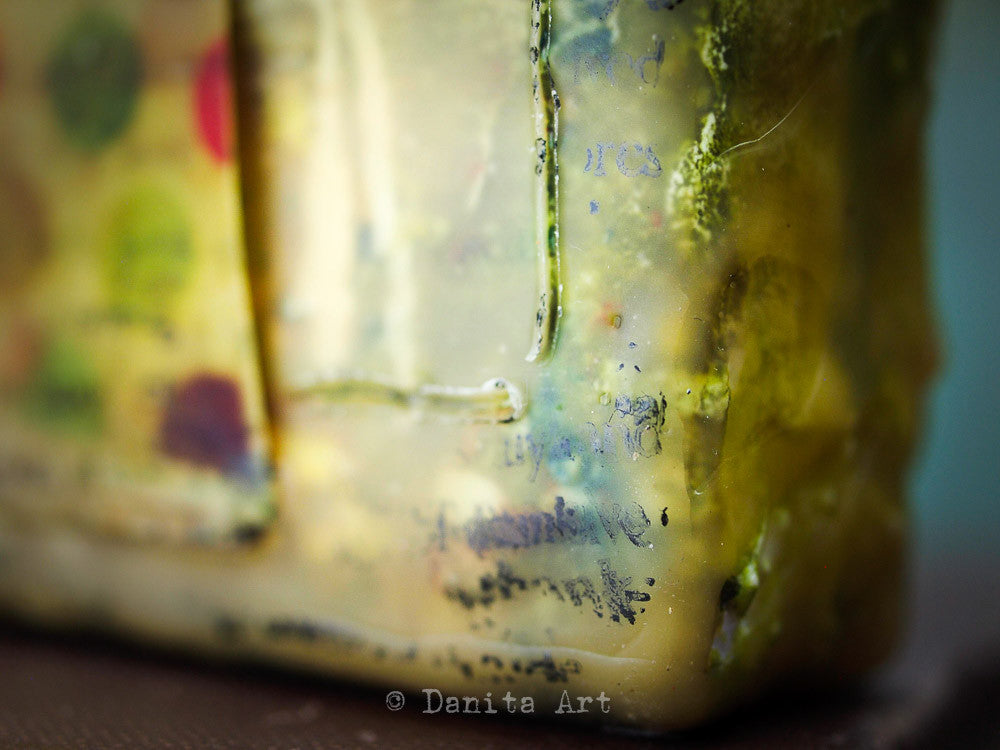 They feature a print of one of my favorite paintings, then I painted an abstract background with bright colors, and to finish everything I dipped them in beeswax and carved some drawings in them.