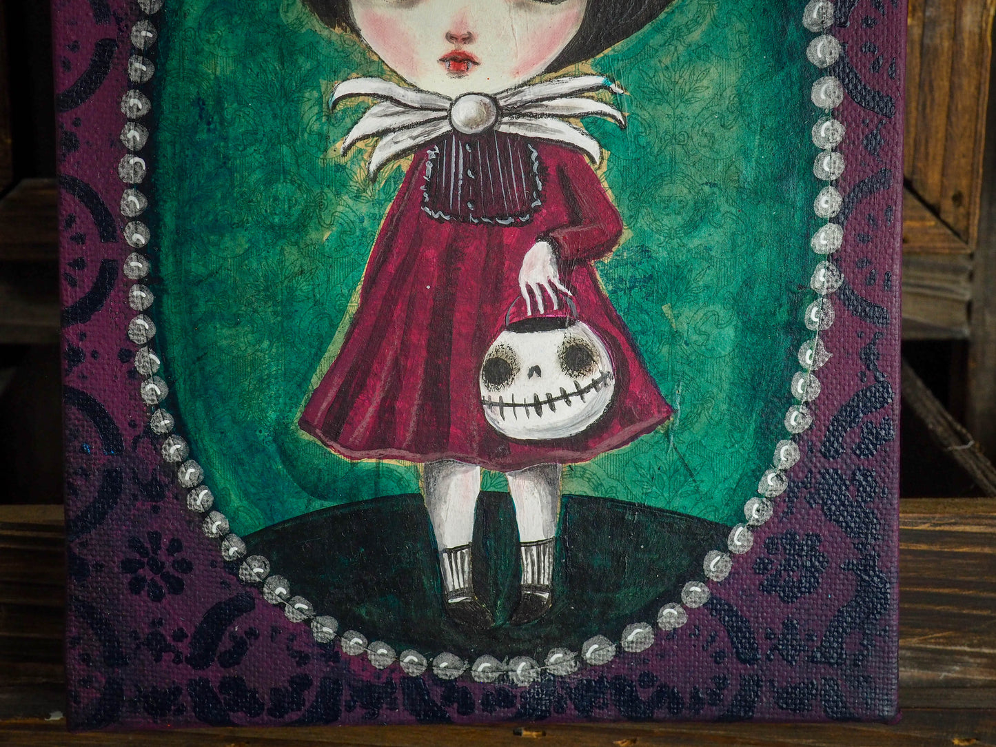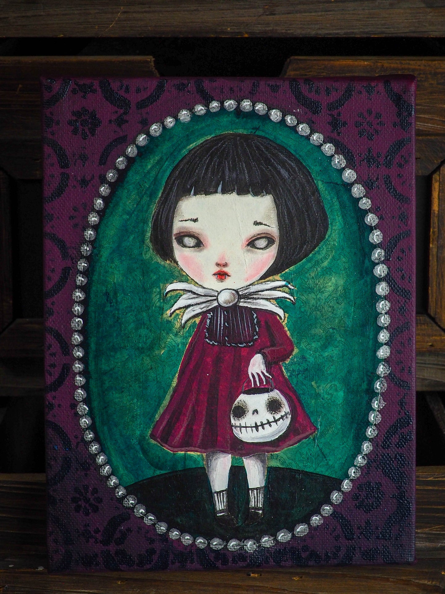 An undead girl is getting ready to go out on Halloween night and trick-or-treat with her zombie friends and her adorable skull jack-o-lantern pumpkin on this whimsical pop surreal original painting by Danita.